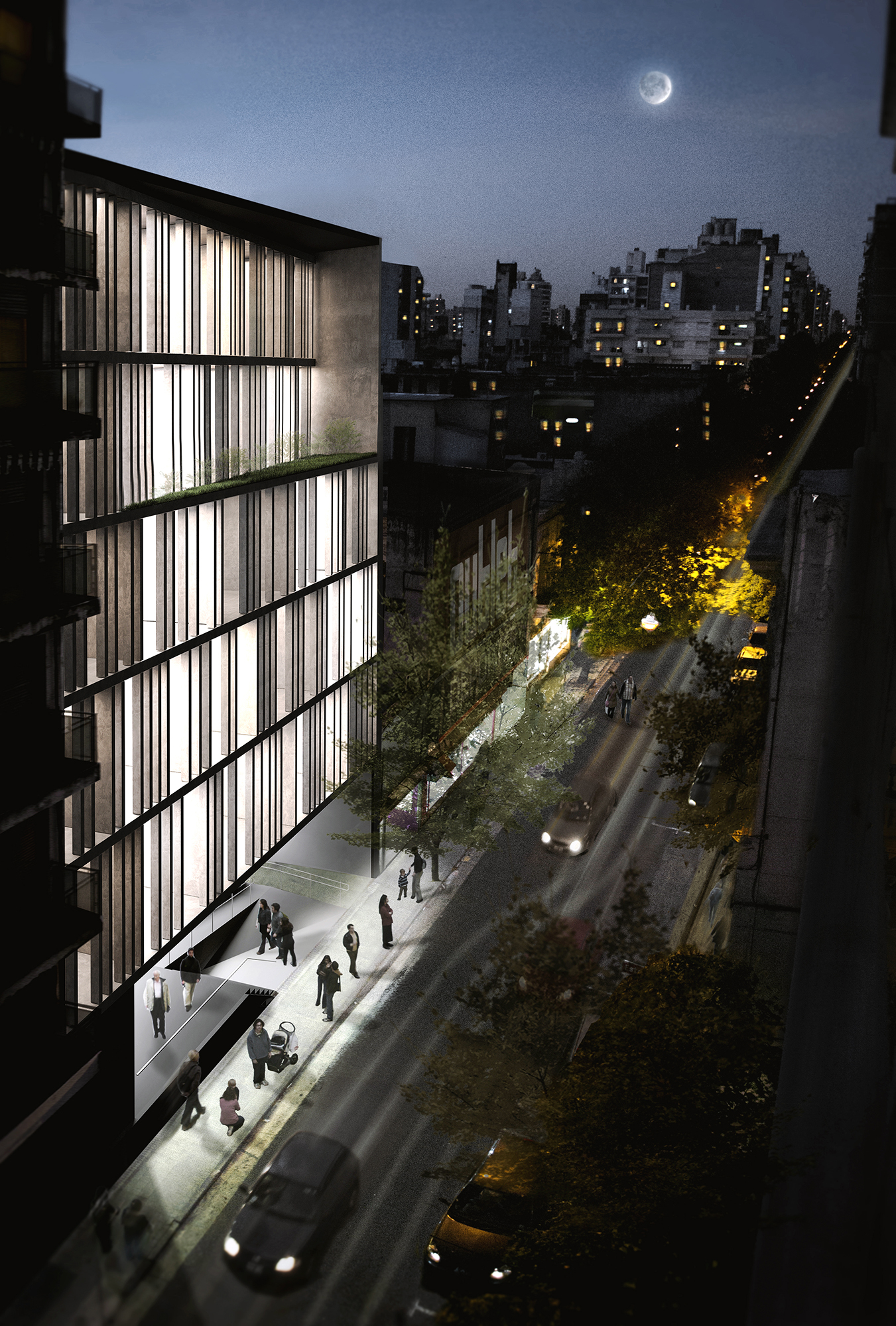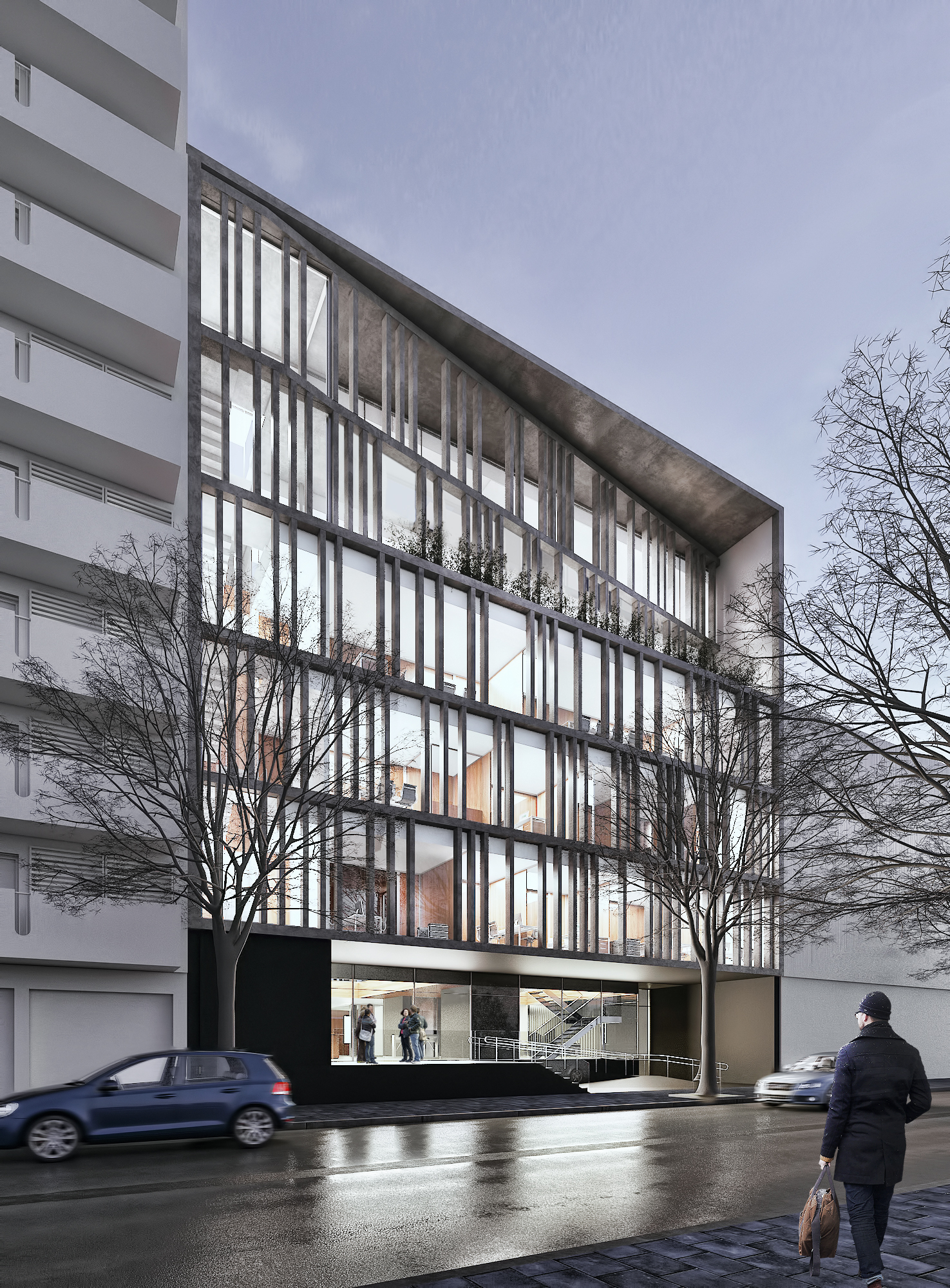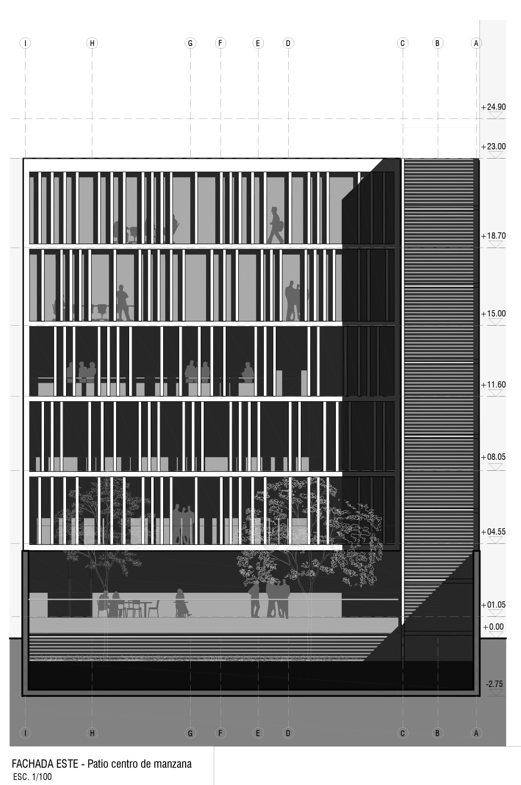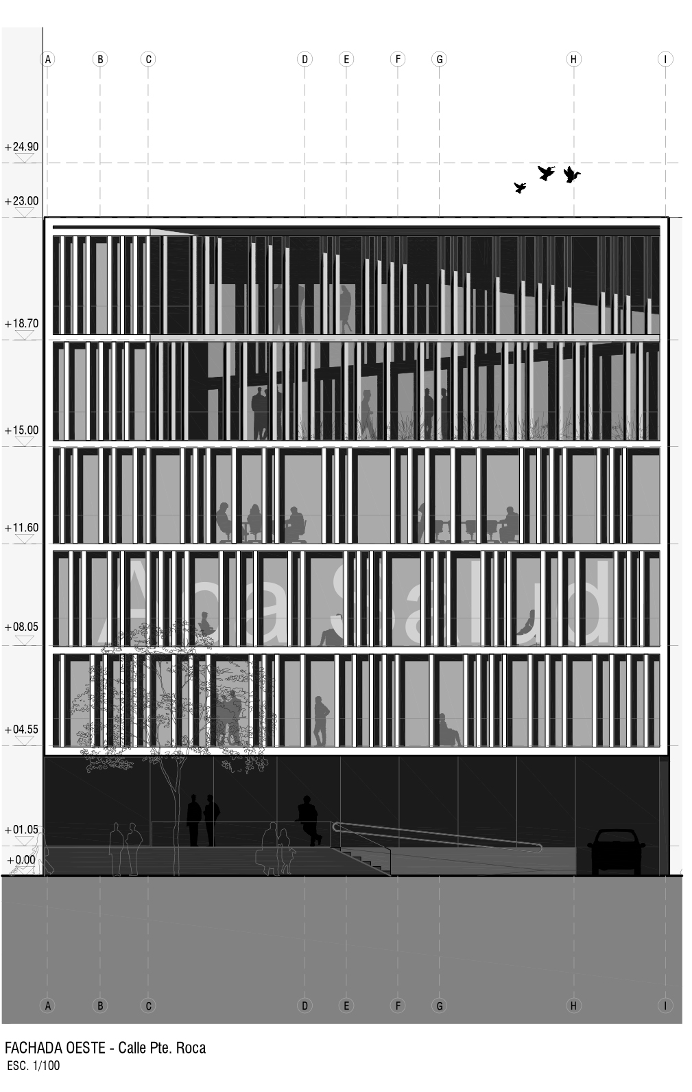 Mediante la aplicación de un programa paramétrico se diseñó una pantalla con una grilla de hormigón armado que define básicamente la imagen del edificio como un todo y anula la interpretación disociada de frente y contrafrente. Condición que se acentúa al mantener el mismo encuentro con el suelo en ambas orientaciones este y oeste: la pantalla se interrumpe y el vacío establece la relación interior-exterior.