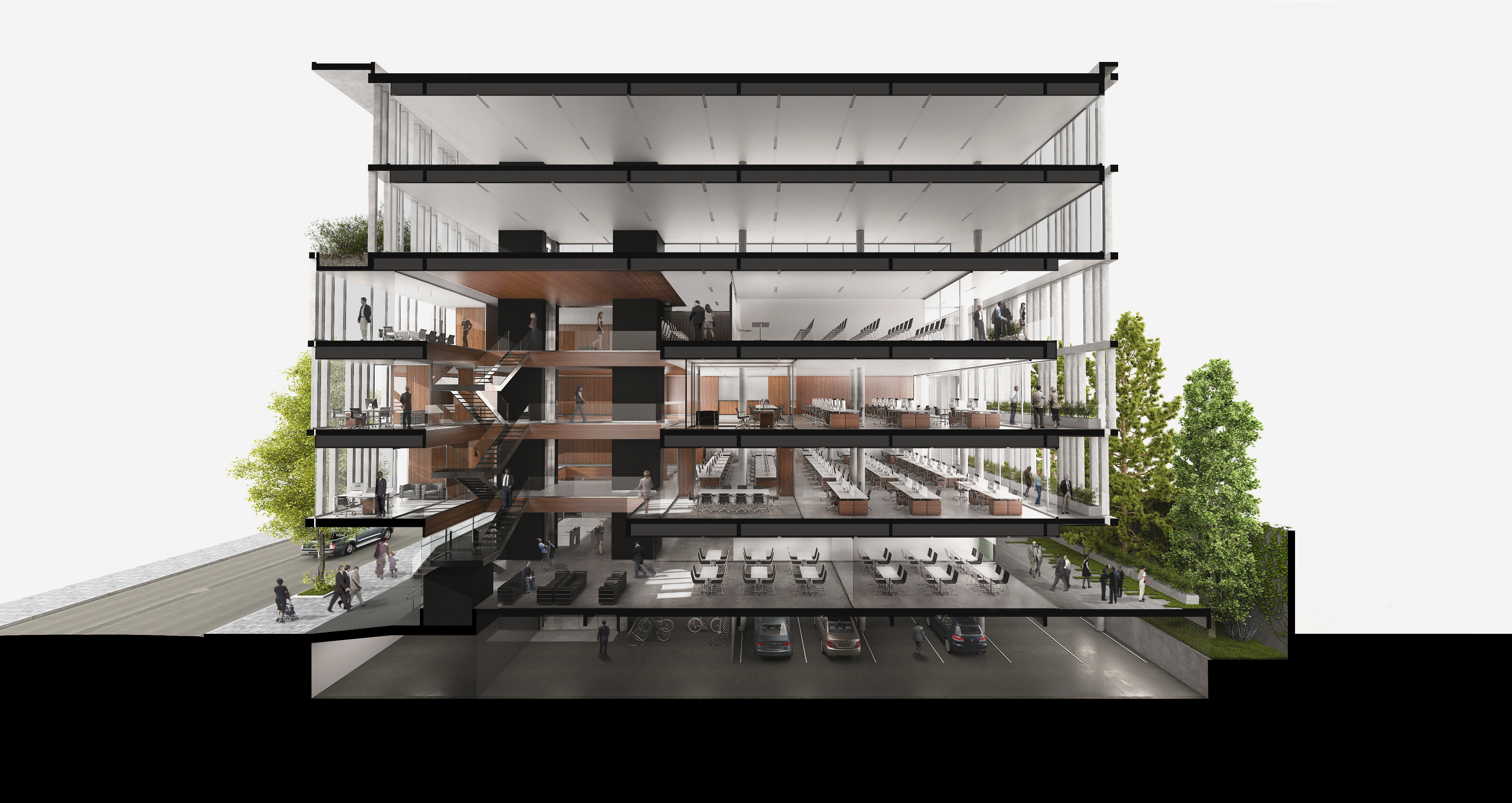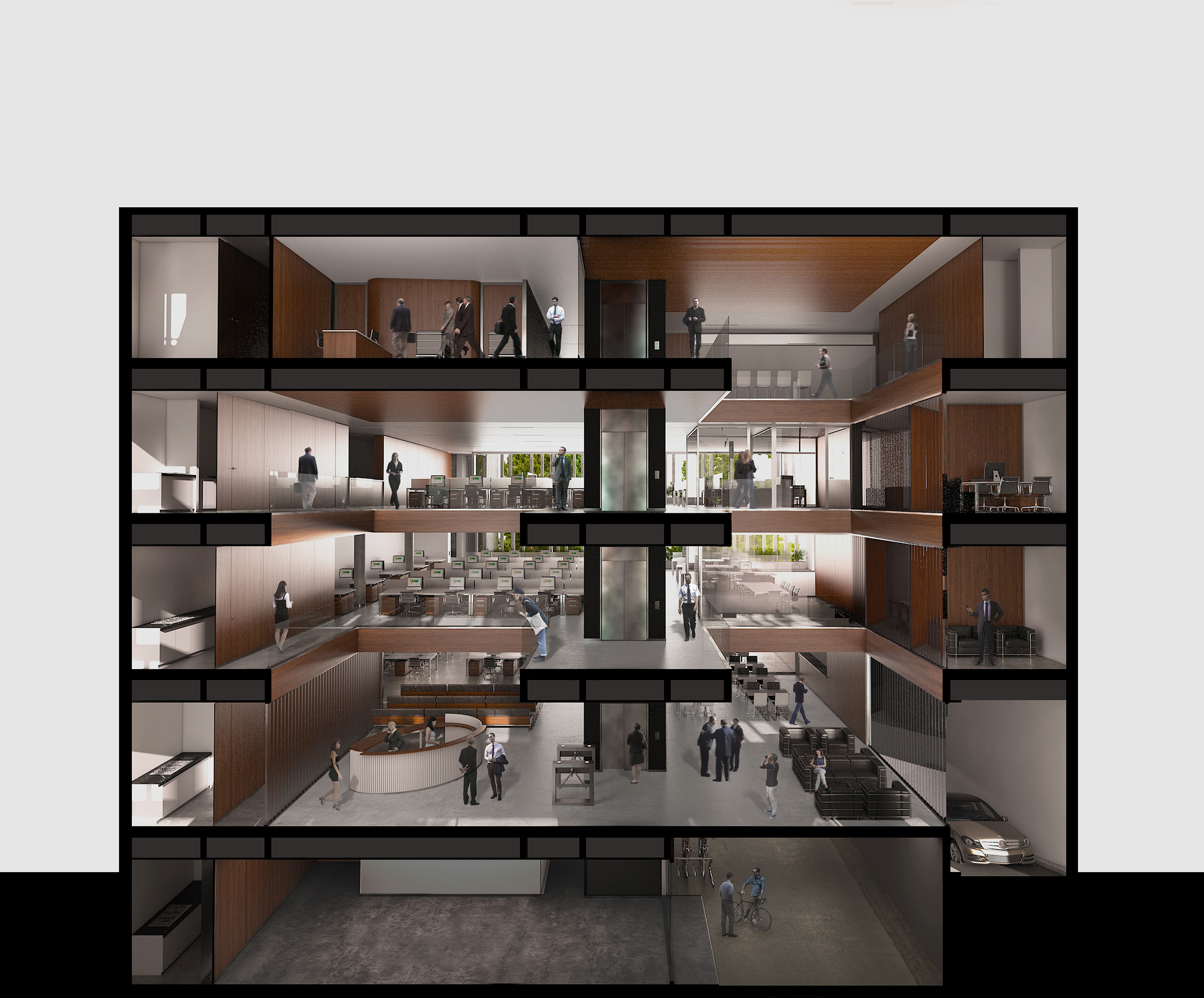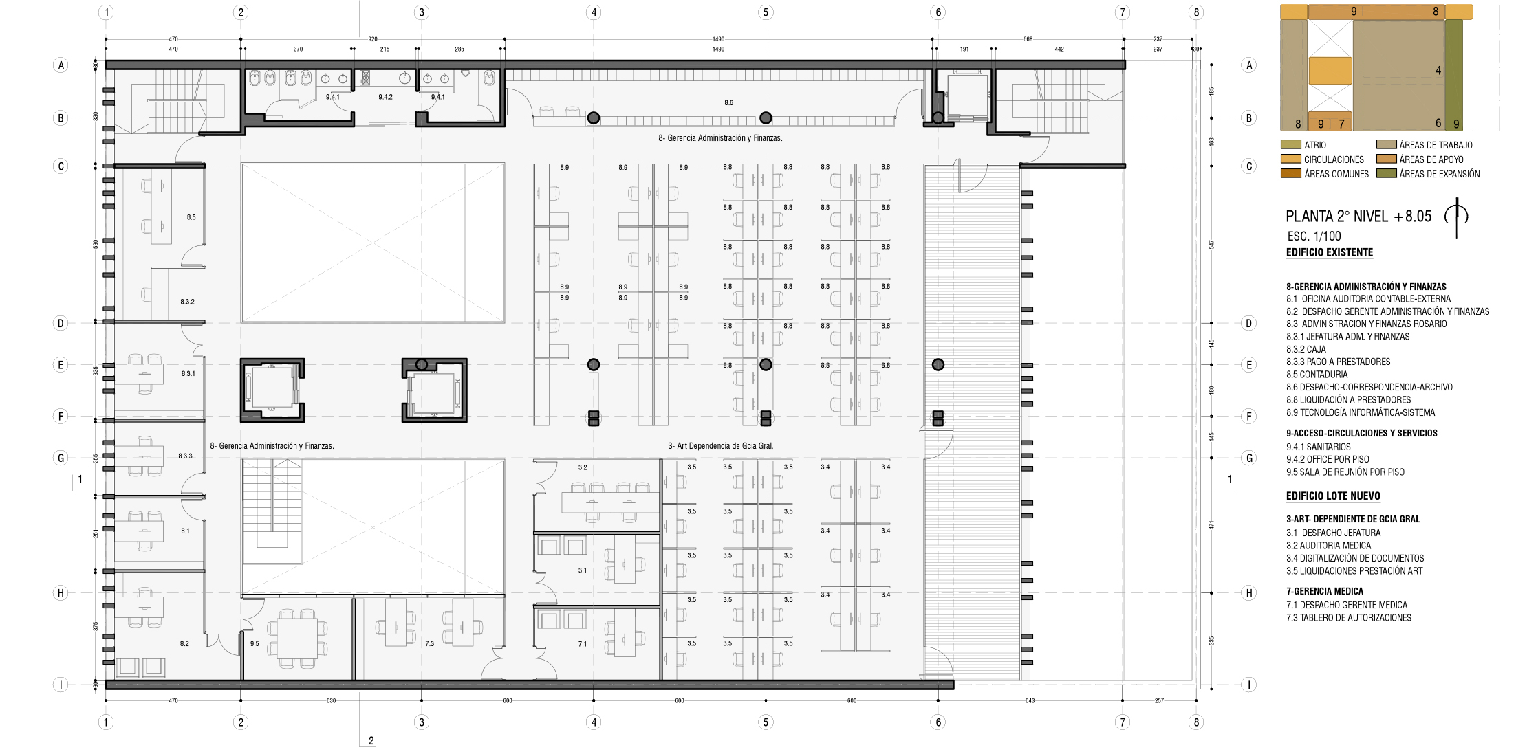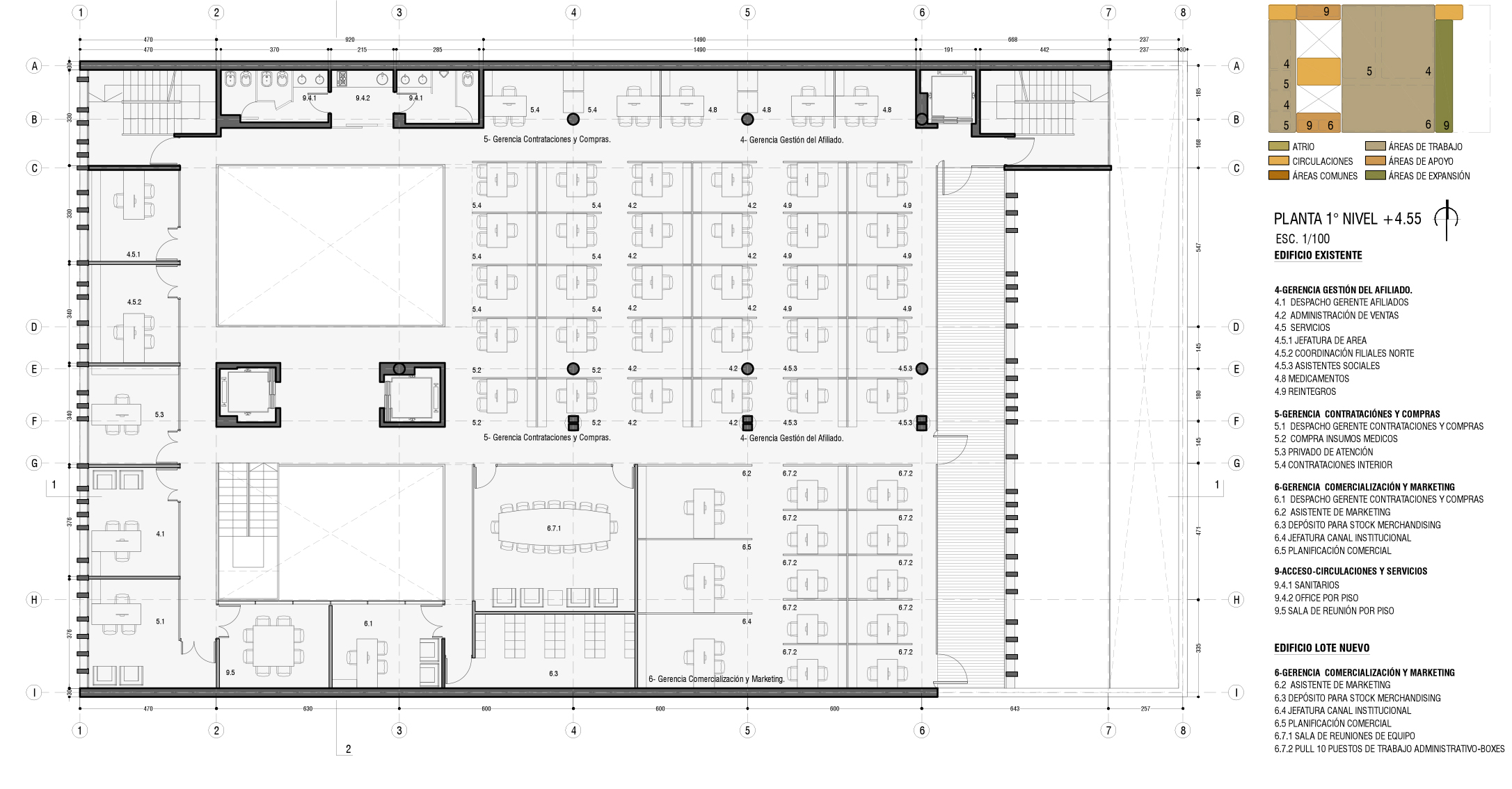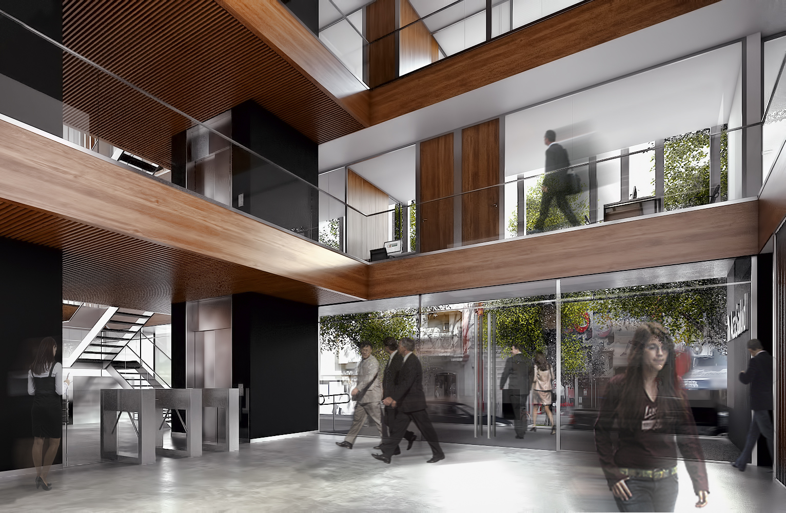 En tanto, la independencia de estos dos sectores no atenta contra la idea de conjunto gracias al espacio central de múltiples alturas que los articula con una marcada continuidad espacial en horizontal y vertical, favorecido por la concentración de las áreas de servicios (baños y office) recostadas en las medianeras como apoyos laterales a las áreas exclusivas de trabajo.