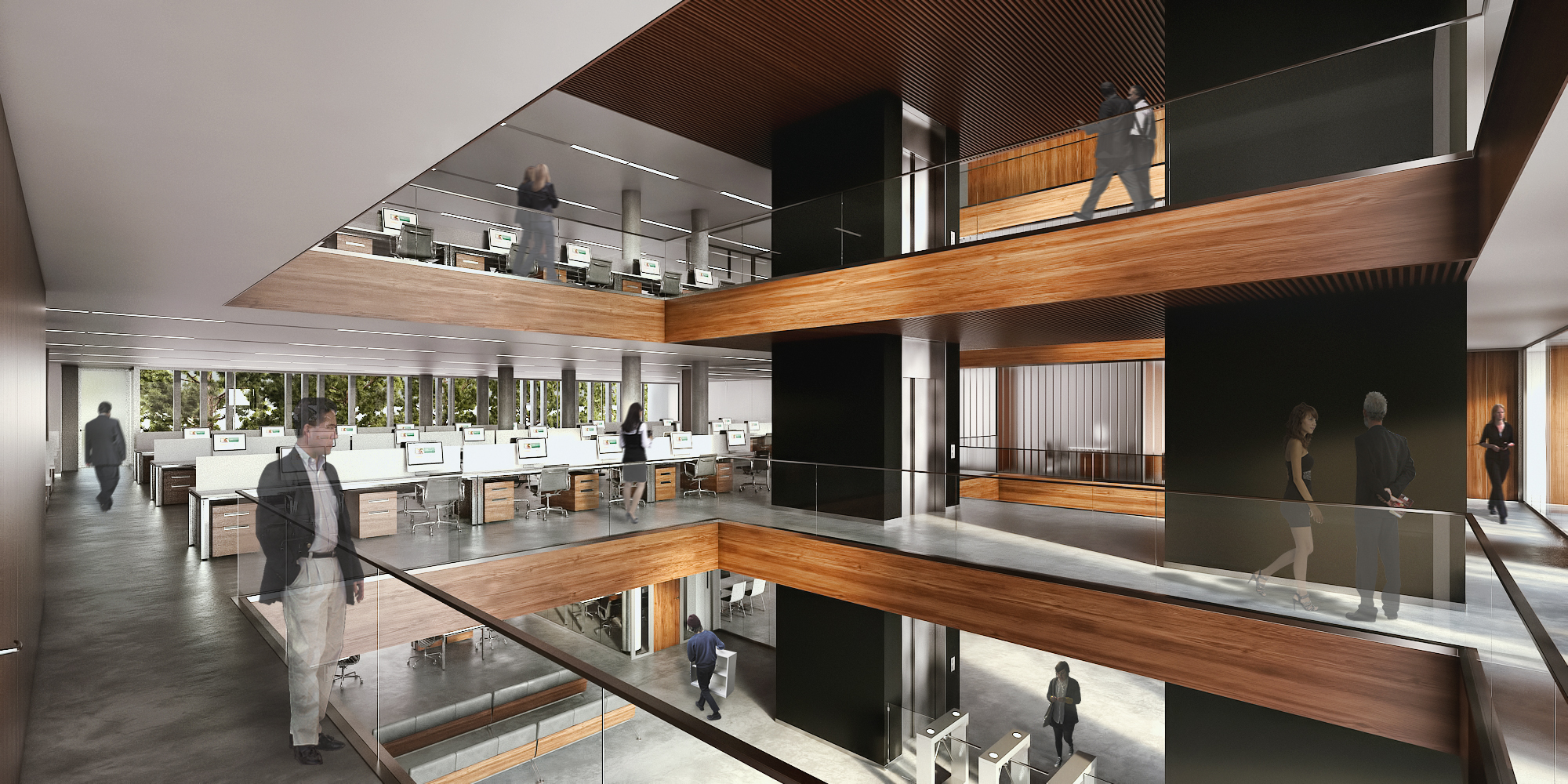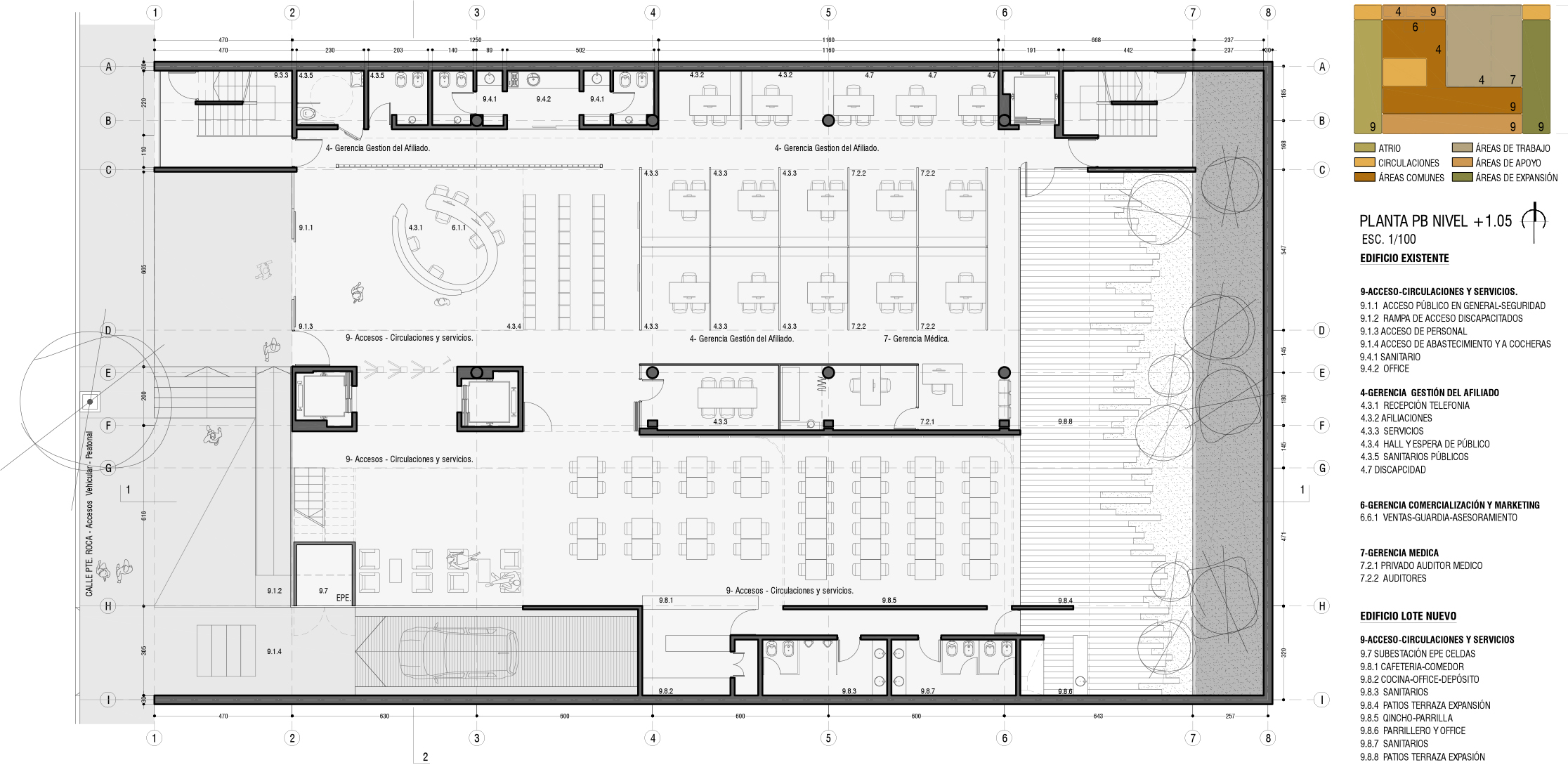 Con el completamiento del retiro de línea de edificación se consiguió alojar, con criterio celular y frente a la calle Pte. Roca, las oficinas de gerentes, directivos y salas de reuniones; mientras que, aplicando el recurso de planta libre se logró, con alto grado de flexibilidad, cumplir con la disposición de los puestos de trabajos correspondientes a las áreas abiertas de cada gerencia; y relacionarlas con un patio del total del contrafrente disponible y expansiones que se brindan al mismo. Se asegura así la habitabilidad en el interior con adecuada iluminación natural y ventilación cruzada.