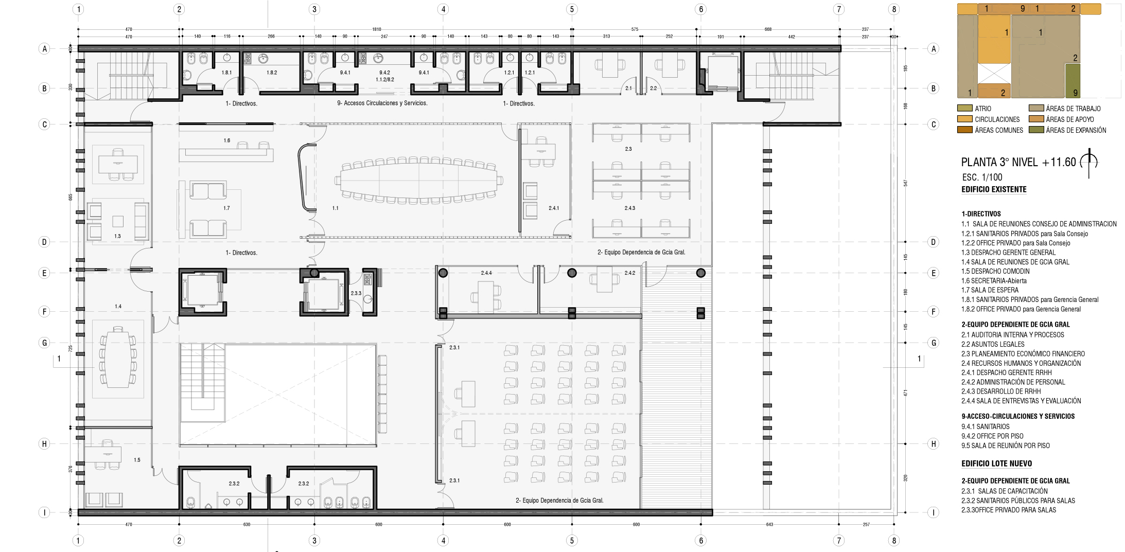 El uso intensivo del edificio existente, remodelado y ampliado; la clara clasificación de funciones separando la más privadas de las generales del personal; y la concentración de los sectores u oficinas sugeridas por la promotora en el terreno lindero fueron las premisas fundamentales para la organización del programa de necesidades.