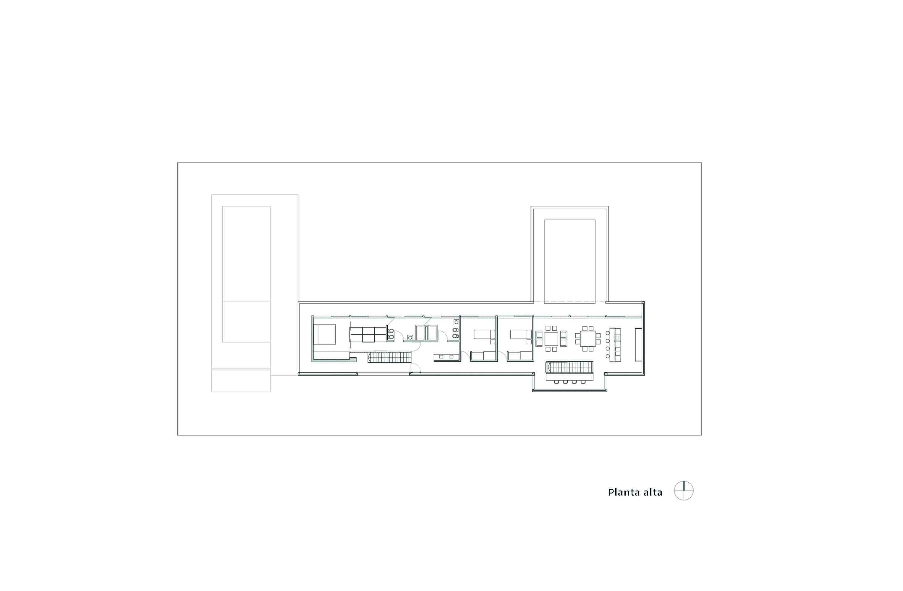 En planta alta, nivel donde se desarrolló propiamente el programa básico de la vivienda –sala de estar, comedor, cocina y habitaciones- fue la expansión a una gran terraza-mirador la que acentuó la relación de la arquitectura con el paisaje.