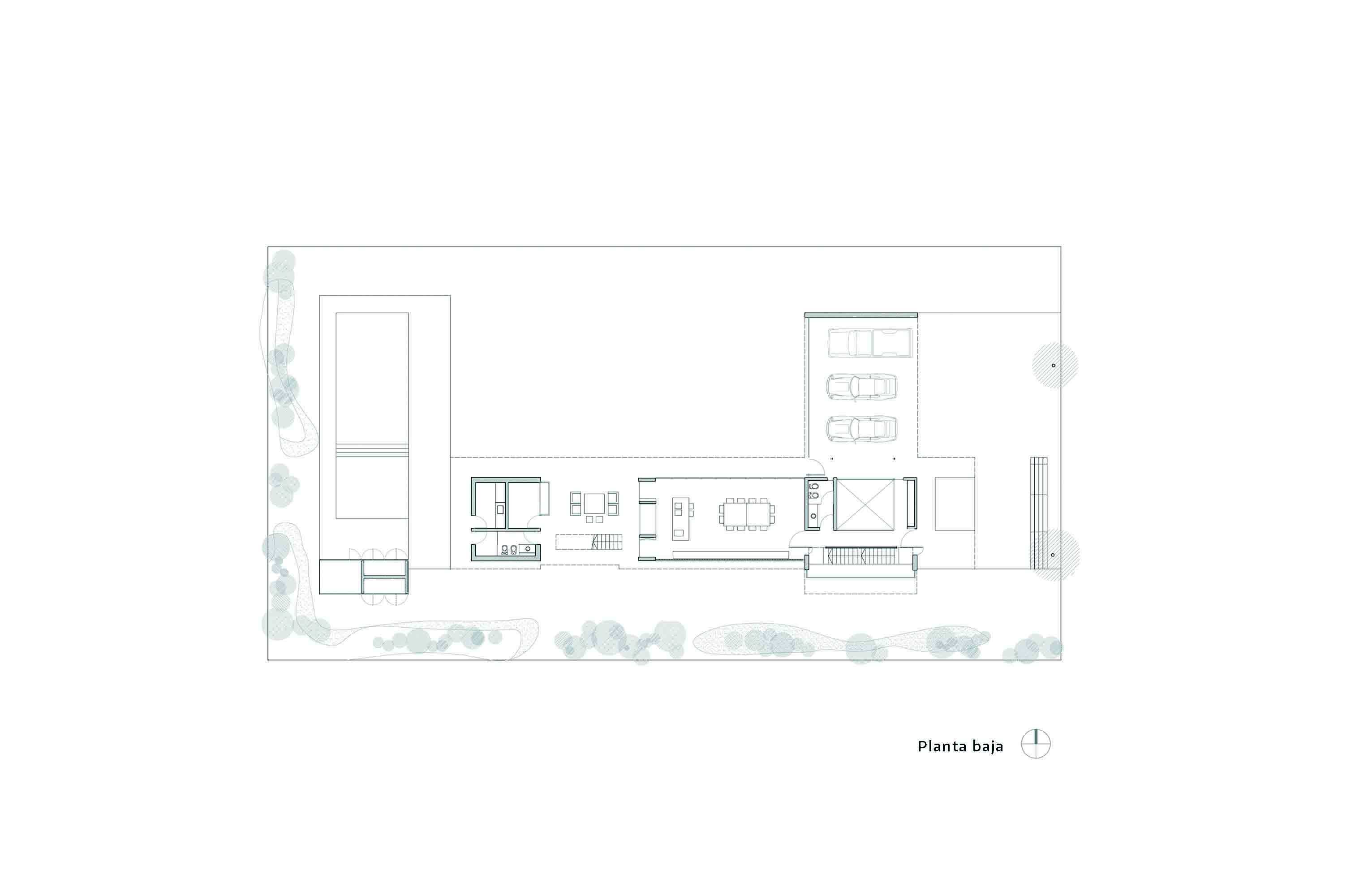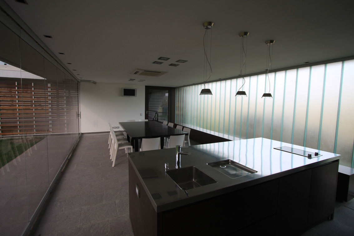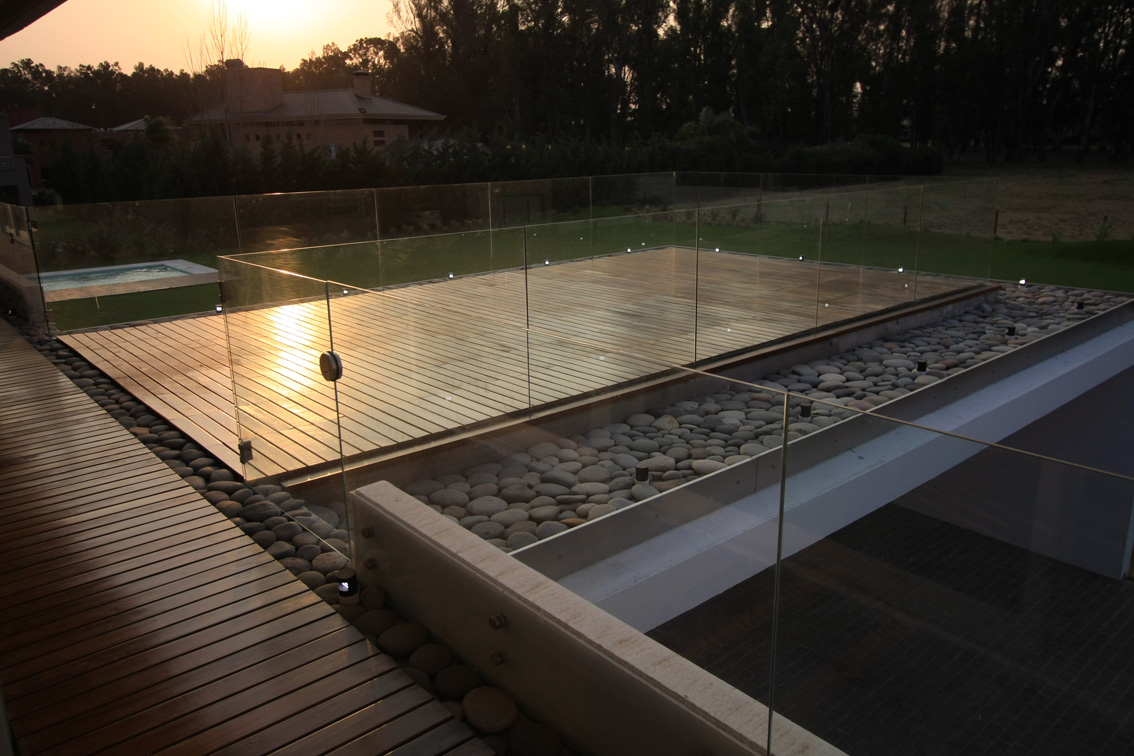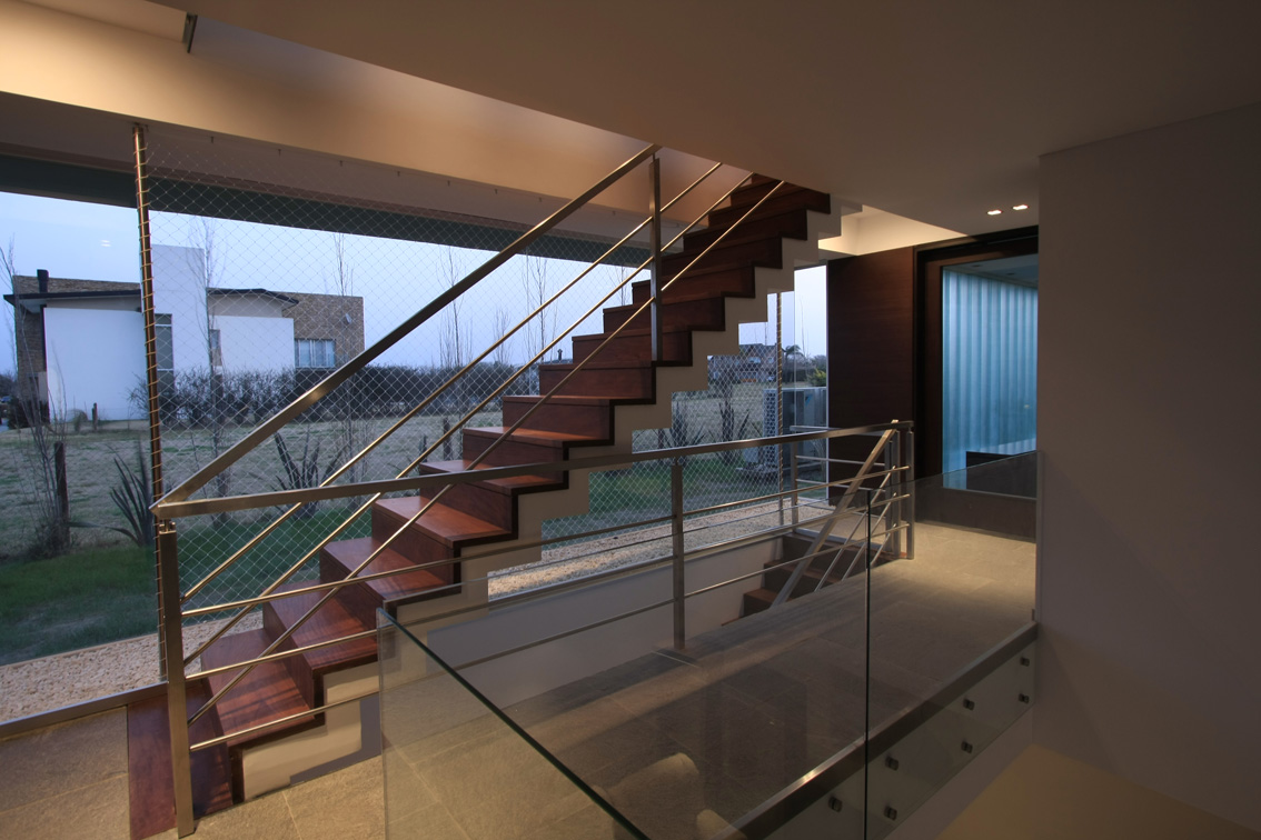 Es así que la vivienda se concibió con el deseo de aprovechar las mejores orientaciones y visuales, abriéndose al norte y concentrando las perspectivas hacia la hilera de añosos eucaliptos, principal referente de la geografía del lugar; buscando una íntima relación interior-exterior, a través de grandes aberturas de vidrio. Para enfatizar el diálogo con la naturaleza, en planta baja -principal área social de la casa- estas aberturas se pueden plegar en su totalidad, transformándose en un “gran espacio intermedio” provisto de un importante asador, espacio propio de la cultura pampeana argentina.