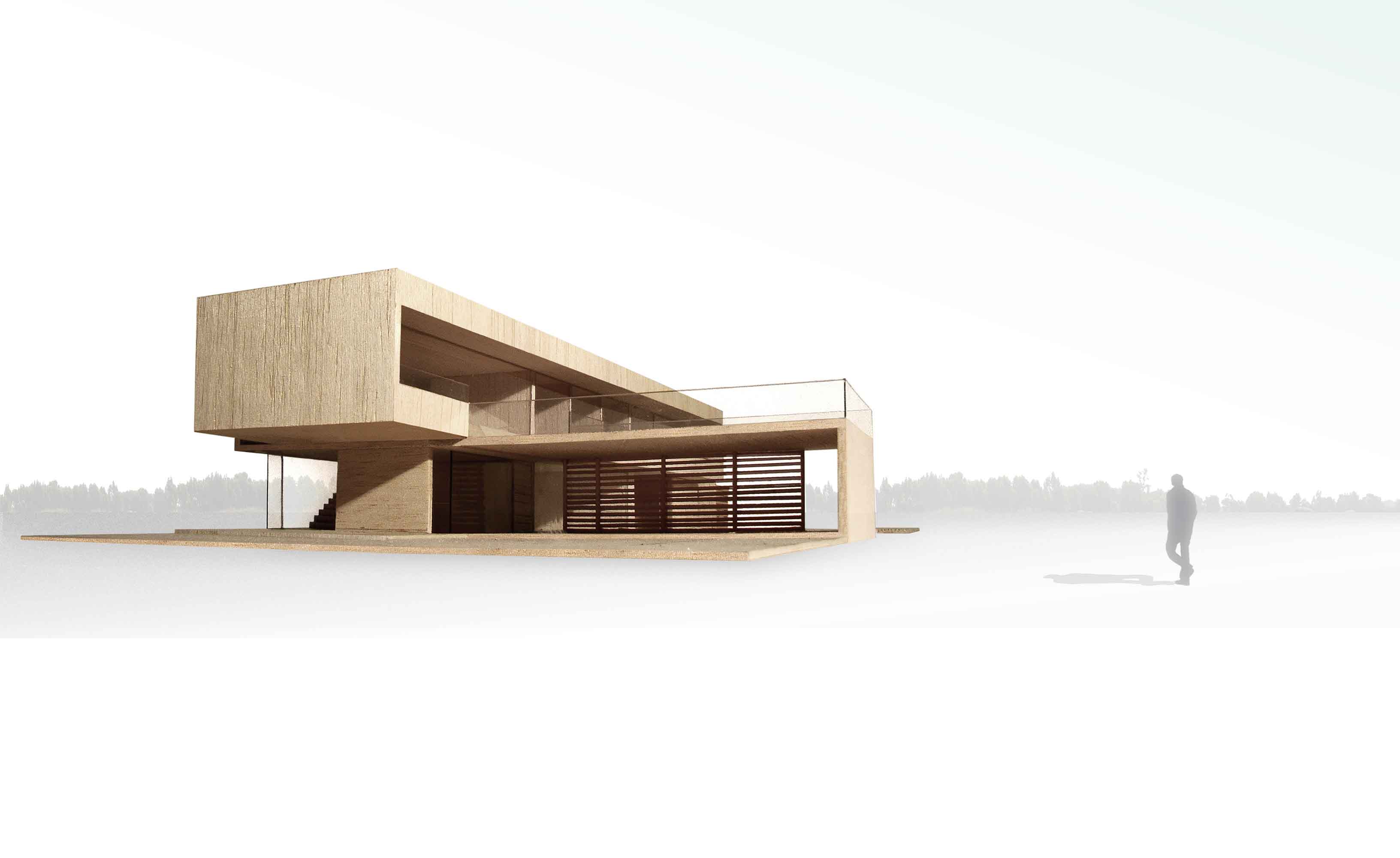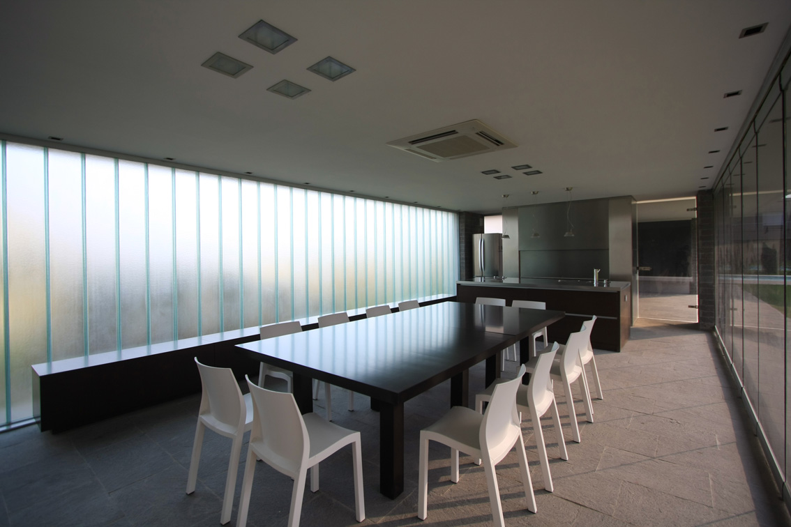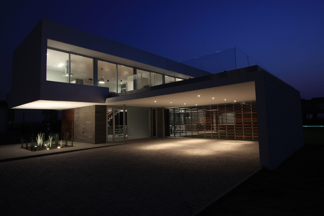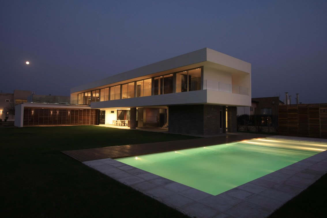 La estrategia de ubicar la vivienda en un solo lote de los dos que integraban el terreno ubicado dentro de un club de campo del litoral argentino, la forma alargada de la parcela individual y el uso alternativo de la casa entre fines de semana y temporada de verano, condicionaron fuertemente la morfología, los volúmenes y la organización de los espacios interiores de la casa proyectada para un matrimonio con dos hijas pequeñas.