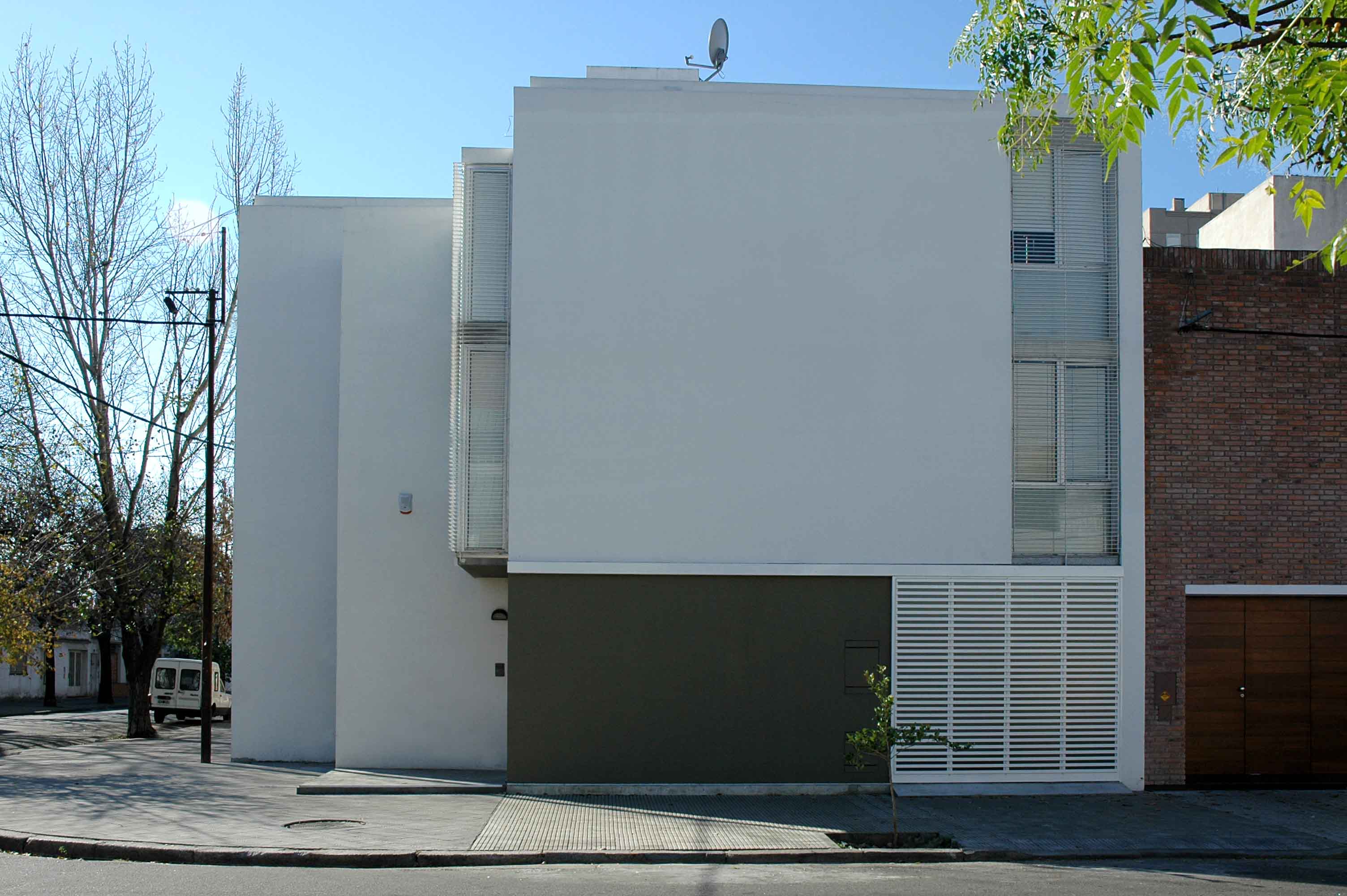 Por tal motivo, la imagen de conjunto se acentuó respetando las alturas promedio del entorno con el propósito de reforzar la escala barrial del área de emplazamiento tomando como referente el volumen edilicio existente hacia el norte –perteneciente a las oficinas de una constructora-; y se complementó, con la interpretación de la materialidad como condicionante de la arquitectura: el material de frente blanco definió la envolvente del proyecto en sintonía con la imagen racionalista que caracteriza la arquitectura rosarina desde los tiempos en que “las catedrales eran blancas”.