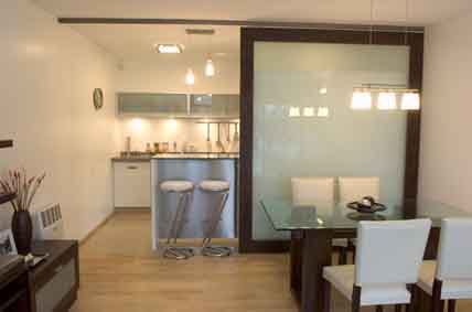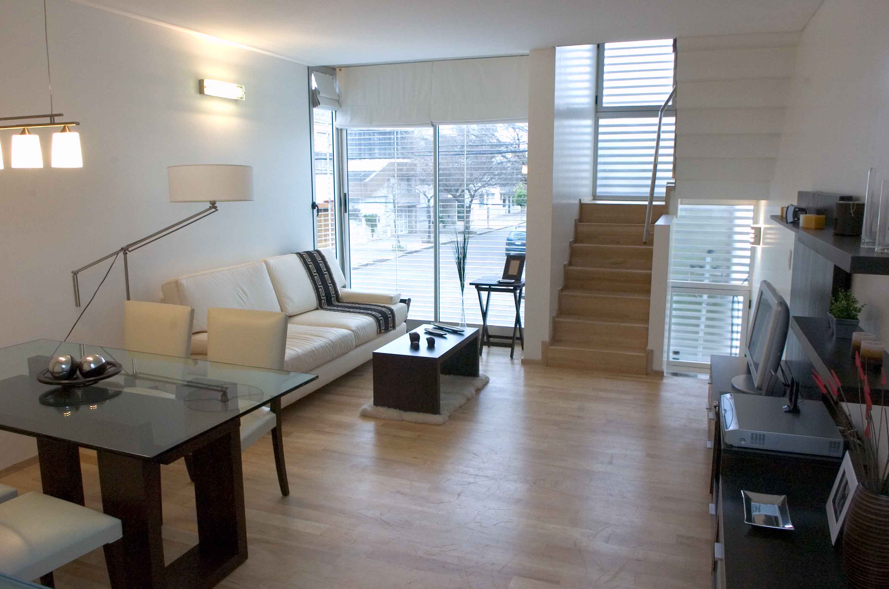En el segundo nivel, el estar-comedor, la cocina y la terraza de expansión forman un espacio continuo pero posible de ser dividido por una mampara de vidrio esmerilado y marco de madera guatambú.