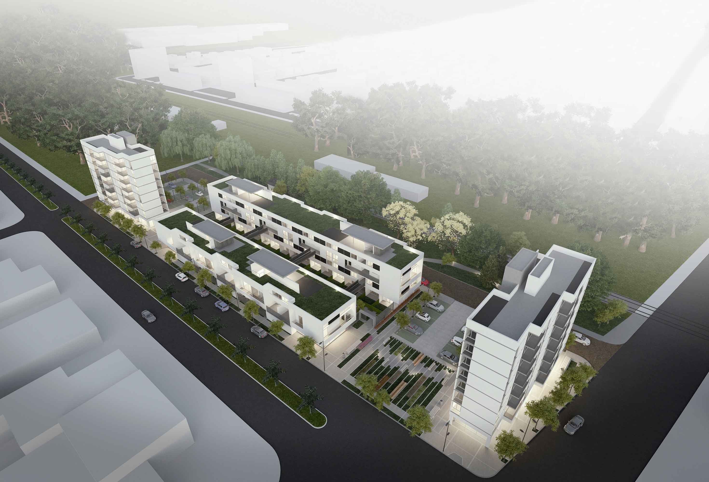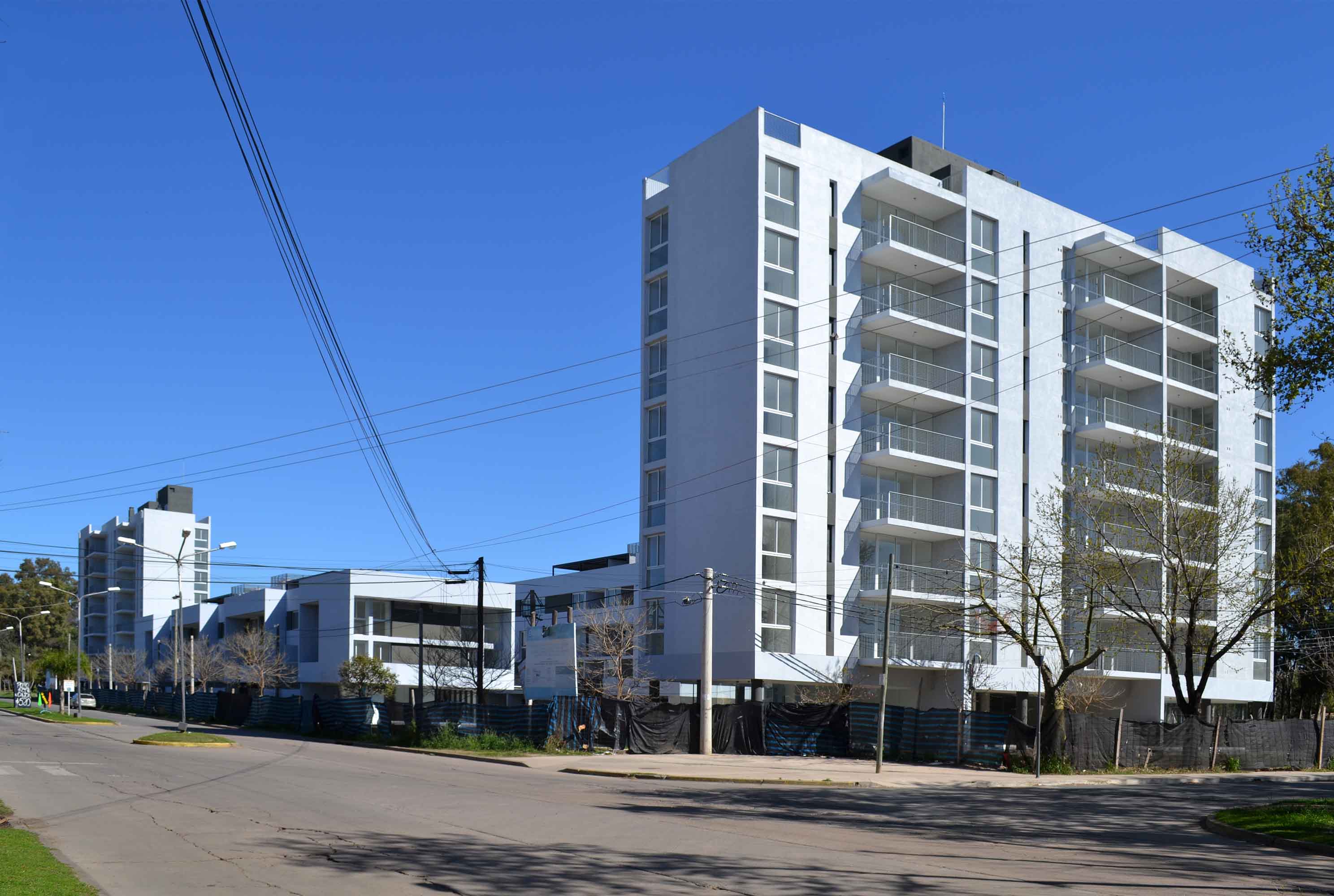 Si bien el diseño de las envolventes arquitectónicas se correspondió con el desarrollo y las presiones internas de las plantas, el modelado de las elevaciones y volumetrías incluyeron también las condicionantes urbanas más relevantes, como ser que las unidades de viviendas que ocupan las cabeceras de las tiras de dúplex se giren para obtener una fachada viva frente a los espacios verdes del conjunto, o que los balcones de los cuerpos en torre estén todos dispuestos de acuerdo a la mejores orientaciones sin obviar otras valoraciones como ser potencializar las visuales más convocantes a través de la incorporación de las vistas al río Paraná en el caso del emplazado sobre Av. Buenos Aires o la generación de perspectivas profundas al bosque de añosos eucaliptos desde el ingreso a los departamentos ubicados al Oeste en la planta del edificio sobre Pasaje Rafael Obligado.