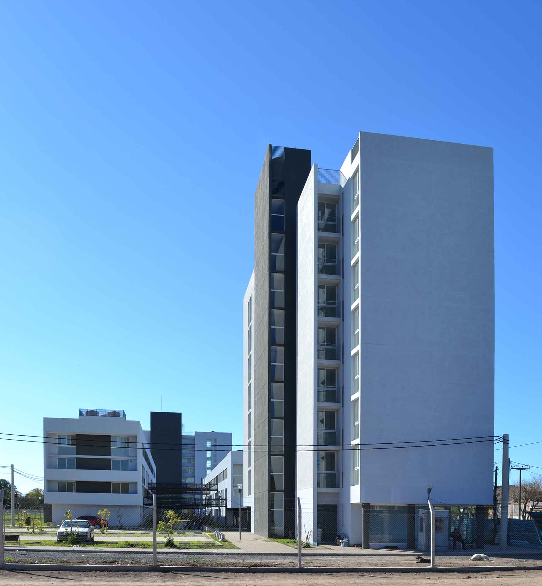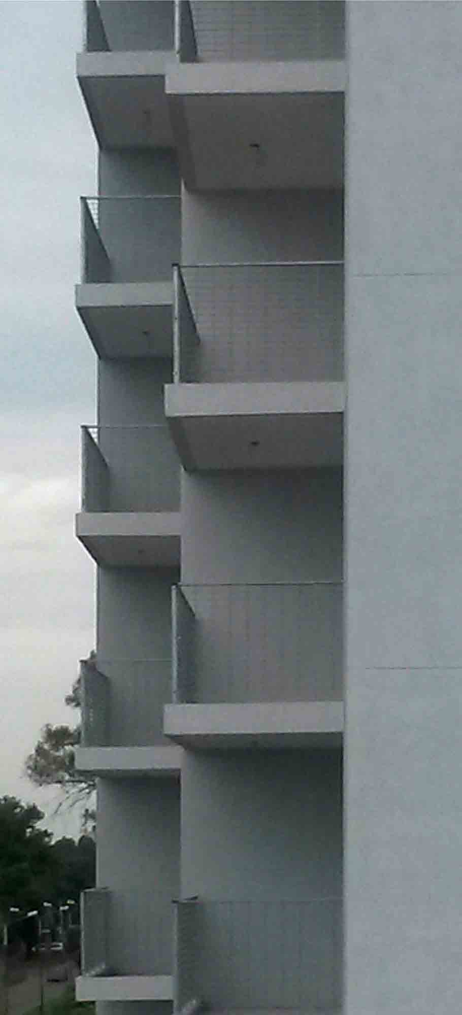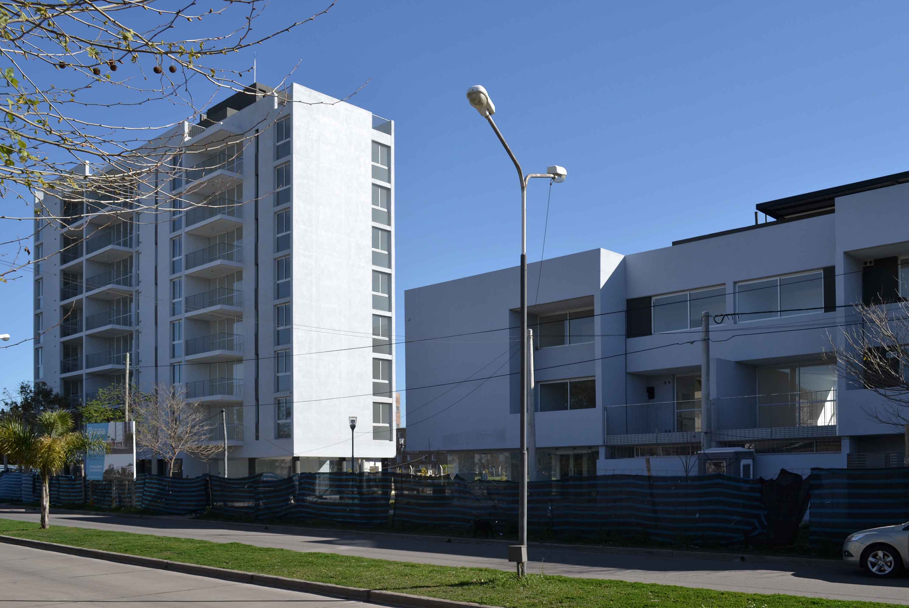 En el edificio en altura, con el desfasaje de 1,5 m entre las tres unidades de vivienda se ha logrado incorporar los balcones a la propia volumetría del edificio evitando visuales cruzadas entre los mismos con el propósito de acentuar la privacidad de cada departamento.