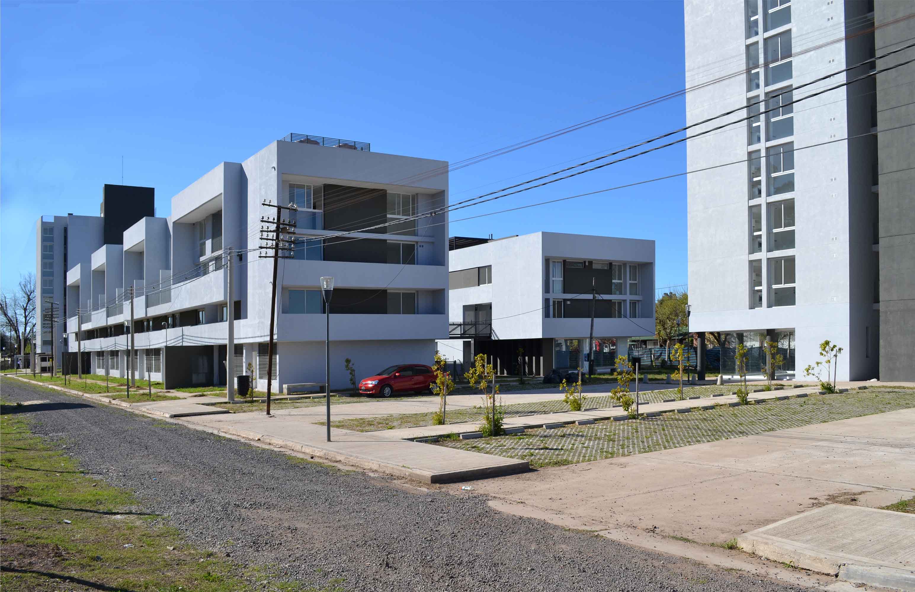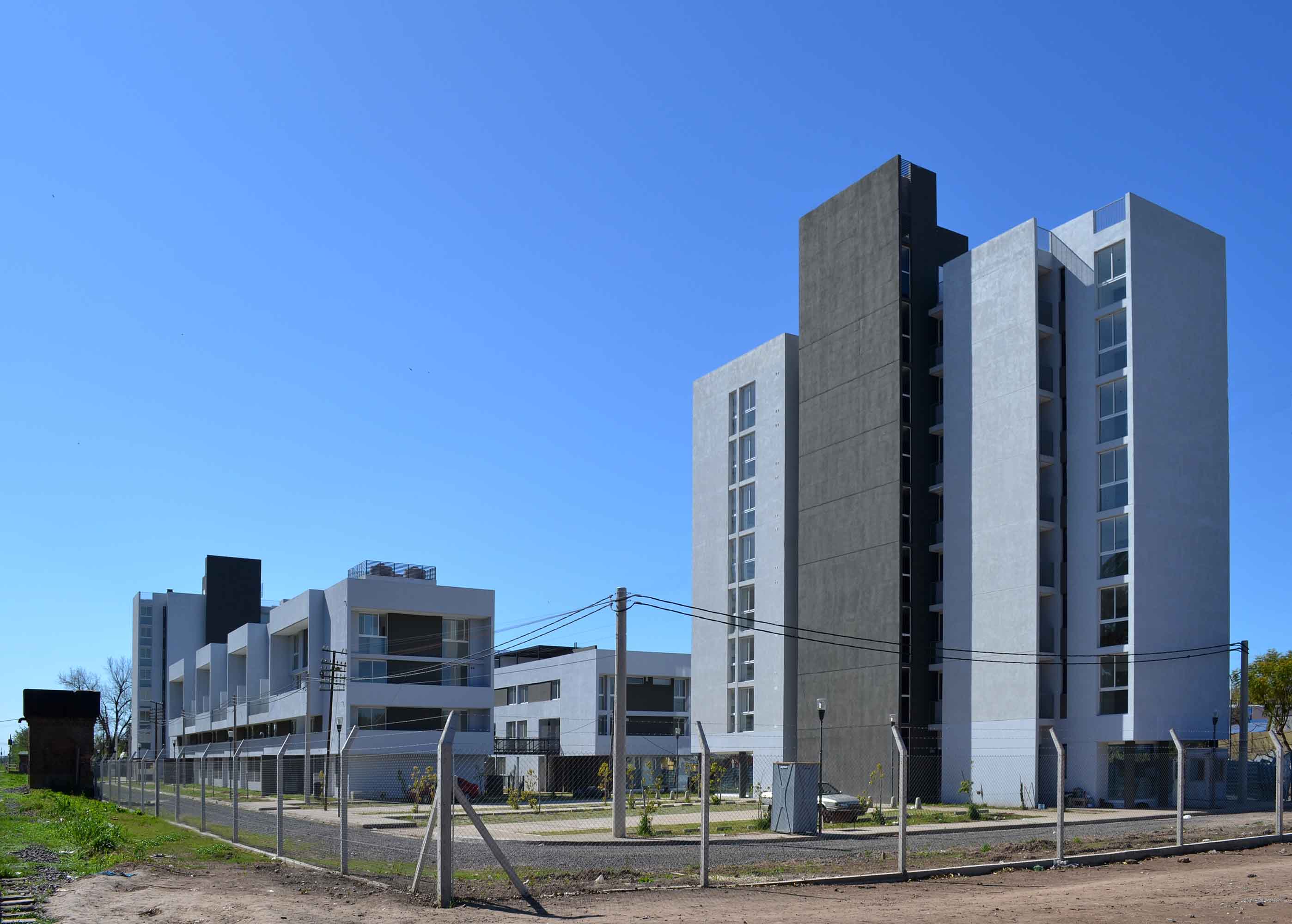 A fin de garantizar la habitabilidad residencial del conjunto como parte integrante de la macro forma de la ciudad se consideró imprescindible potenciar el frente de vida de la masa edificada vitalizando fundamentalmente la planta en contacto con el suelo. Esto se ha logrado controlando el espacio abierto en contacto con el suelo definiendo los porcentajes destinados a uso común y a uso exclusivo, para obtener un equilibrio que garantice tipologías de viviendas con jardín o patio propio alentando el carácter residencial en contrapartida a los inconvenientes surgidos por la falta de apropiación del espacio abierto por parte de sus habitantes en los antiguos planes de vivienda de la Nación. Así todos los prototipos en contacto con el suelo poseen expansión propia al exterior con parcelas delimitadas por setos verdes que se integran al paisaje natural del espacio colectivo central.