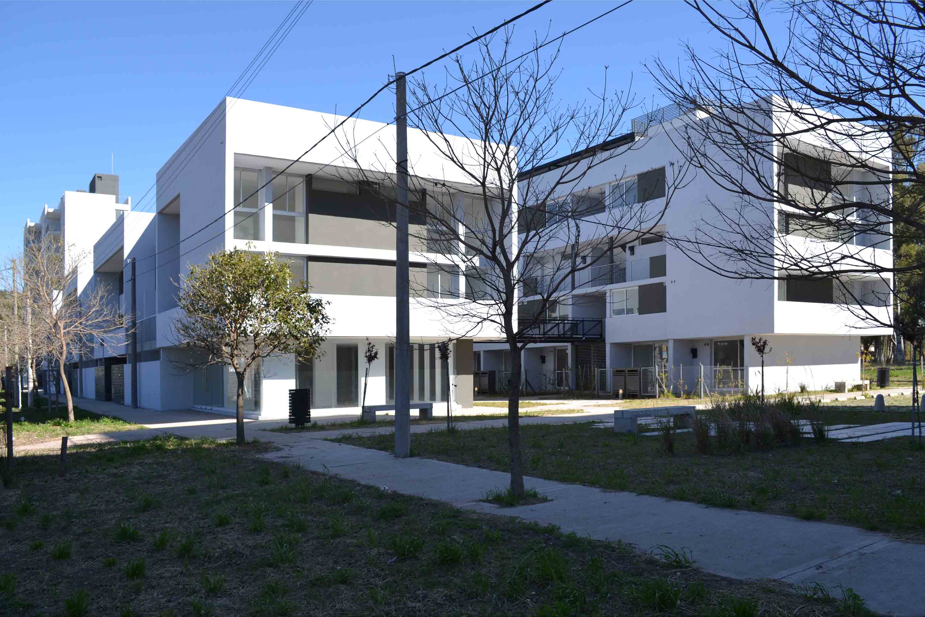 Aumentar la distancia entre las tiras de vivienda multifamiliar generando un espacio privado de uso colectivo con diferentes estaciones de equipamiento (deportivo, recreativo infantil y ocio). Se consolidó así, un espacio central de encuentro que recrea la identidad barrial representada por “la vida en la vereda”, permitiendo proveer de un acceso alternativo a las unidades de planta baja y a los núcleos de escaleras para los dúplex en altura a través de un recorrido acentuado por la presencia del paisaje natural que a su vez se conecta con el resto de los espacios recreativos públicos vertebrándolos en una idea de conjunto. Este resultado se obtuvo ajustando el ancho a 8 metros de calzada y a 2,40 el ancho de vereda de la calle que separa el espacio verde del FFCC con el frente oeste del conjunto; operación posible considerando su reducido tránsito vehicular por ser una arteria interior de la propia urbanización del sector.