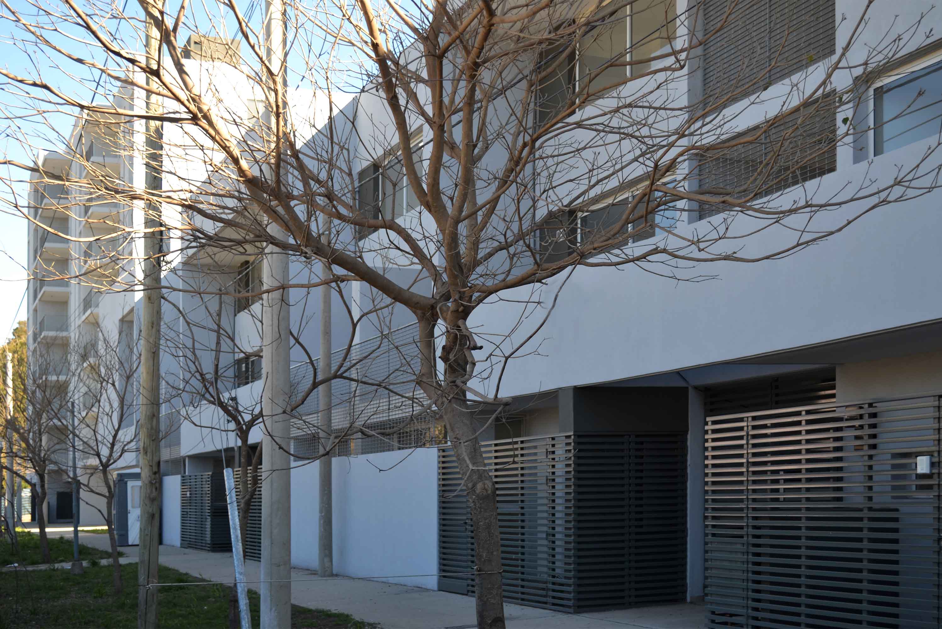 Para los prototipos de dúplex en el frente oeste se ha optado por rejas en la misma carpintería del aventanamiento e incorporar, en el retranqueo del ingreso, canteros integrados con el propio diseño de la fachada como transición con la vereda pero sin perder el diálogo con la franja de espacio verde del FFCC. Para el frente urbano sobre Av. Buenos Aires se modificó el criterio por tratarse de una de las principales arterias de Granadero Baigorria, de gran escala, y de alto tránsito, lo que determinó acentuar el límite entre las viviendas para discapacitados y la vereda mediante un muro elevado para evitar la invasión visual y una reja a la manera de quiebra vista para marcar el fuelle con el interior; consolidando la línea de edificación mediante una síntesis expresiva con elementos que superen la escala doméstica de una vivienda y acentúen la escala urbana de la avenida.