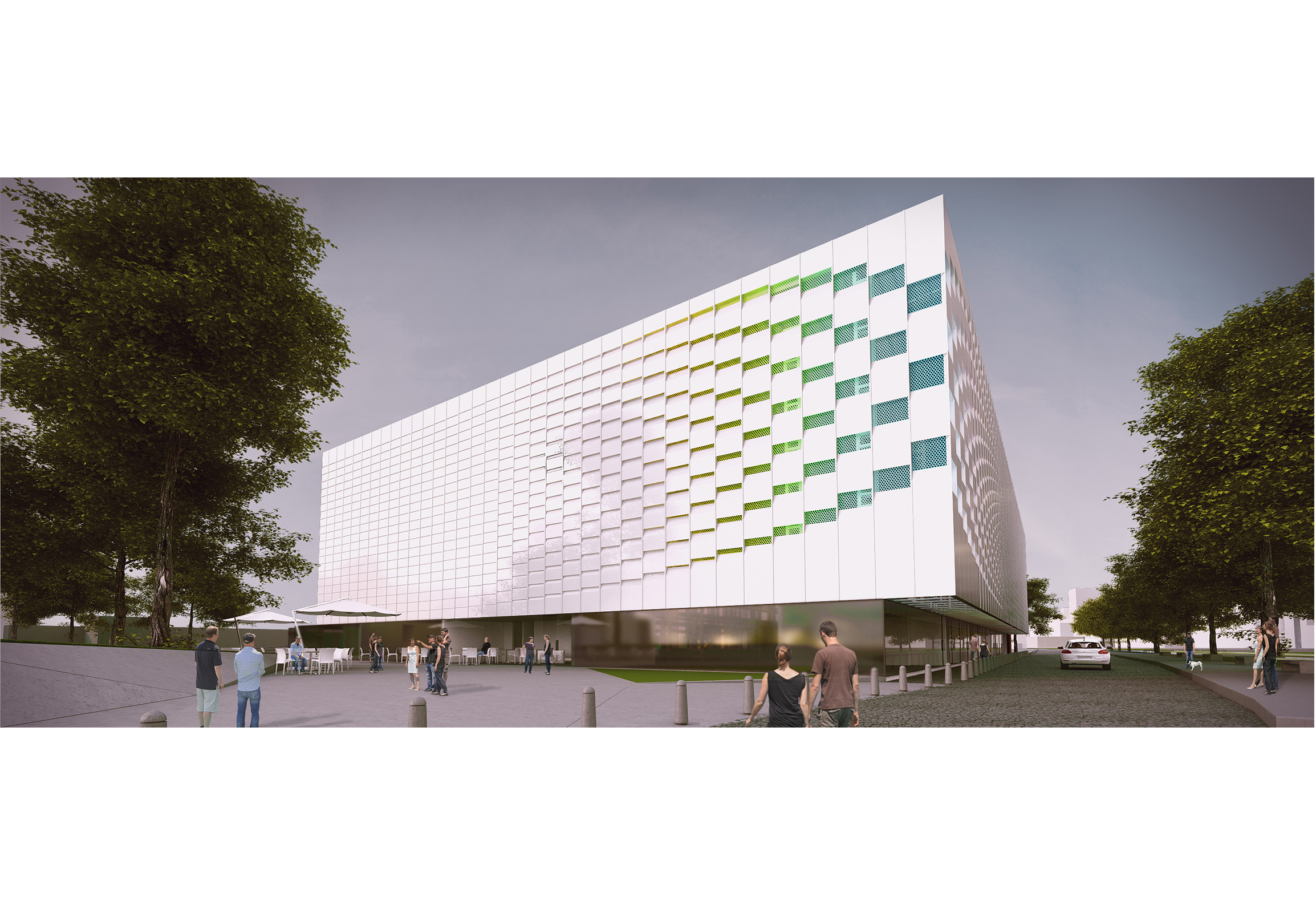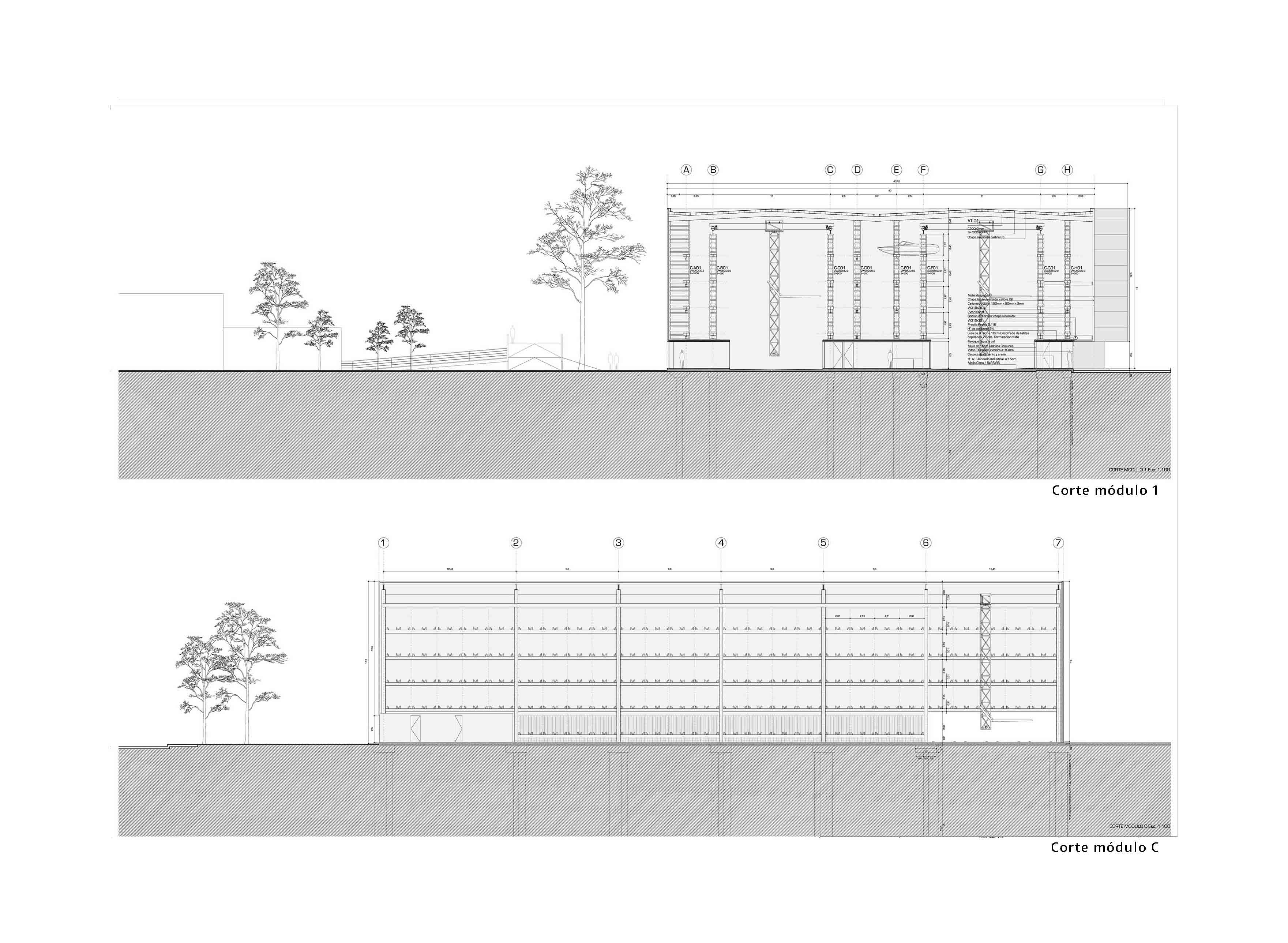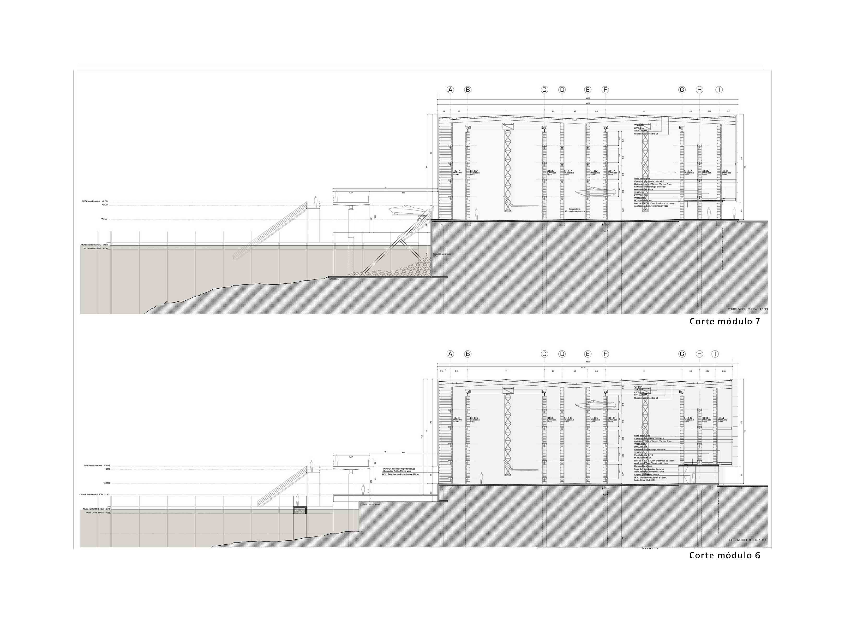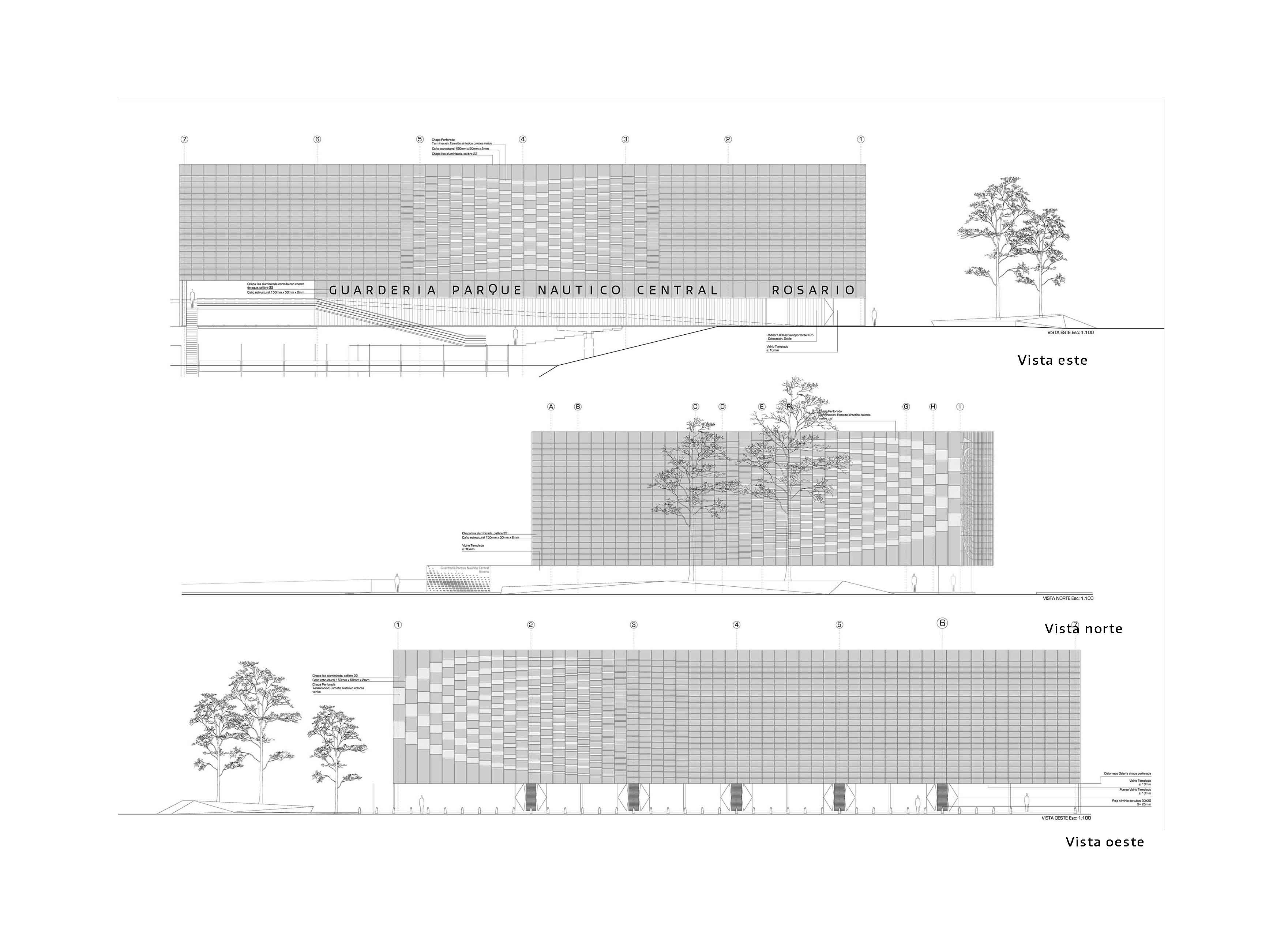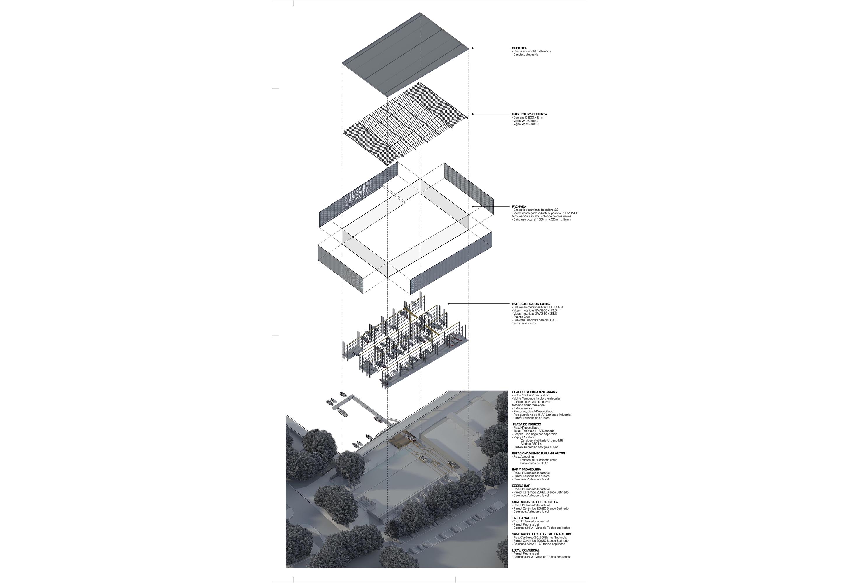 Respecto a la conformación de la envolvente la estrategia fue utilizar el recurso material propuesto en el pliego [chapa aluminizada] pero de manera que otorgara un efecto con un mayor grado de compromiso arquitectónico y visual respecto al emplazamiento del edificio tanto en su relación con el entorno urbano como en su relación con el entorno ribereño. Para ello se diseñó un sistema kinético gráfico en su composición de matriz [secuenciado verticalmente según el ancho útil de la chapa y la construcción de el marco estructural de la misma con Caño 150/50/2] conformando una suerte de regularidad y ritmo en el sentido vertical. La segunda decisión fue la de trabajar con la conformación de dos relieves, el primero enrazado sobre la línea de la envolvente donde se utiliza piezas de diferentes tamaños de “bandejas” materializadas con chapa lisa aluminizada y el segundo recedido el espesor de la estructura [150 mm] donde se propone bandejas de metal desplegado pesado pintadas en un gradiente de colores el cual a su vez, otorga ventilación e iluminación natural al interior de la nave con efectos semejantes a paso de los rayos del sol entre las copas de los árboles del entorno.