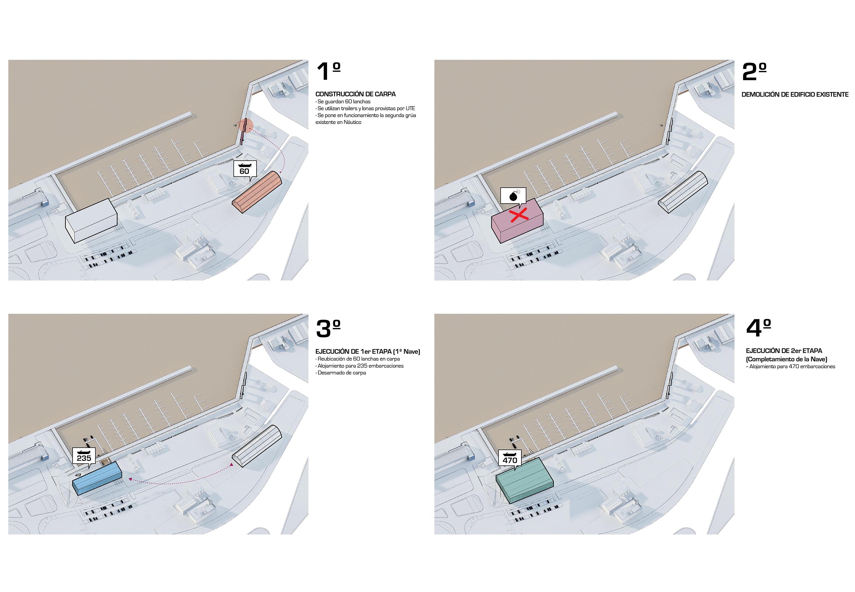 A esta primera instancia, le sigue la demolición de los edificios existentes y desmontaje de sus instalaciones existentes, para luego iniciar con la ejecución de la primera nave de la guardería concerniente a la estructura y cubierta, y la obra civil de la nueva área de muelle y el cuerpo de administración y sanitarios