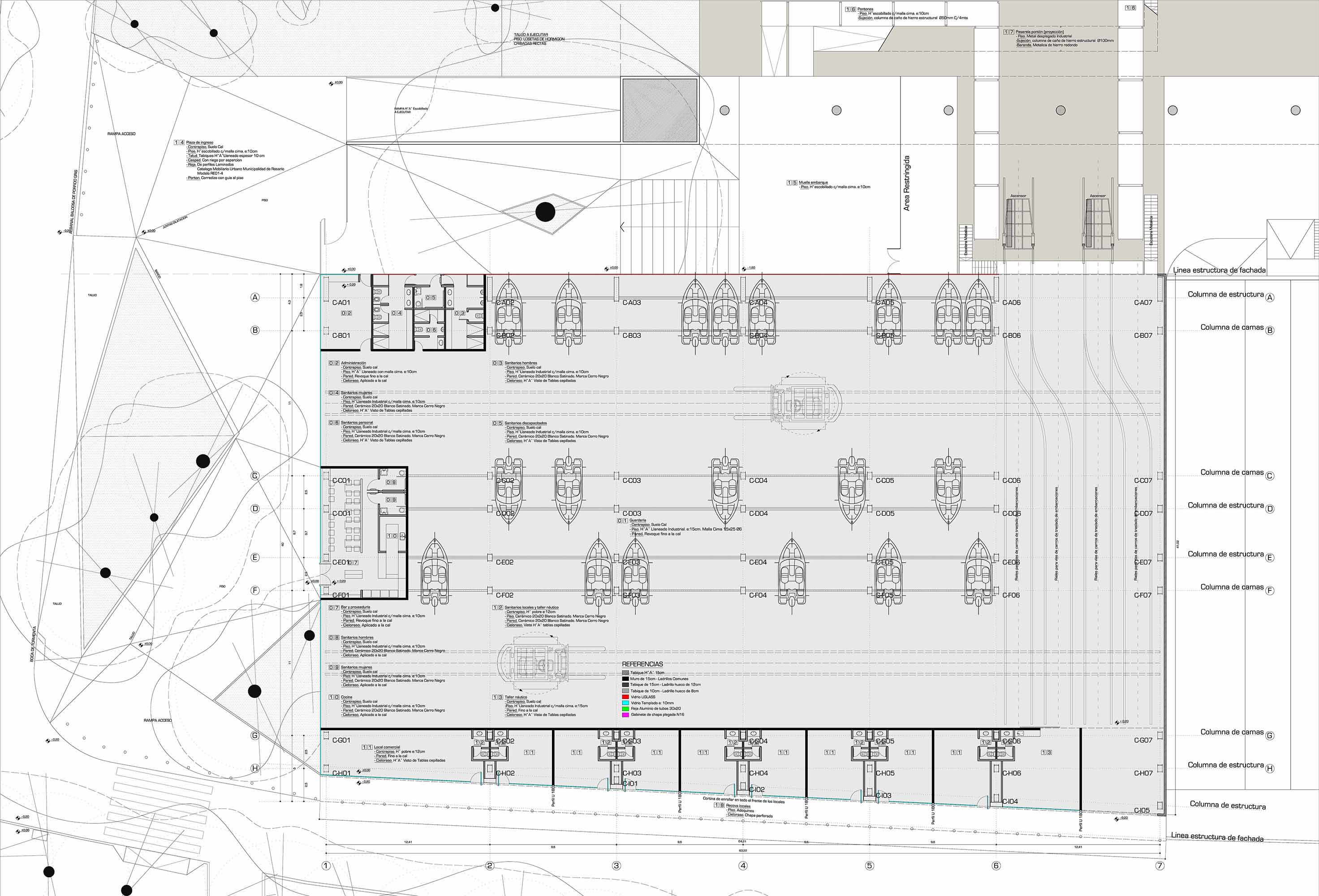 Estos intercolumnios son regidos por el ancho de las lanchas de 18 pies que es el tamaño de embarcación estándar para el parque náutico de la ciudad de Rosario. Por consiguiente, el módulo menor podrá alojar 4 camas y el mayor una más, pero si el requisito varía y es necesario alojar embarcaciones de mayor tamaño se puede hacer porque las distancia entre columnas no responde a una sola lancha sino a varias.