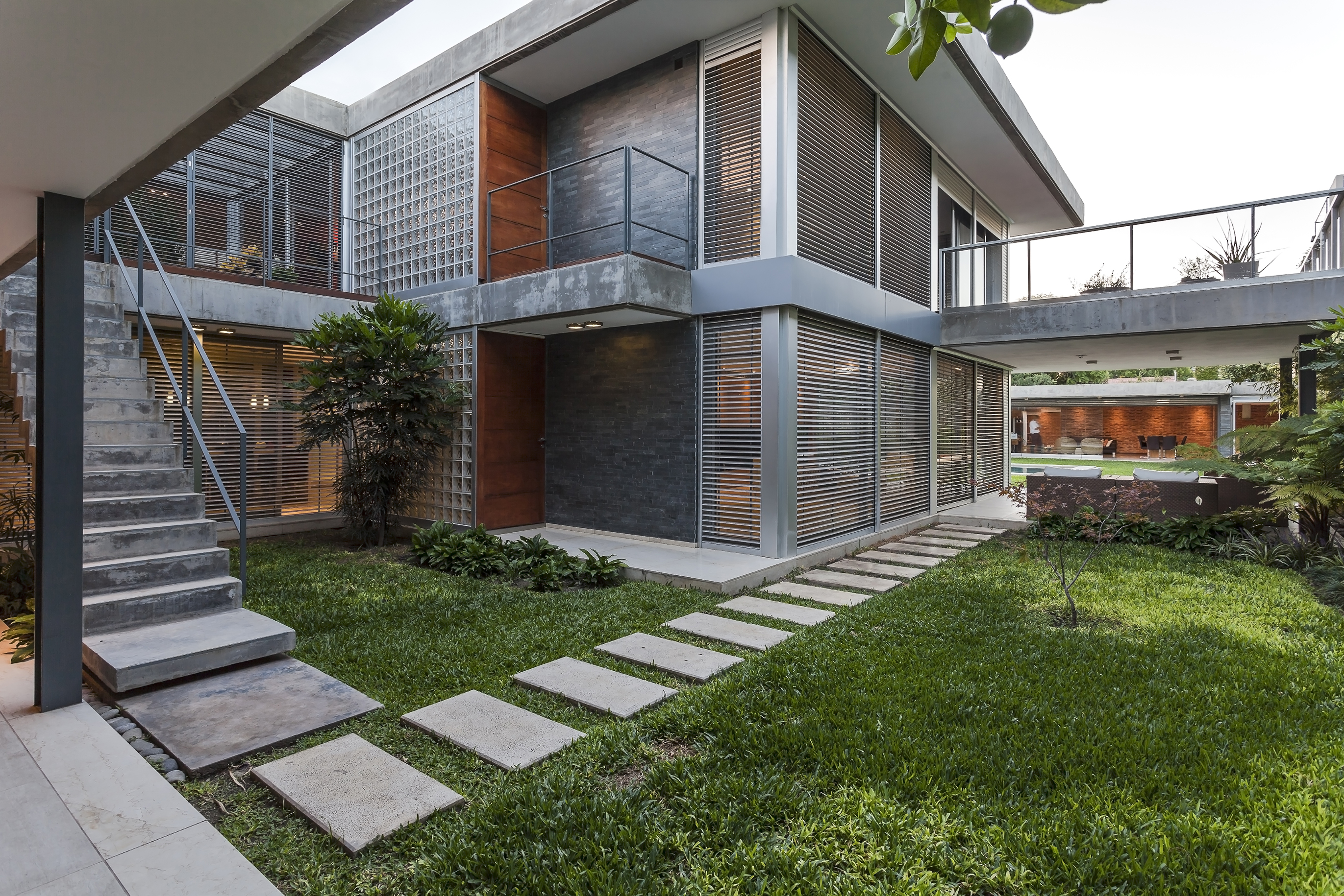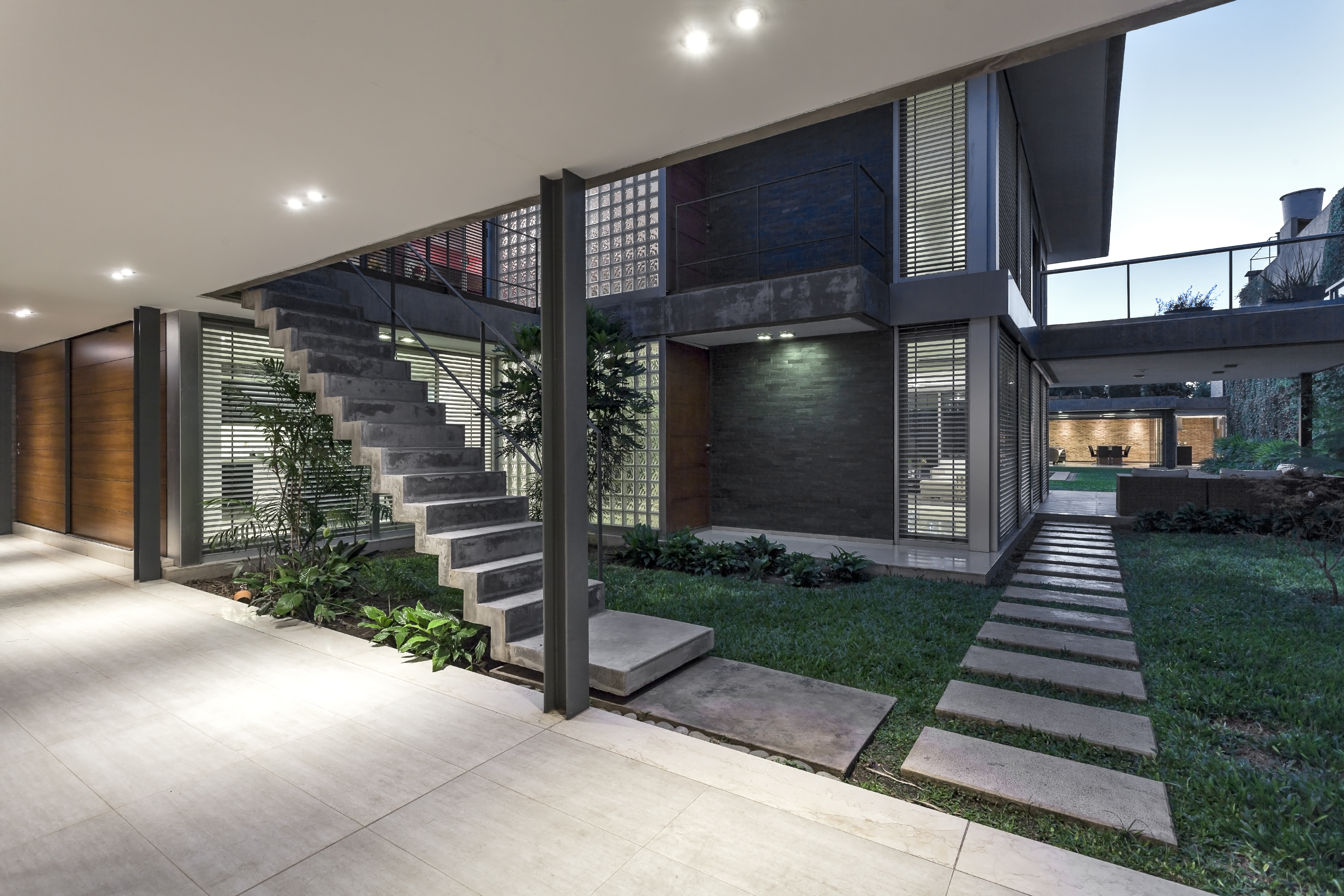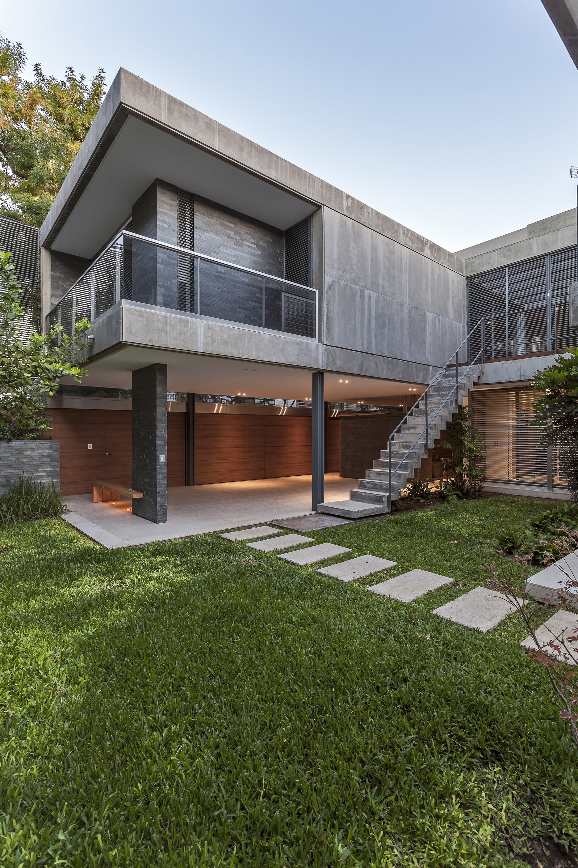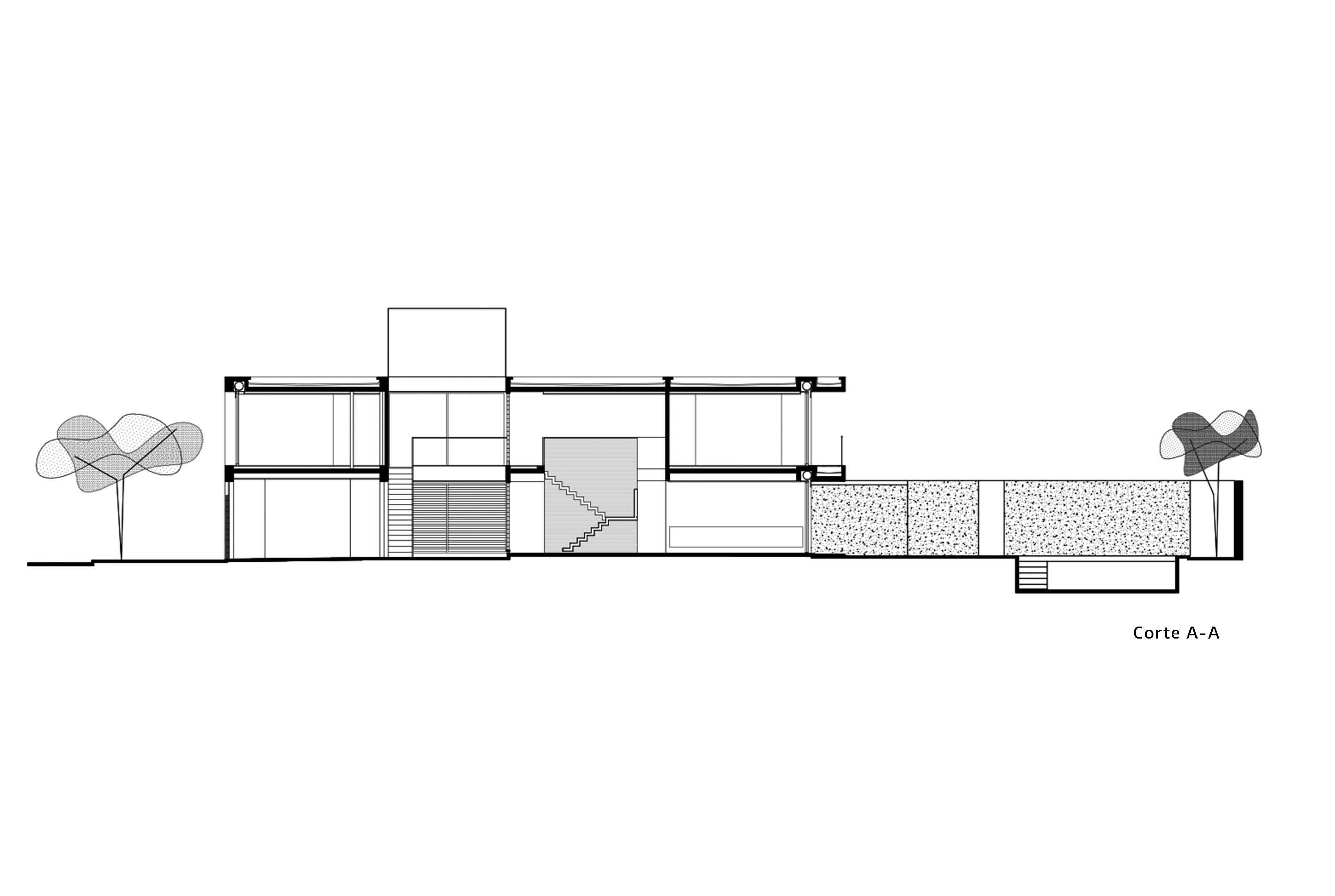 Este ensayo de proyectar con patios y terrazas para permitir identificar las partes del programa sin perder la idea de conjunto se acentúa por la transparencia de la obra, por lograr que la mirada del espectador no se detenga en ella sino que la atraviese, llevando esa mirada más allá del límite físico definido por la propia obra y así fundir el proyecto de arquitectura con el paisaje del jardín, haciendo de la intervención una operación unívoca entre exterior e interior. Por consiguiente, se pretende interpretar y conectarse con la escala residencial del barrio, careciendo de sentido fuera del entorno donde se inserta. La transparencia así entendida no solo se opone a la opacidad y la impenetrabilidad, sino también al exceso de forma y a la retórica del significado; para lo cual optamos por reforzar la austeridad del discurso disminuyendo al máximo las secciones de los elementos estructurales. A través de un sistema de columnas metálicas de perfiles normalizados U integradas al sistema de cerramiento de carpintería de aluminio y losas de hormigón armado con vigas invertidas que contienen los cajones para las cortinas de enrollar se resuelve toda la piel de la casa cuya adjetivación va asociada al compás del movimiento de apertura de su propia epidermis.