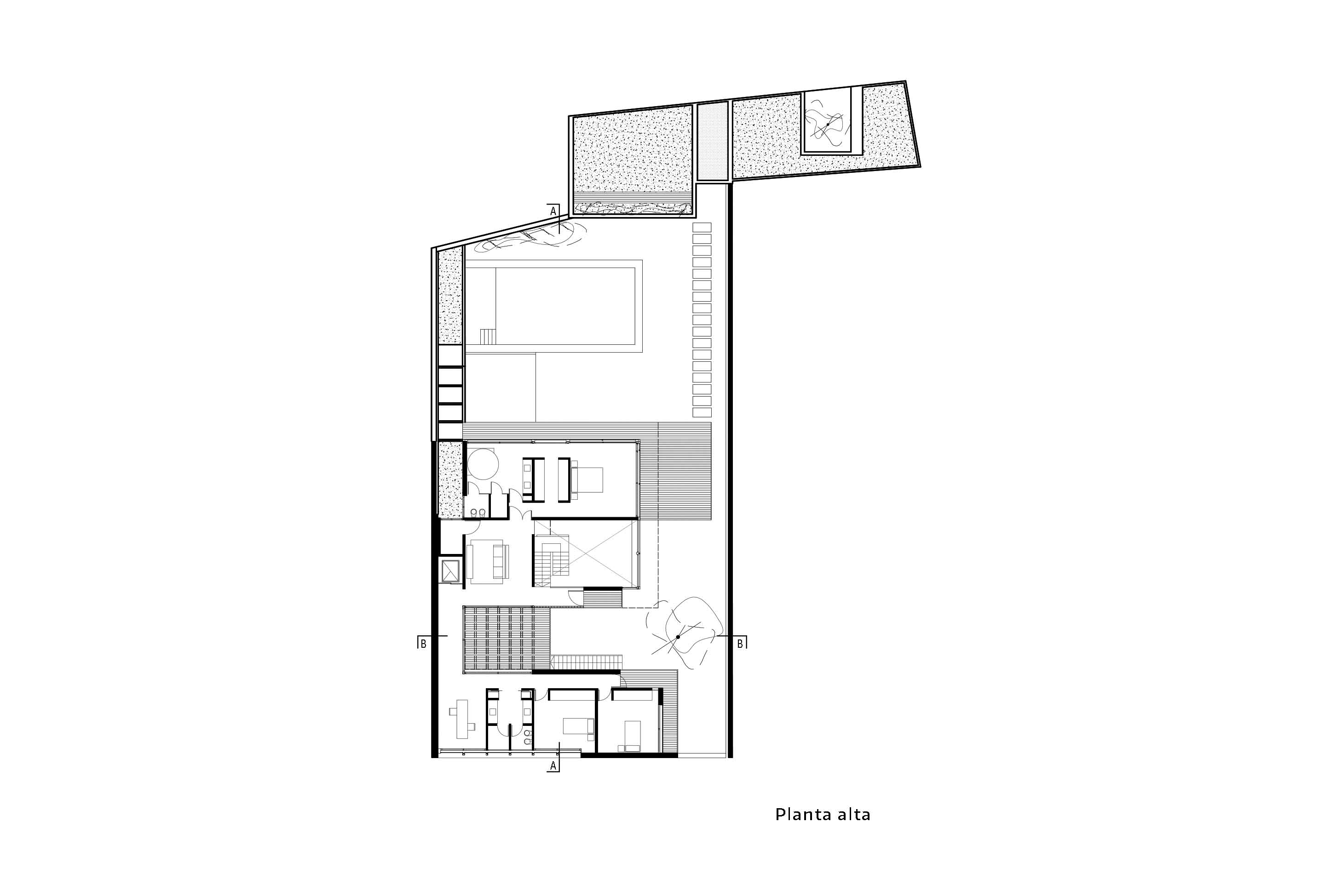 El barrio de emplazamiento, el ancho del lote y el programa requerido han condicionado considerablemente la morfología, la volumetría y los espacios interiores de esta vivienda. El proyecto debía contemplar esencialmente la autonomía del área para reuniones sociales- salón con asador- como así también la del sector destinado para los dos hijos que cursaban estudios universitarios.