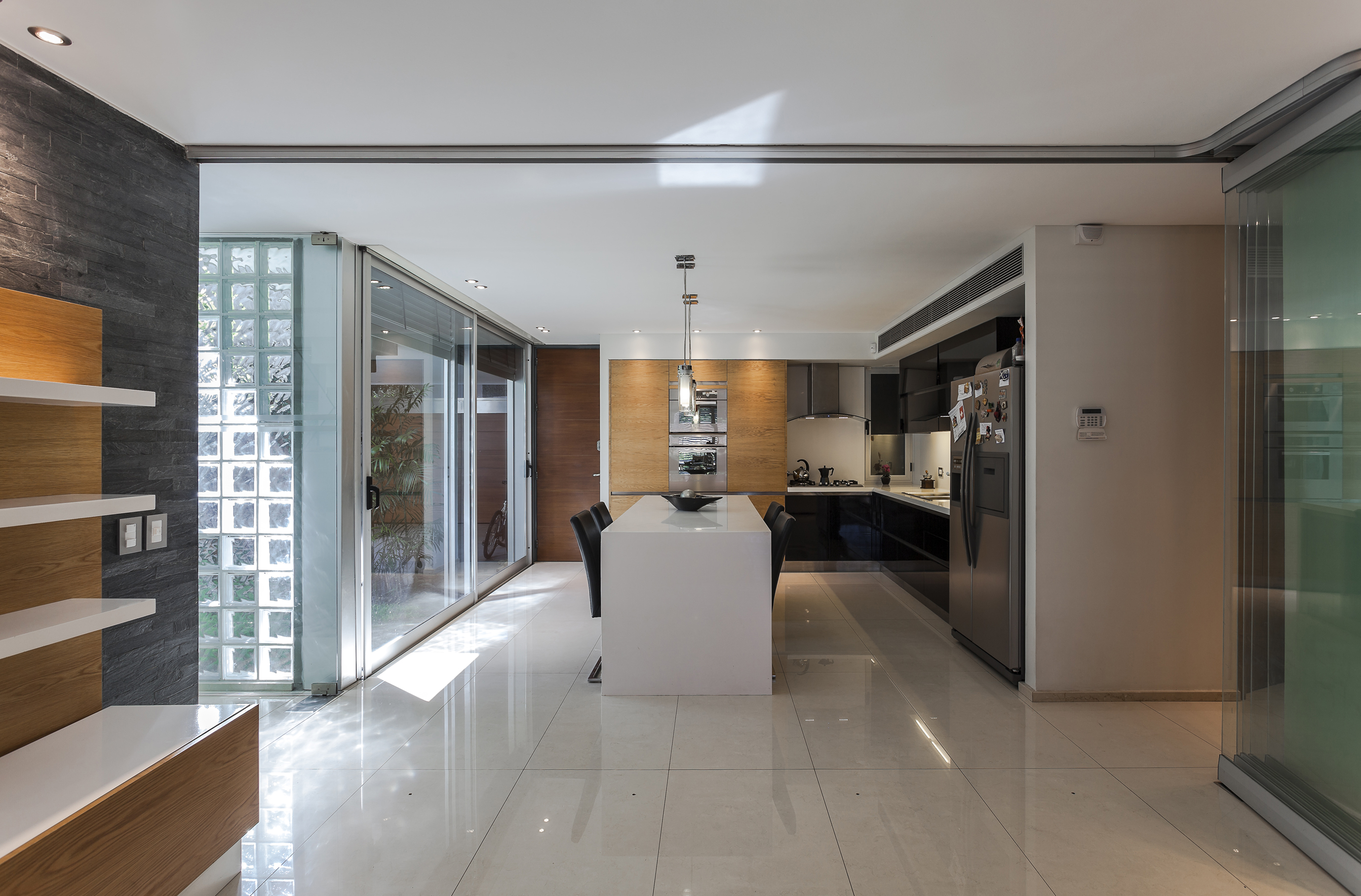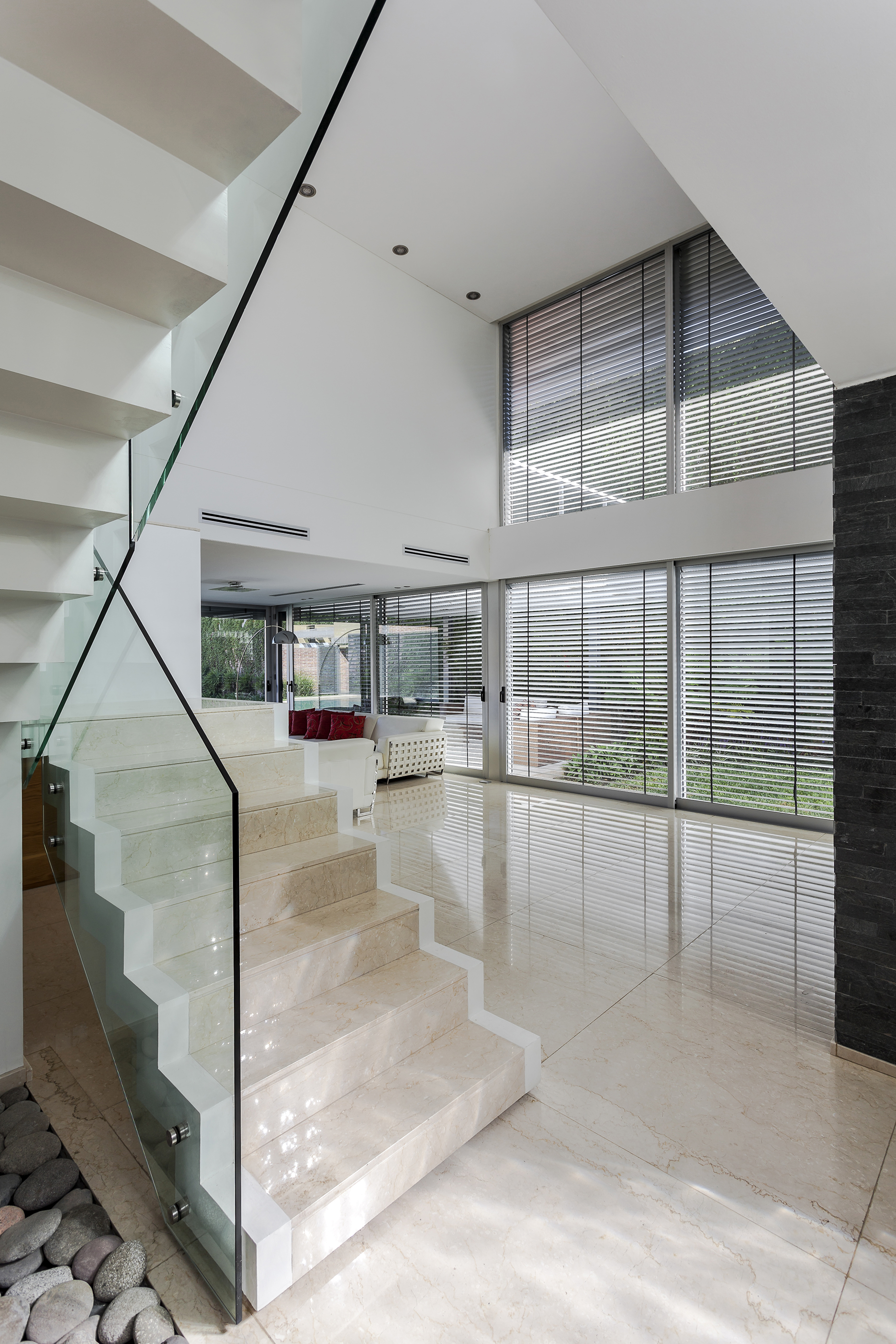 Aprovechando los 19 metros de frente de la parcela, la casa se recuesta sobre la medianera sur para entregarse al norte; y mediante una sucesión de espacios geométricos abiertos libera el resto del perímetro de sus fachadas en búsqueda de la pretendida autonomía entre las partes; y a su vez consolida un ámbito de privacidad alejado del límite con la calle y con mayor relación al remanso del centro de manzana.