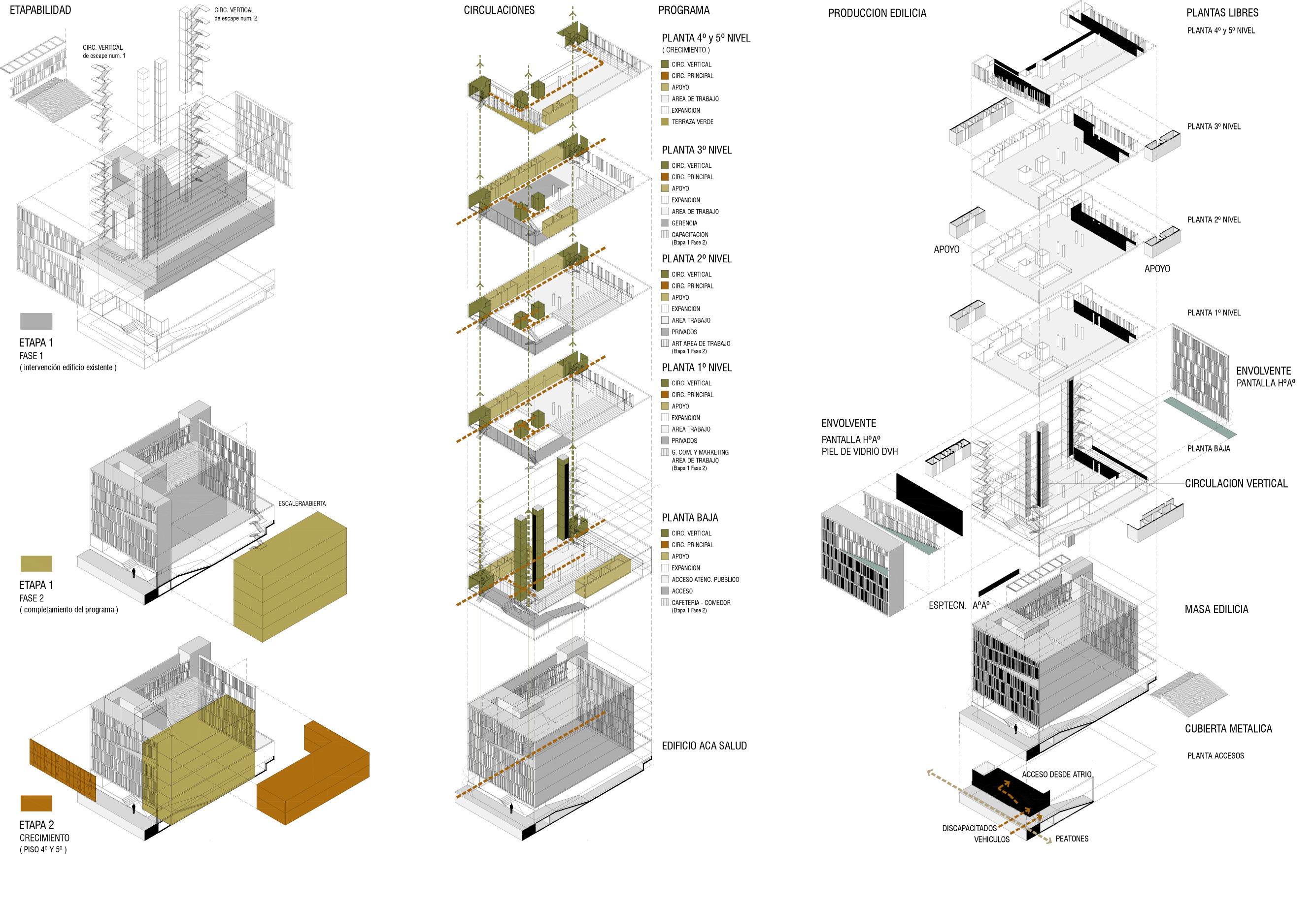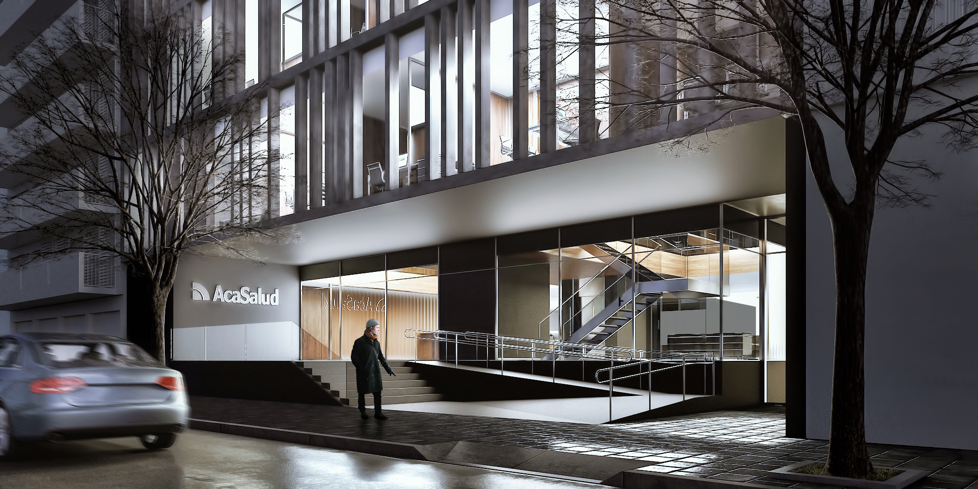 El anteproyecto para la nueva sede de ACA SALUD se basó en refuncionalizar, remodelar y ampliar el edifico existente, anexando nuevas superficies de uso en el terreno adyacente mediante una astuta interpretación del programa en relación a sus propias necesidades y a su entorno urbano, clasificando claramente los accesos y circulaciones; consolidando la imagen a la importancia institucional del mismo a través la expresión arquitectónica de sus fachadas, asegurando la sustentabilidad en el habitar por el desarrollo de una adecuada producción edilicia que a su vez garantice racionalidad en la construcción, y contemplando una precisal etapabilidad a través de sucesivas intervenciones de construcción; pero con una imagen nueva, única y acabada desde su inicio acorde al carácter representativo pretendido por ACA SALUD.