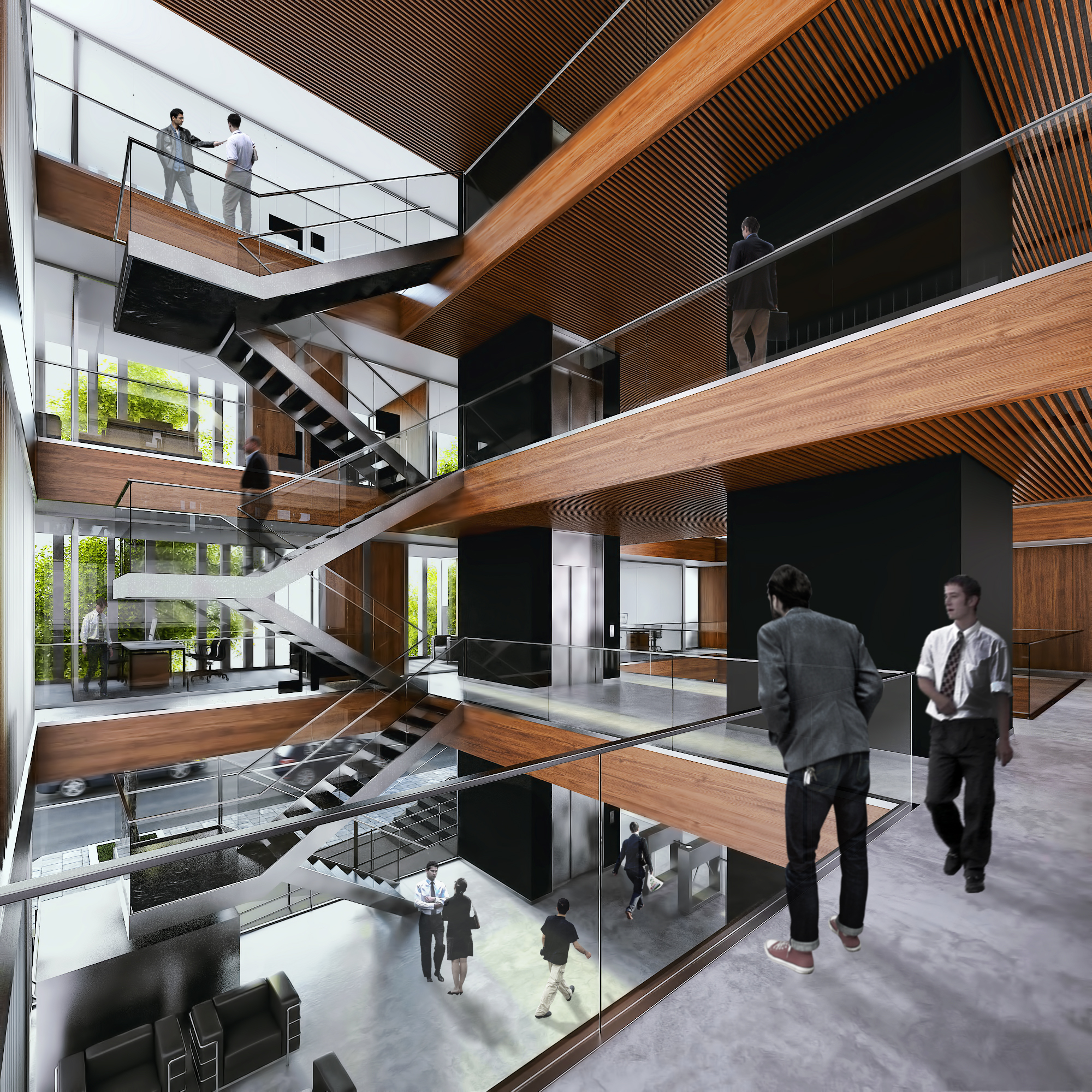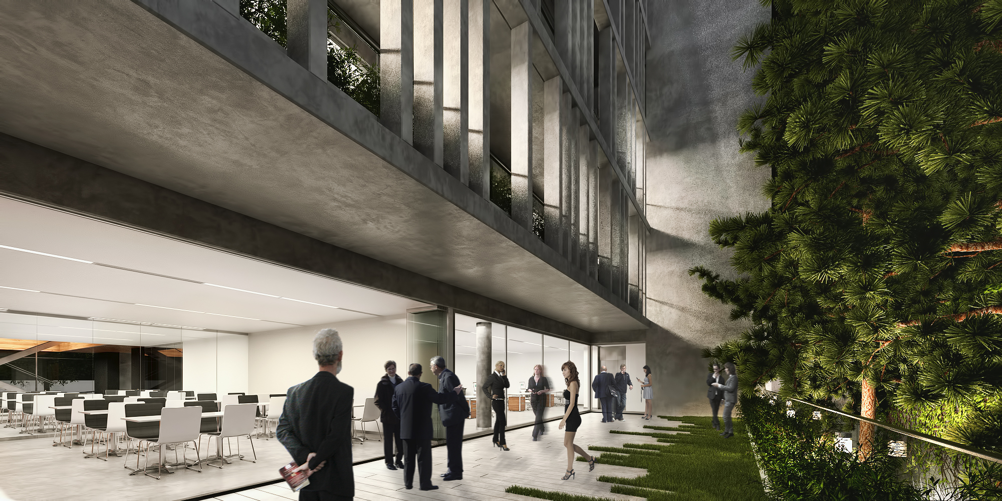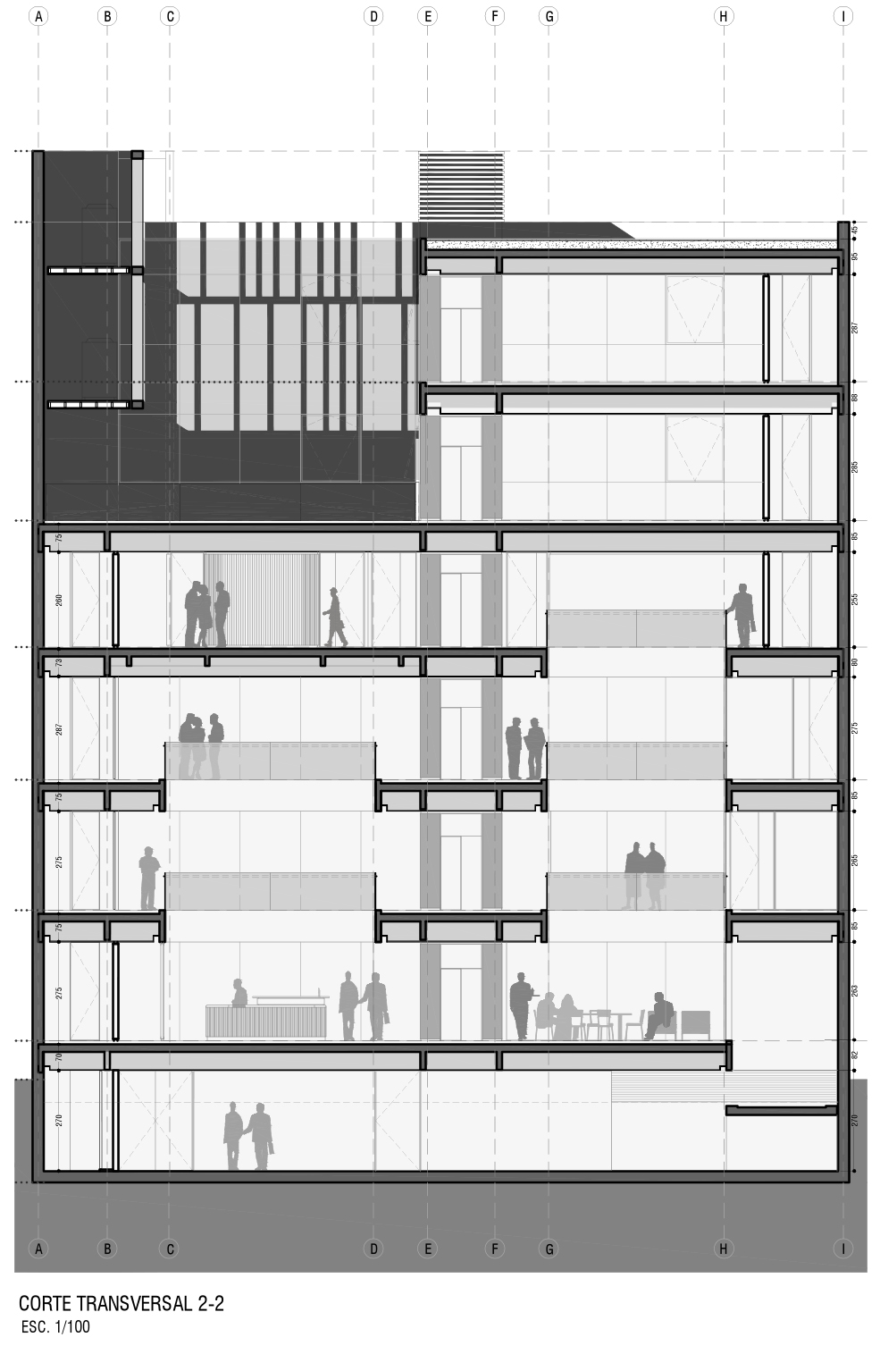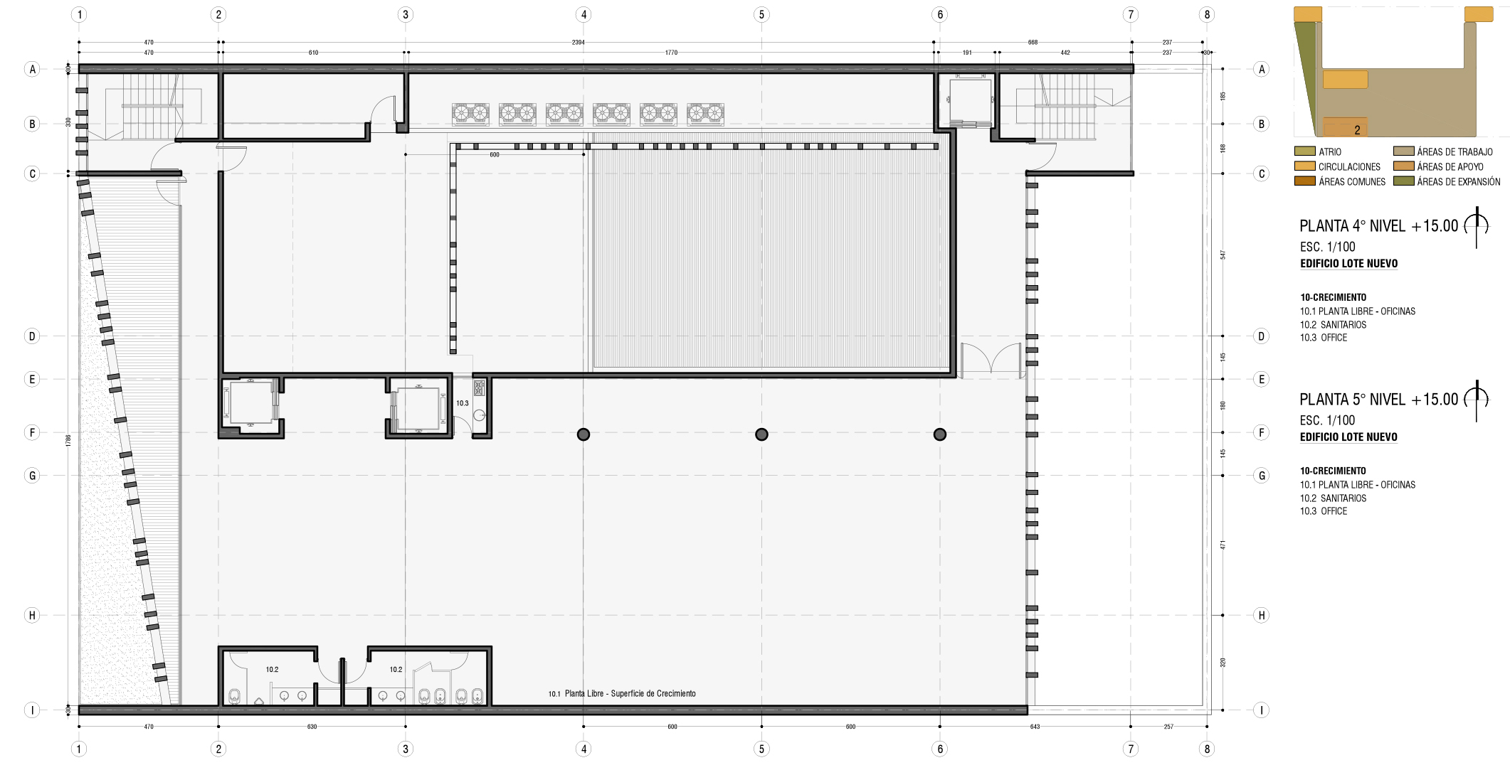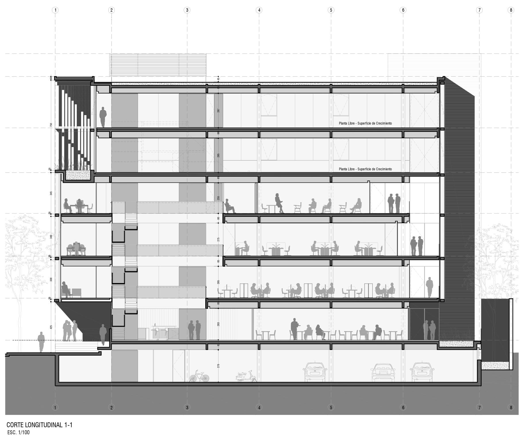 En tanto, la independencia de estos dos sectores no atenta contra la idea de conjunto gracias al espacio central de múltiples alturas que los articula con una marcada continuidad espacial en horizontal y vertical, favorecido por la concentración de las áreas de servicios (baños y office) recostadas en las medianeras como apoyos laterales a las áreas exclusivas de trabajo.