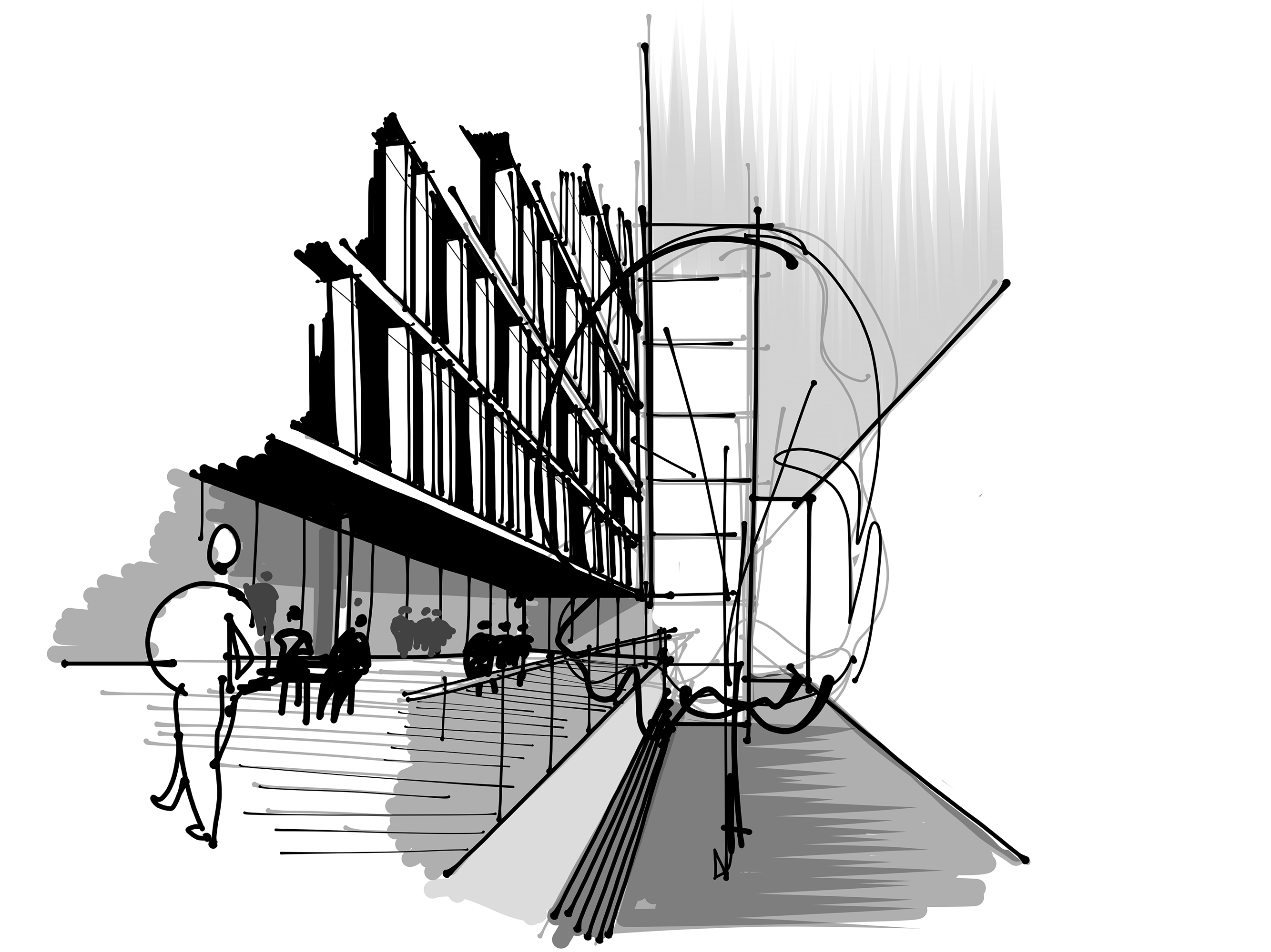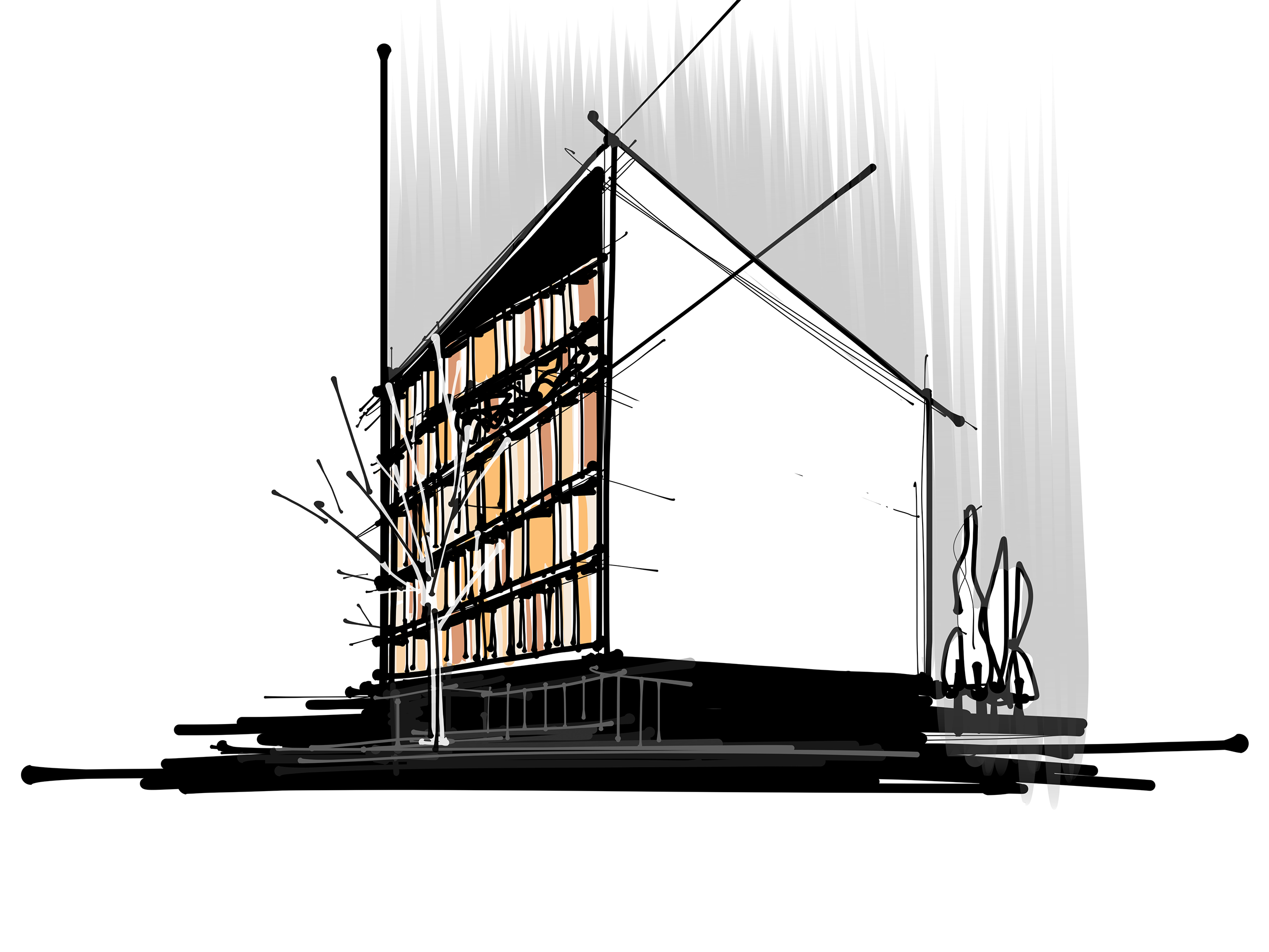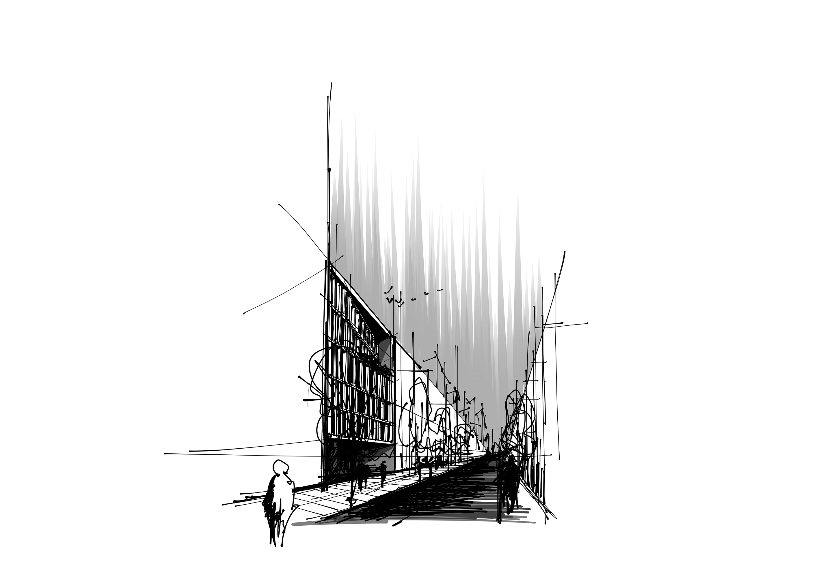 Mediante la aplicación de un programa paramétrico se diseñó una pantalla con una grilla de hormigón armado que define básicamente la imagen del edificio como un todo y anula la interpretación disociada de frente y contrafrente. Condición que se acentúa al mantener el mismo encuentro con el suelo en ambas orientaciones este y oeste: la pantalla se interrumpe y el vacío establece la relación interior-exterior.