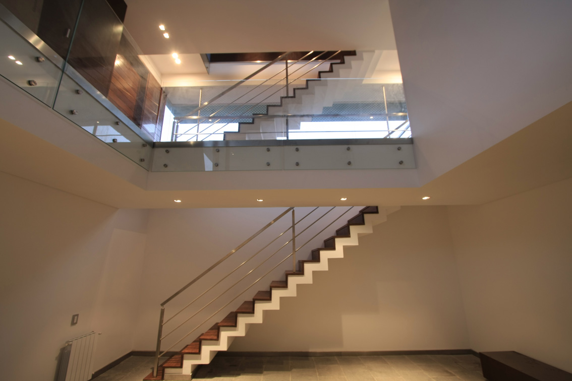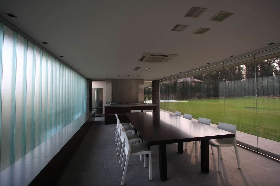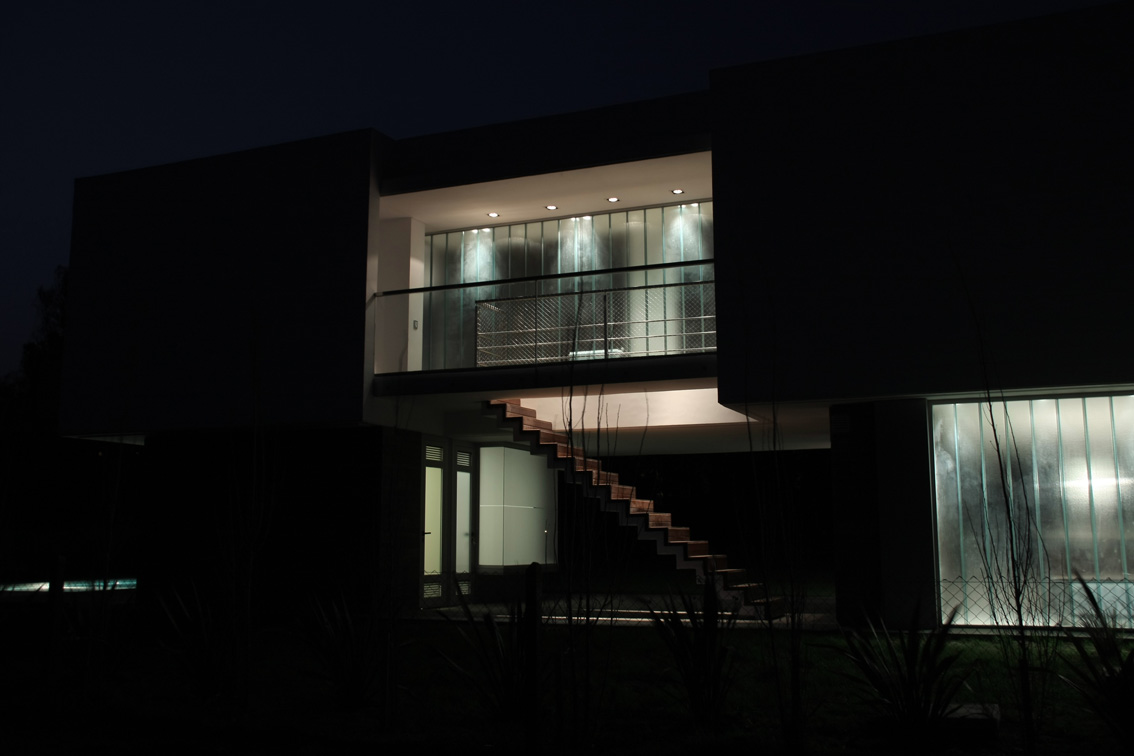 Es así que la vivienda se concibió con el deseo de aprovechar las mejores orientaciones y visuales, abriéndose al norte y concentrando las perspectivas hacia la hilera de añosos eucaliptos, principal referente de la geografía del lugar; buscando una íntima relación interior-exterior, a través de grandes aberturas de vidrio. Para enfatizar el diálogo con la naturaleza, en planta baja -principal área social de la casa- estas aberturas se pueden plegar en su totalidad, transformándose en un “gran espacio intermedio” provisto de un importante asador, espacio propio de la cultura pampeana argentina.