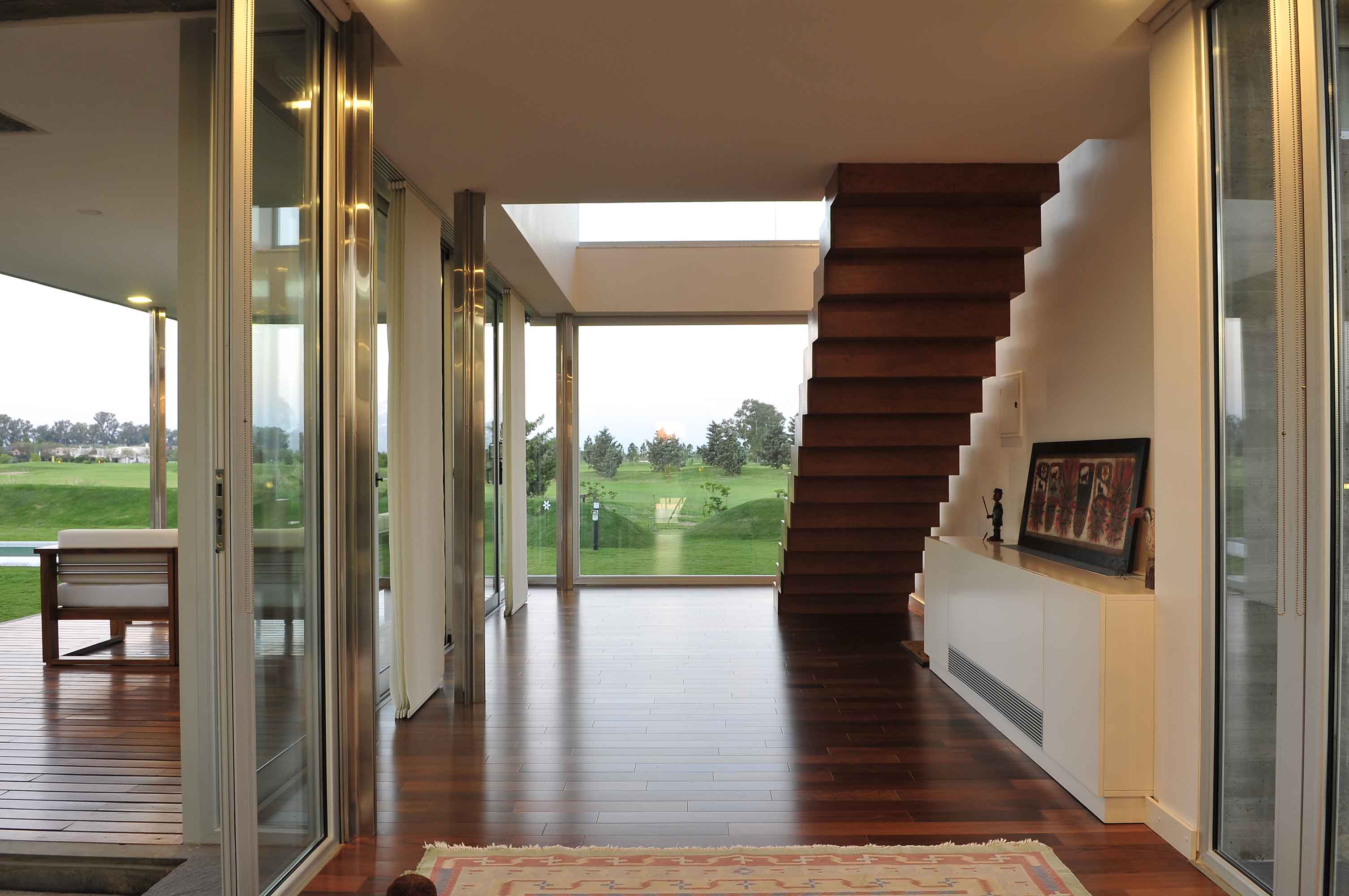 Así, la casa fue pensada como un conjunto de pabellones articulados por un espacio abierto central que posibilitó absorber la forma irregular del terreno y reforzar el vínculo con el paisaje natural a partir de reconocer las atractivas visuales heredadas de su ubicación privilegiada frente al campo de golf del club.