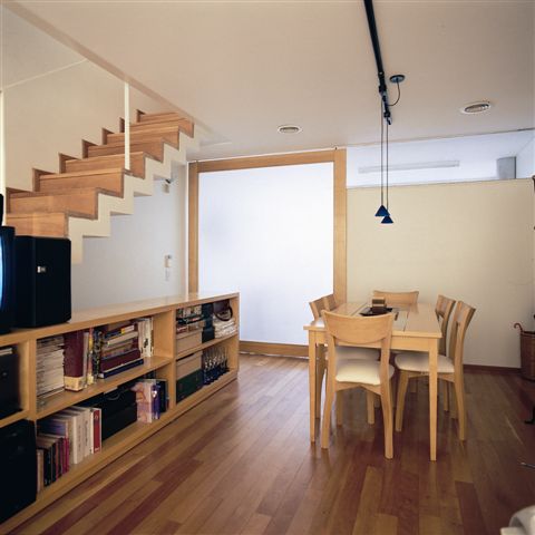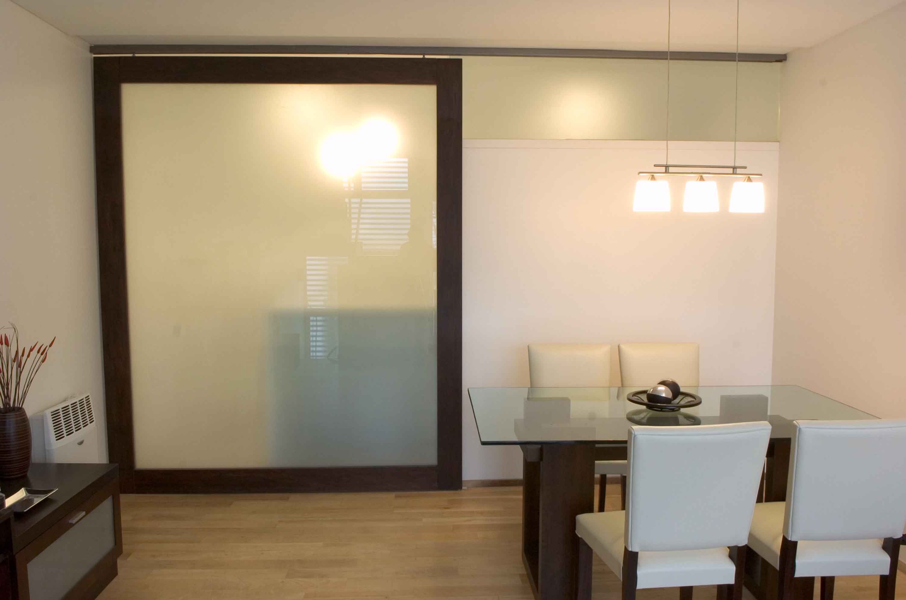 En el segundo nivel, el estar-comedor, la cocina y la terraza de expansión forman un espacio continuo pero posible de ser dividido por una mampara de vidrio esmerilado y marco de madera guatambú.