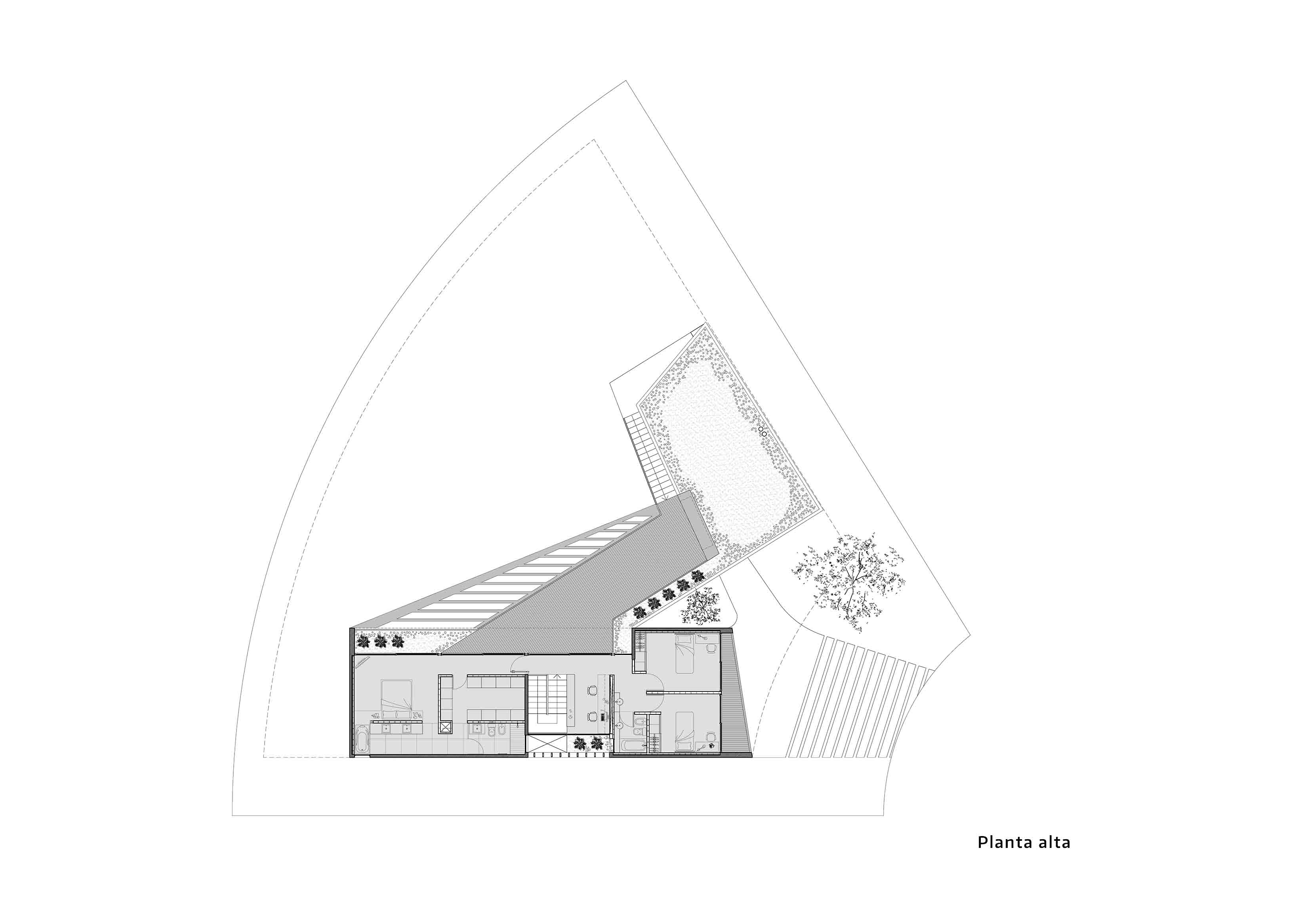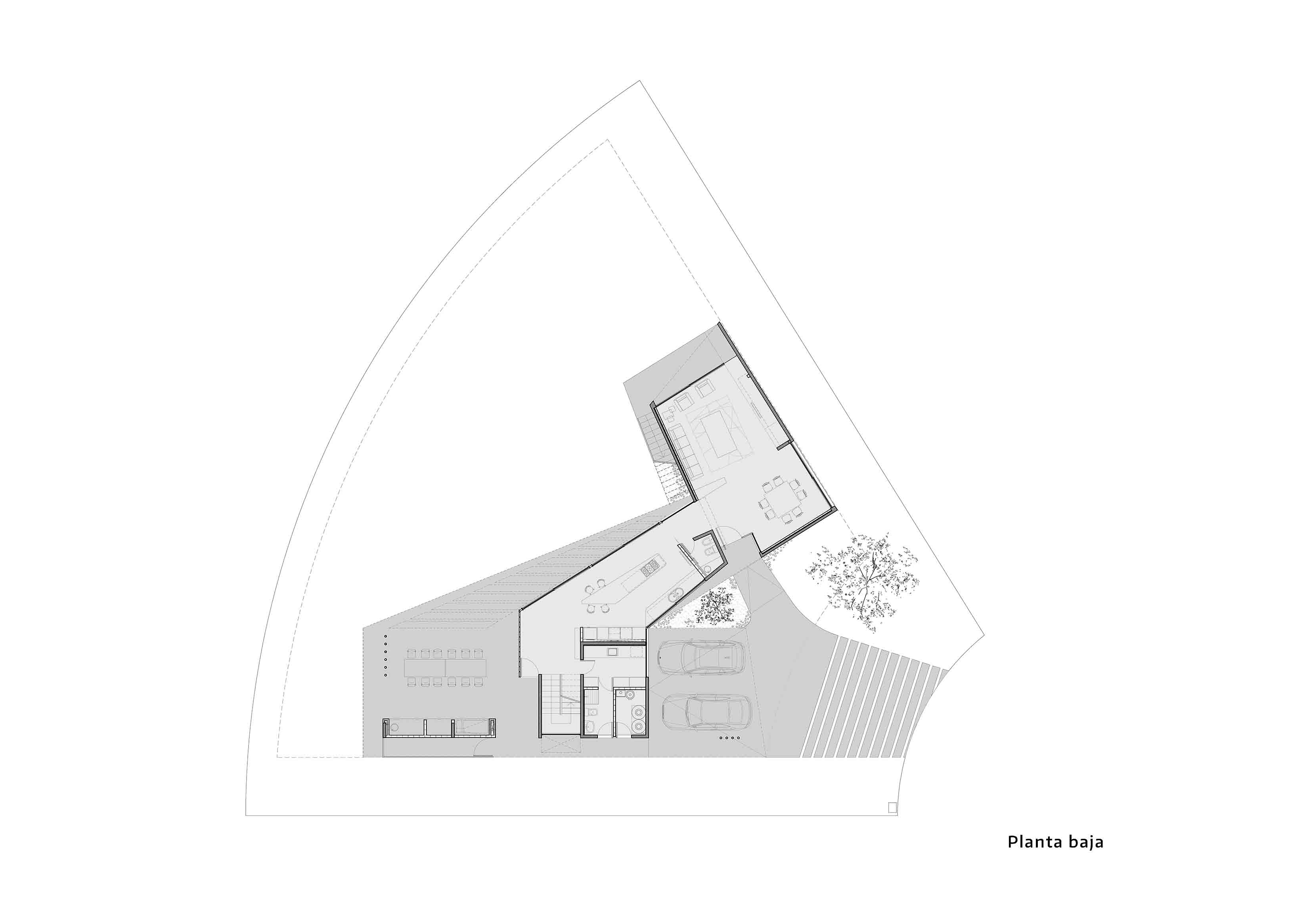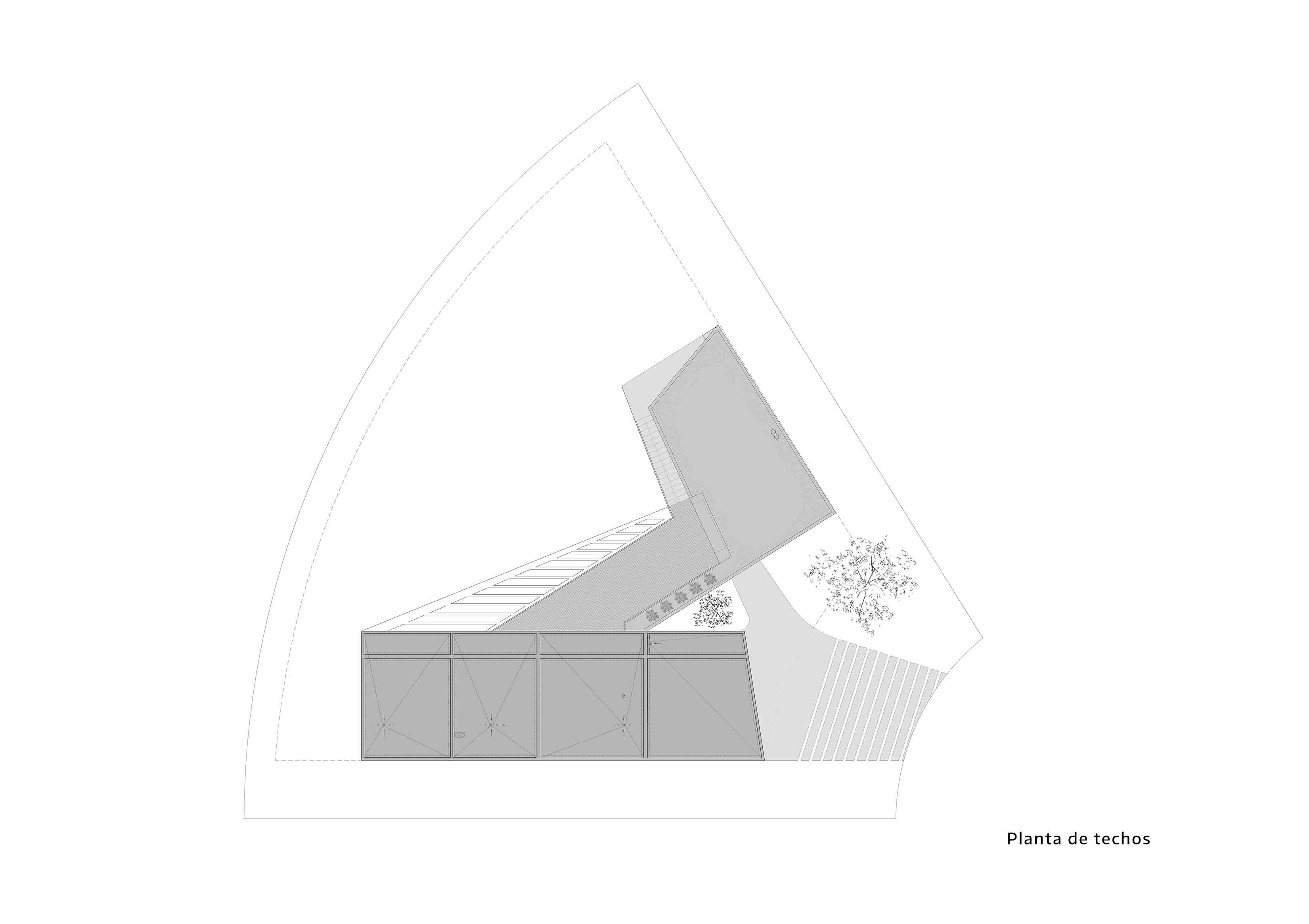 La forma irregular del lote y el emplazamiento frente a una plazoleta verde al norte condicionaron la morfología del proyecto y la organización del programa.