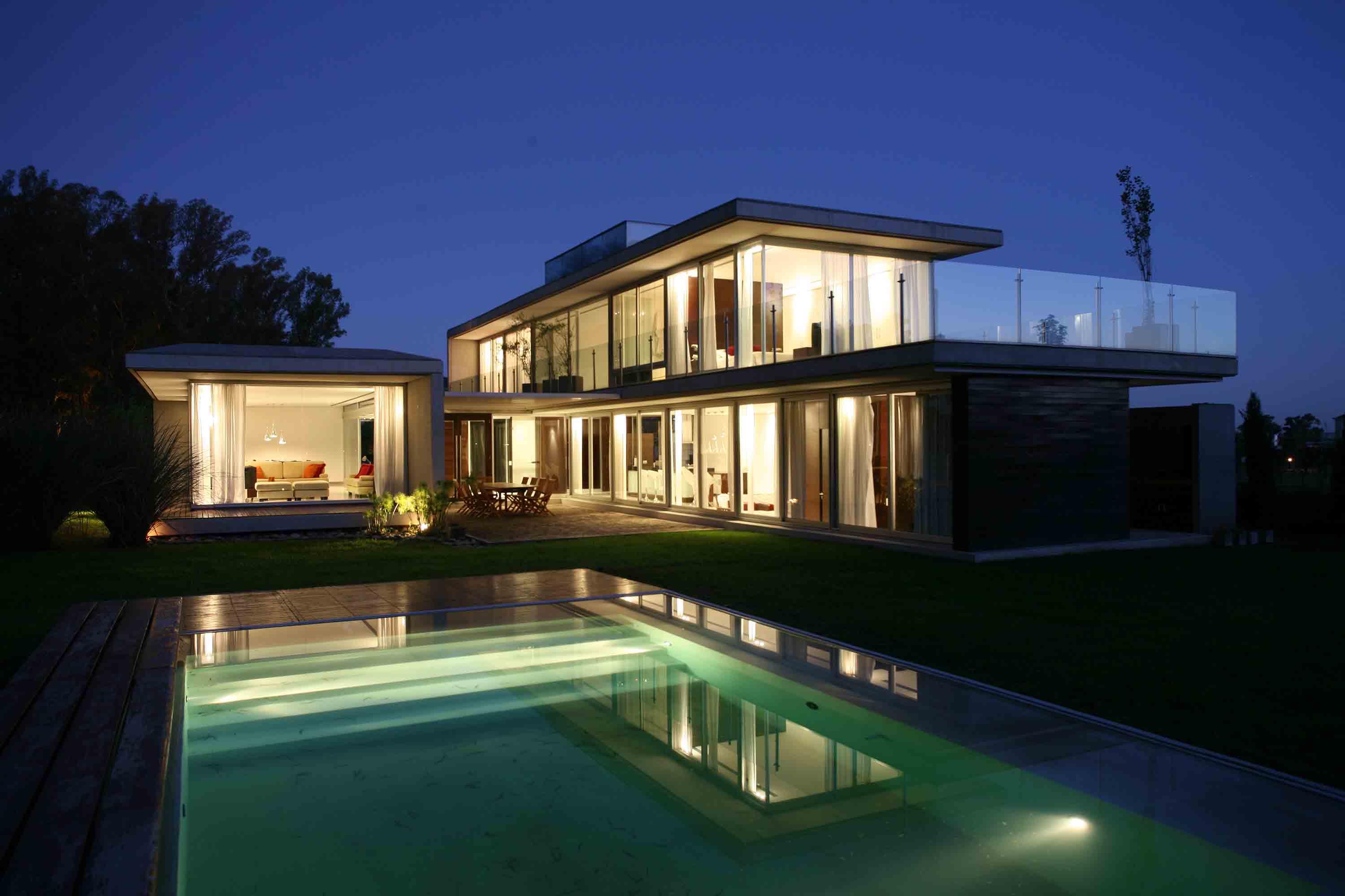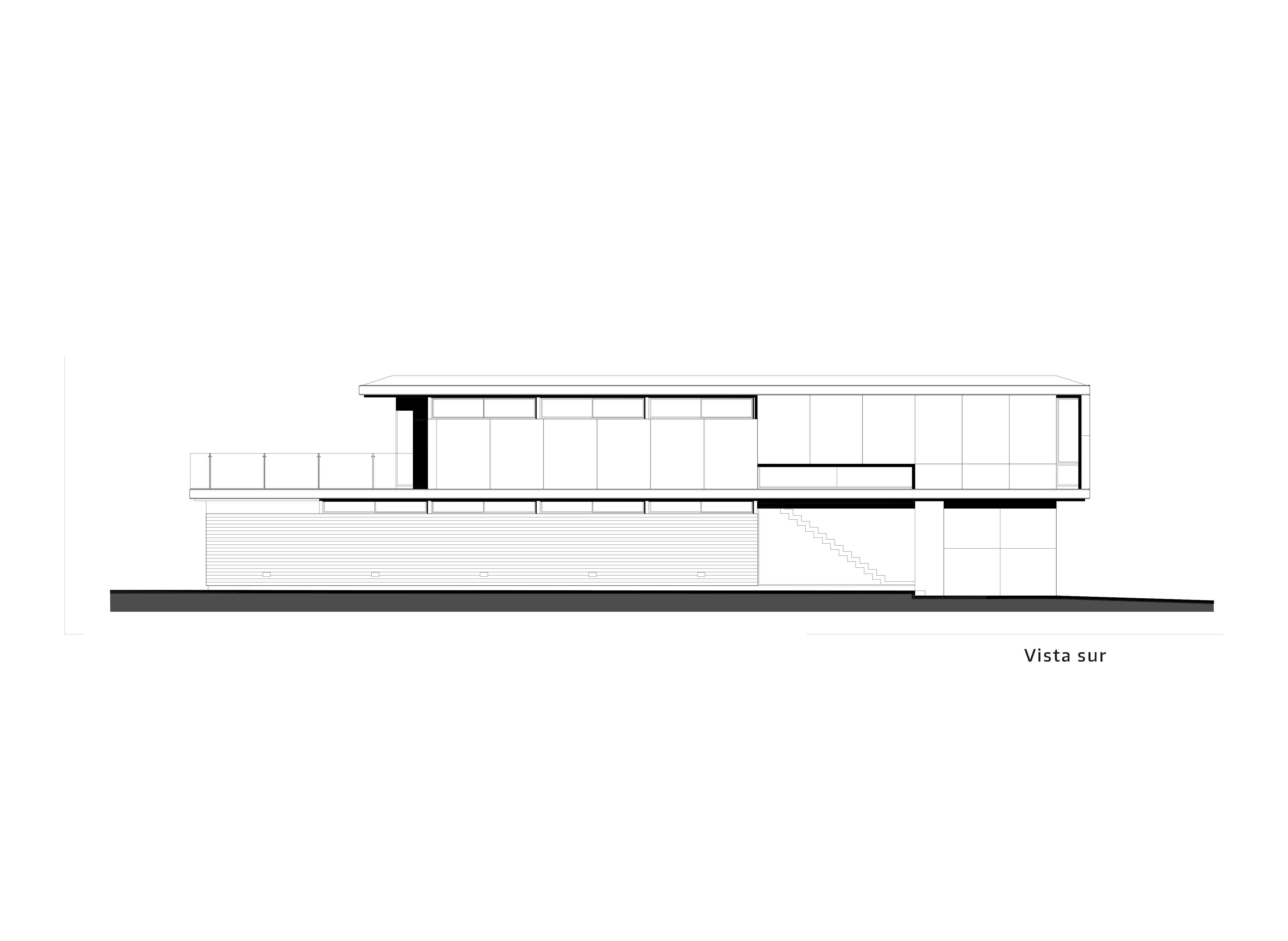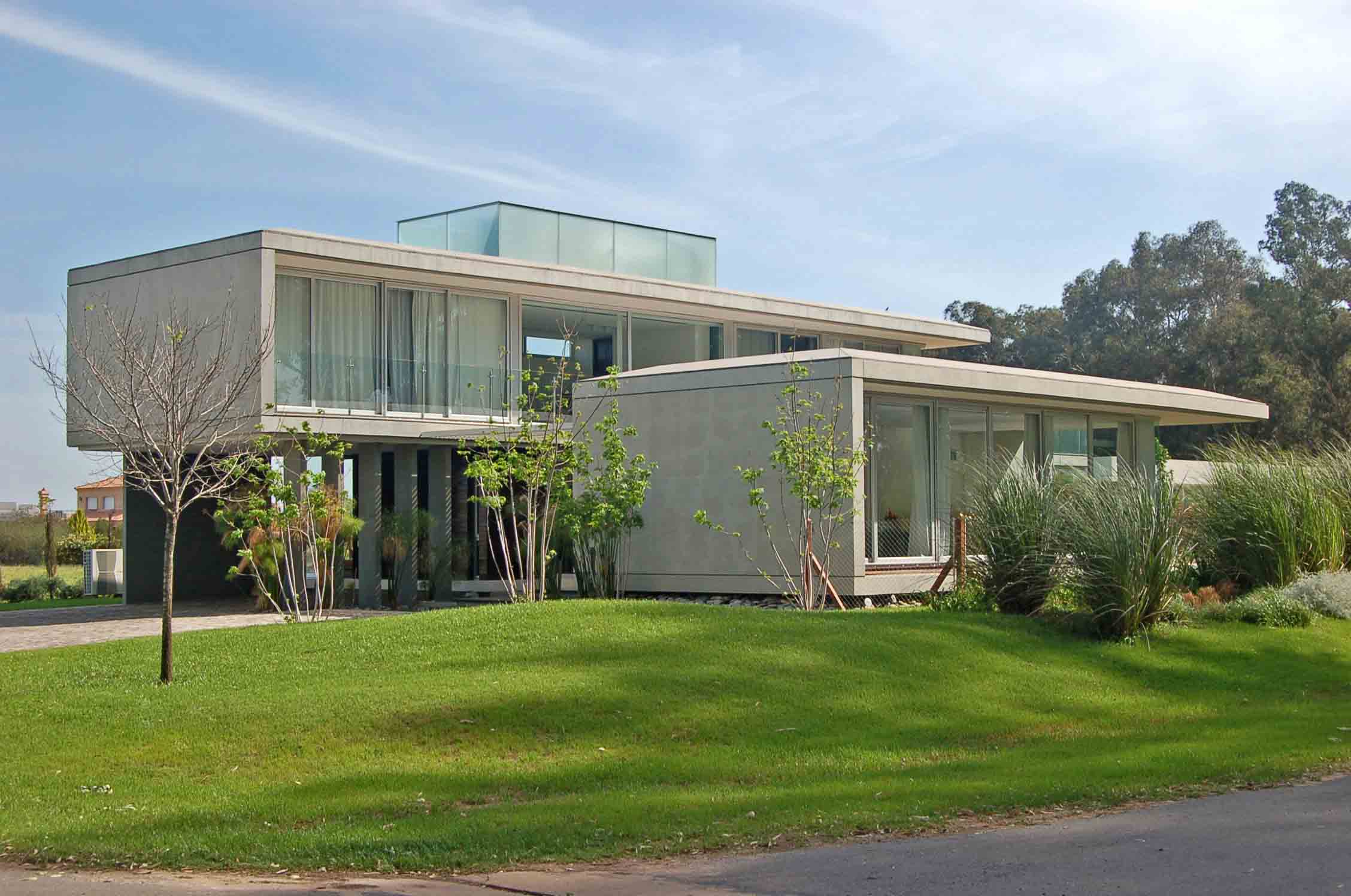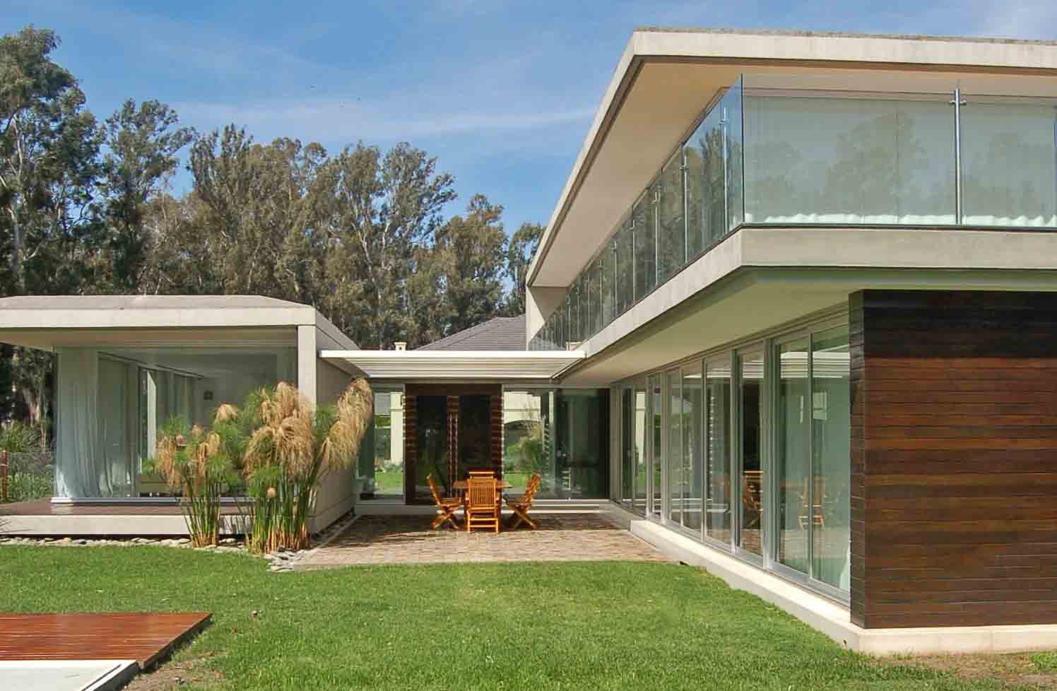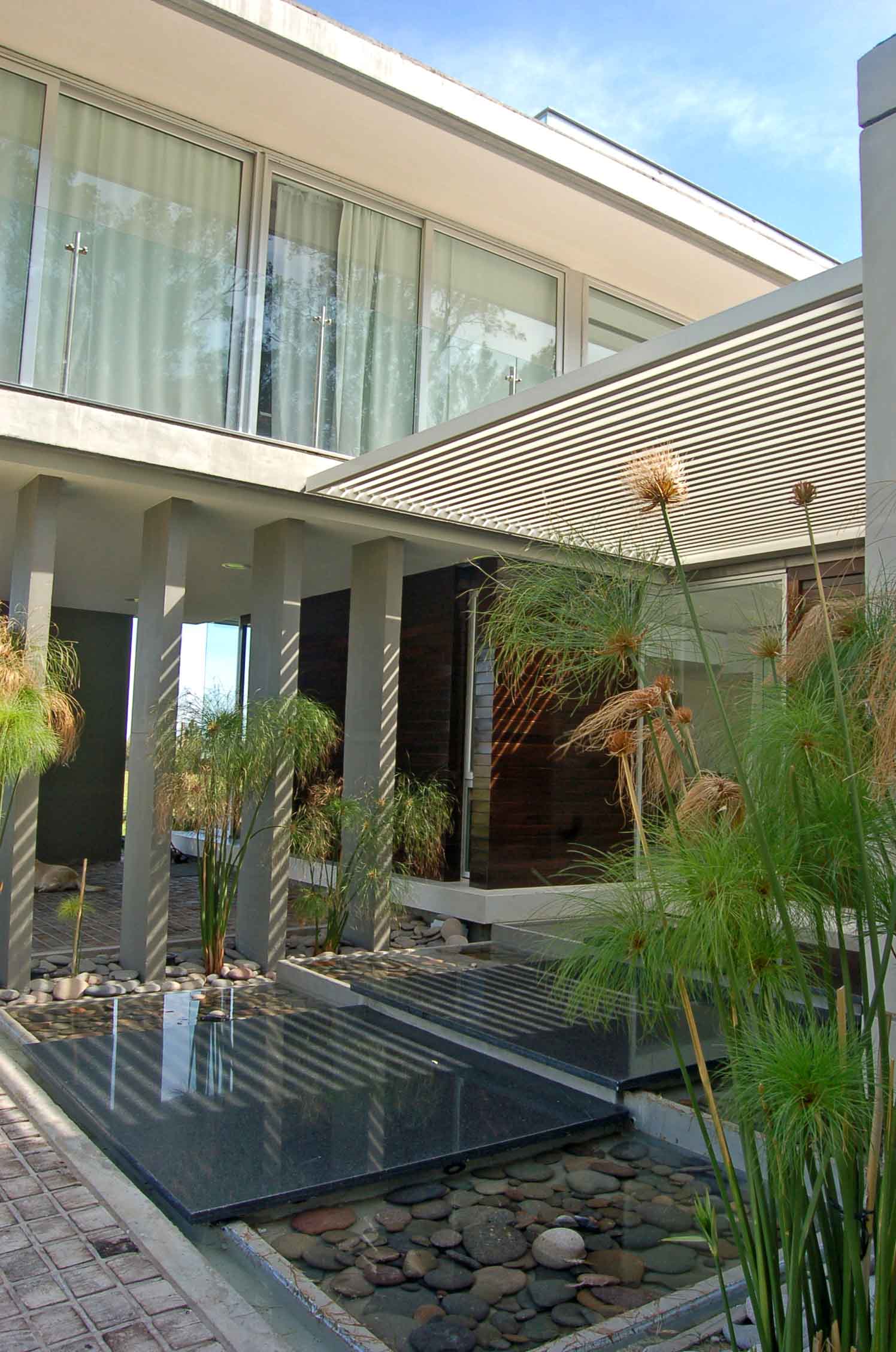 Recostada sobre el lateral sur del lote y abierta al norte, la casa se despoja de ornamentos; y propone formas abstractas con volúmenes austeros de líneas simples que dialogan con el paisaje por medio de la continuidad espacial a través de amplias superficies vidriadas y espacios intermedios, como ser pérgolas y galerías.
