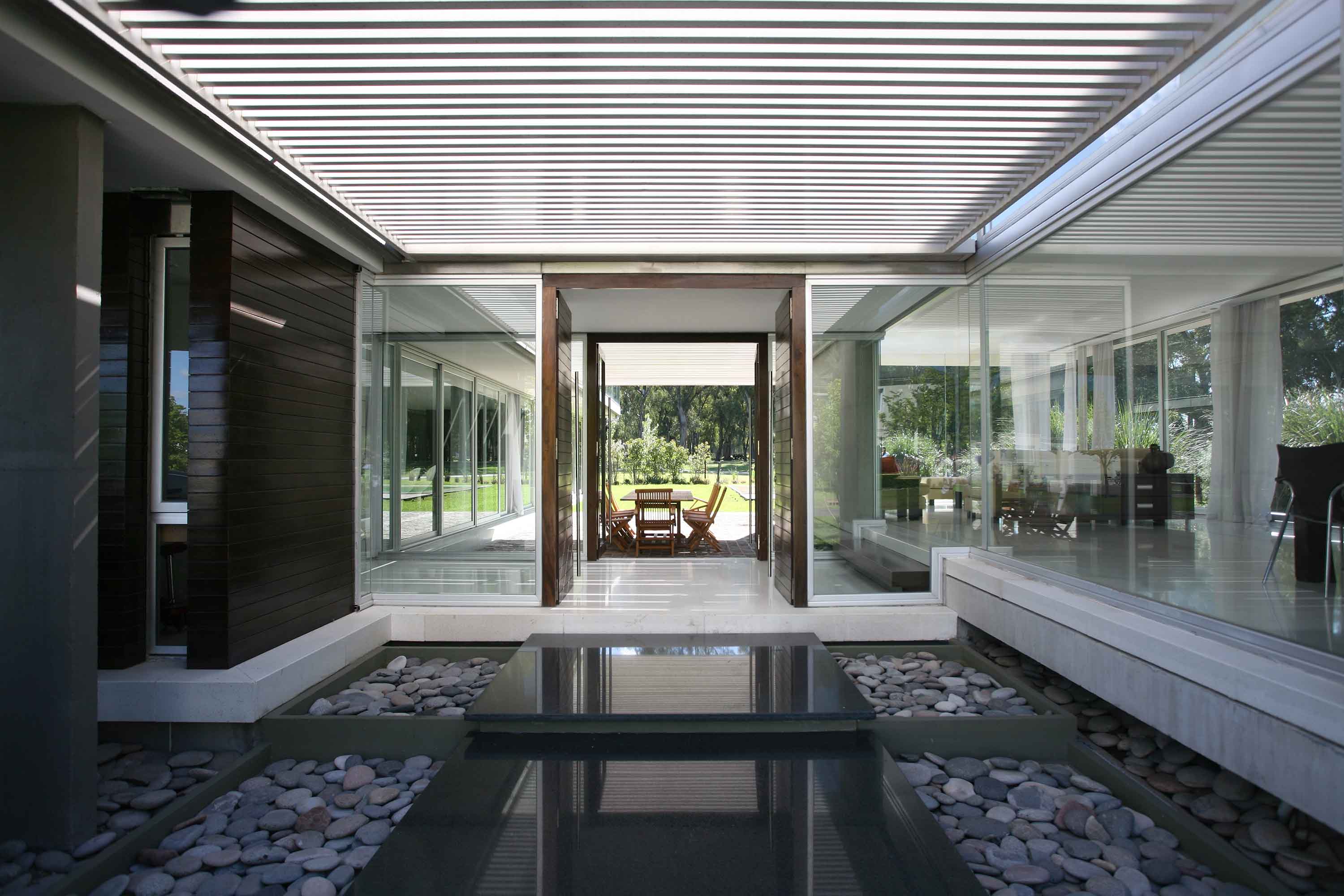 El fuelle entre estos cuerpos lo establece un espacio recoleto y semicubierto por medio de una pérgola metálica que oficia de umbráculo definiendo la expansión al exterior, como reinterpretación de las antiguas galerías de las casas de campo tradicionales que se constituyen en espacios de reunión en contacto directo con la naturaleza.
