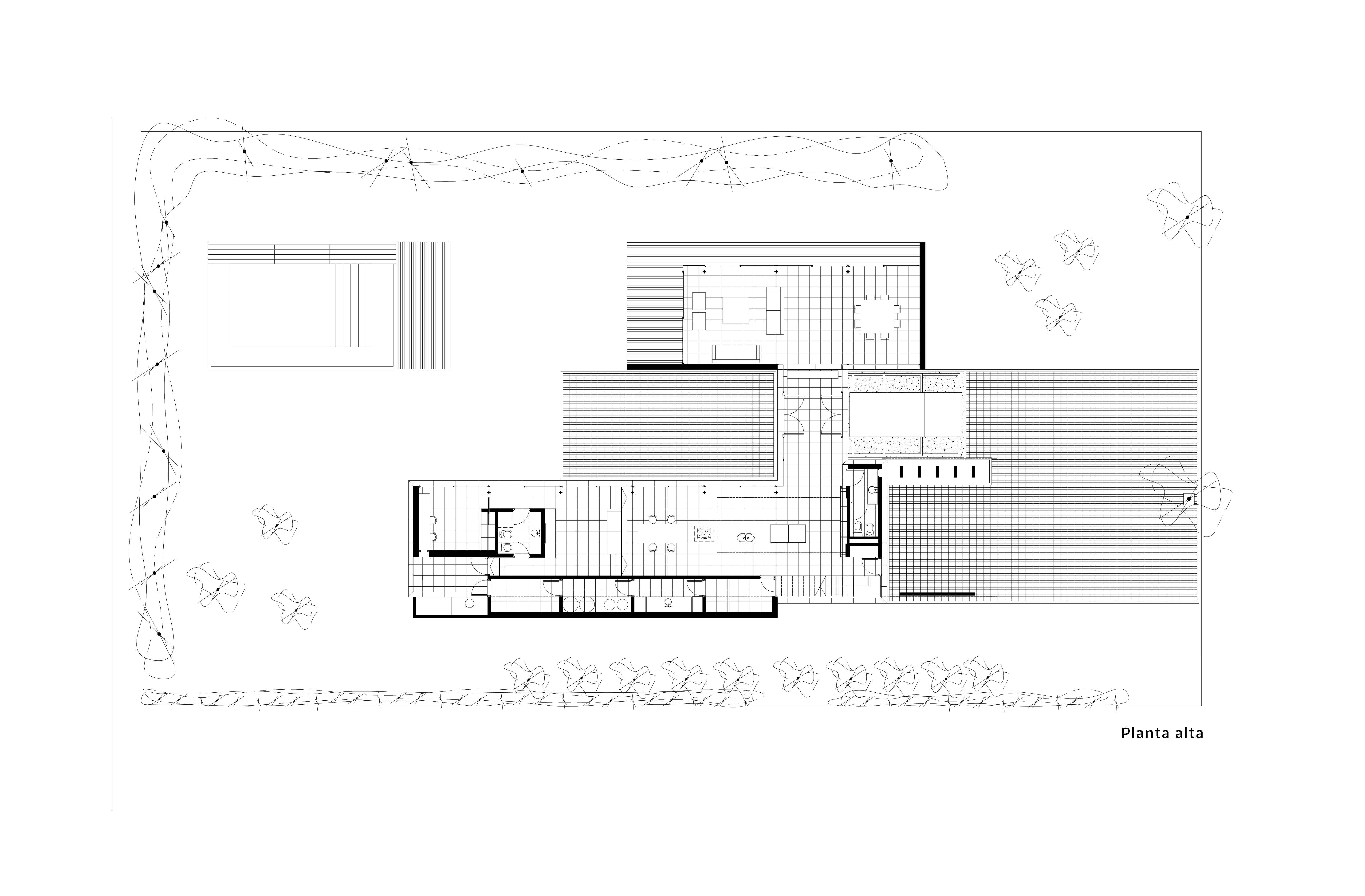 Dos prismas, unidos por un puente que define el ingreso, organizan el programa de necesidades. El más pequeño, suspendido sobre el terreno natural y al frente del lote, es el más expuesto y corresponde al ala social con la sala de estar y el comedor principal. El otro, de mayor porte y dos niveles, se asoma por detrás y resuelve la vida cotidiana y las funciones más privadas: la planta baja, con la cocina-comedor y la sala de juegos; la planta alta para los dormitorios en suite, separados espacialmente por la doble altura y vinculados por una pasarela que valconea hacia la barra de la cocina.