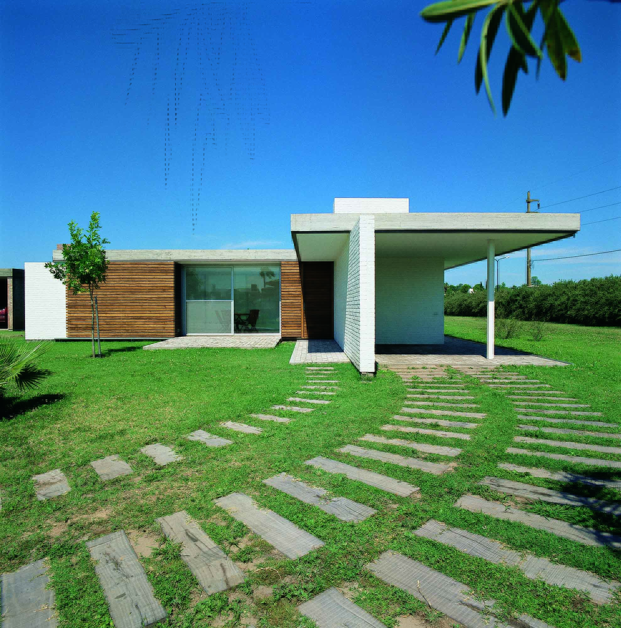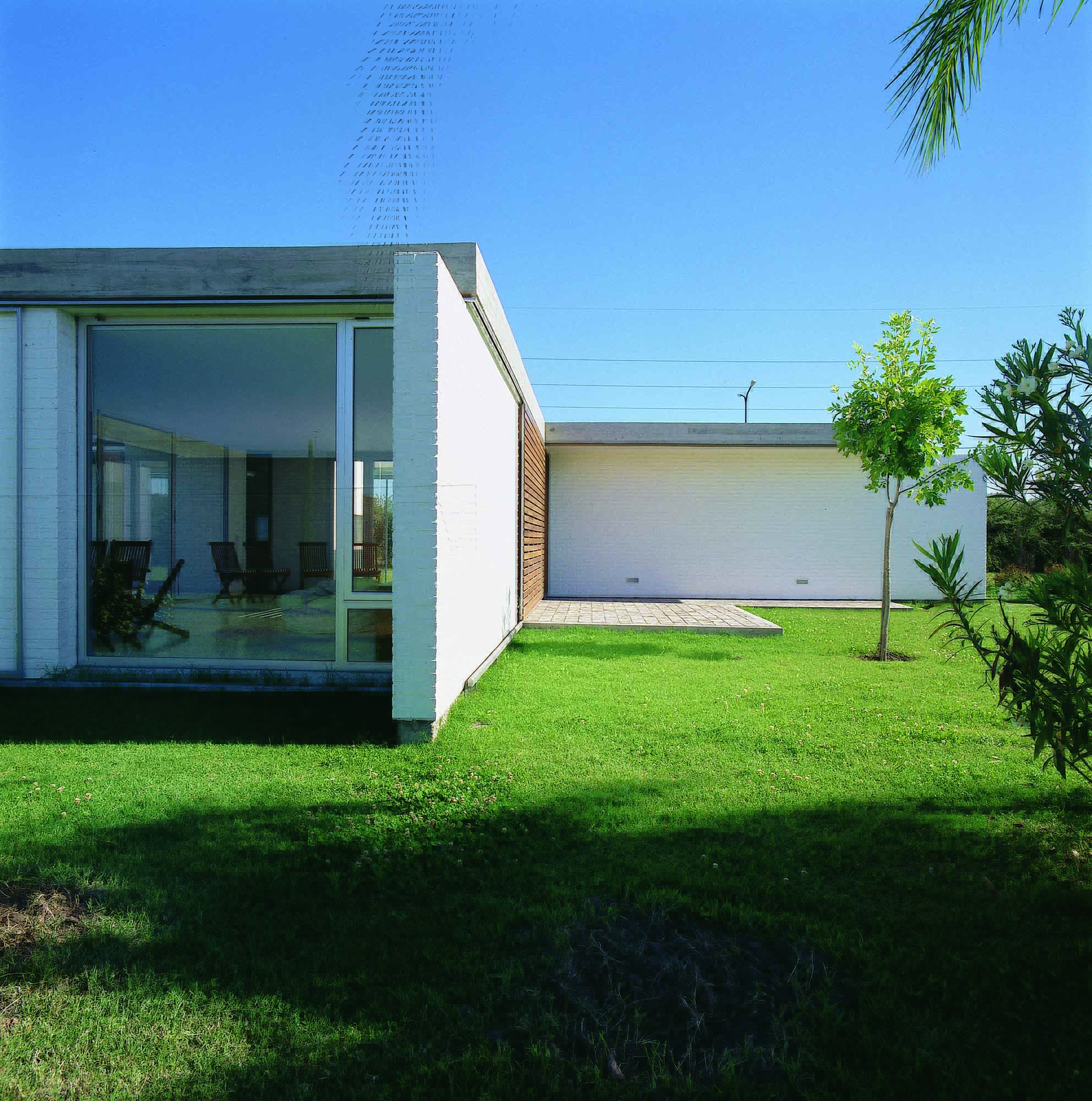 Como el proyecto responde a una vivienda alternativa para ser habitada los fines de semana y en el período de verano, se decidió racionalizar al máximo la superficie de los locales y mediante un planteo flexible incorporar la función de “quincho” en el mismo estar-comedor. Para ello la parrilla se ubica en un pequeño “patio de fuego”: una sala a cielo abierto, extensión recoleta del comedor que articula en planta la composición; y la acentúa en alzado con el volumen vertical que nuclea la chimenea y el tanque de reserva.