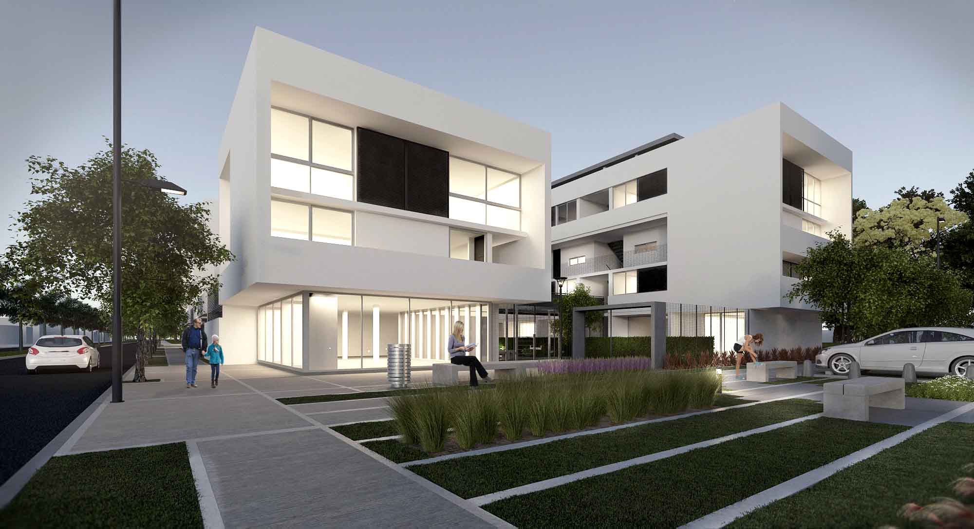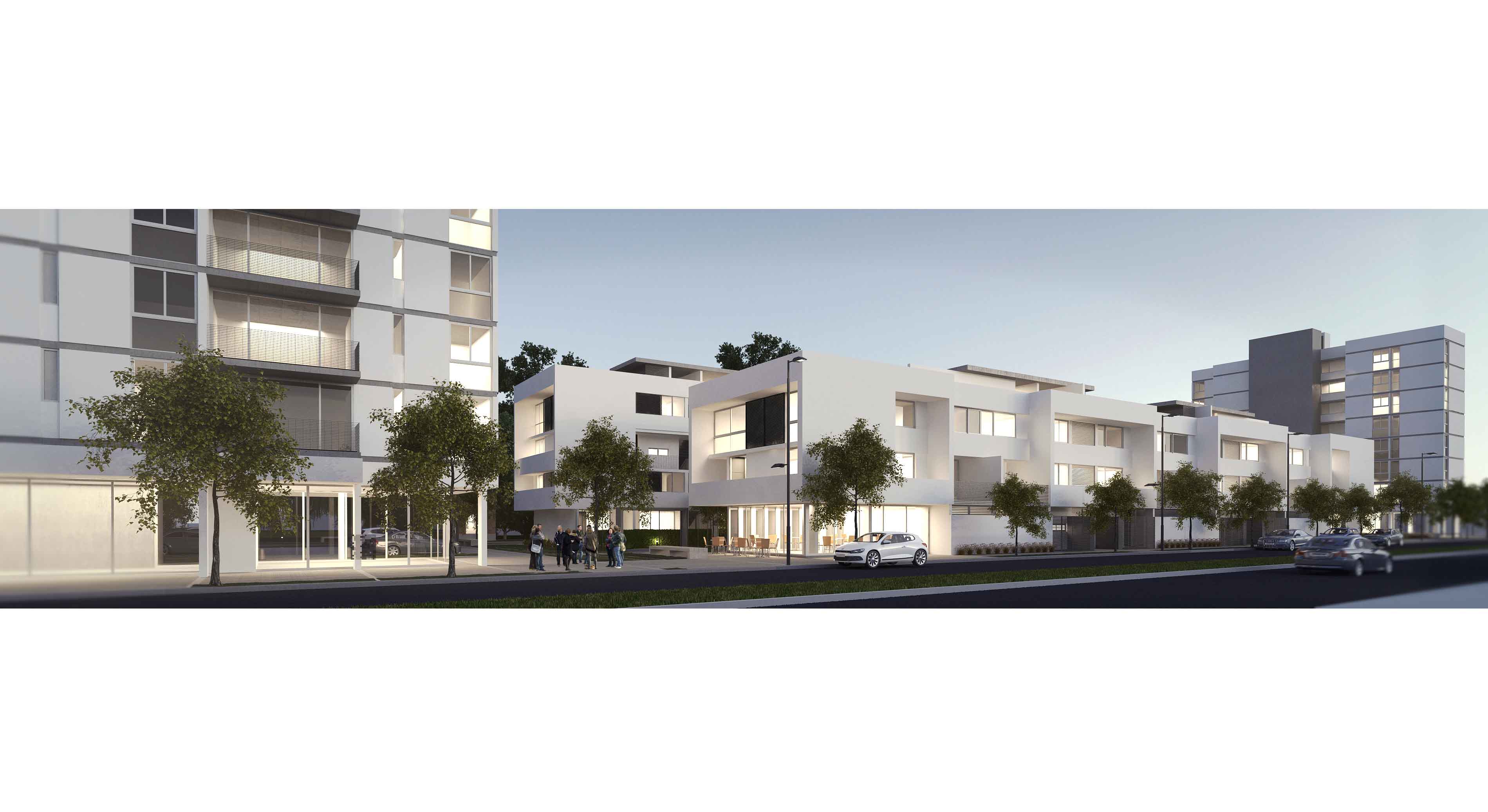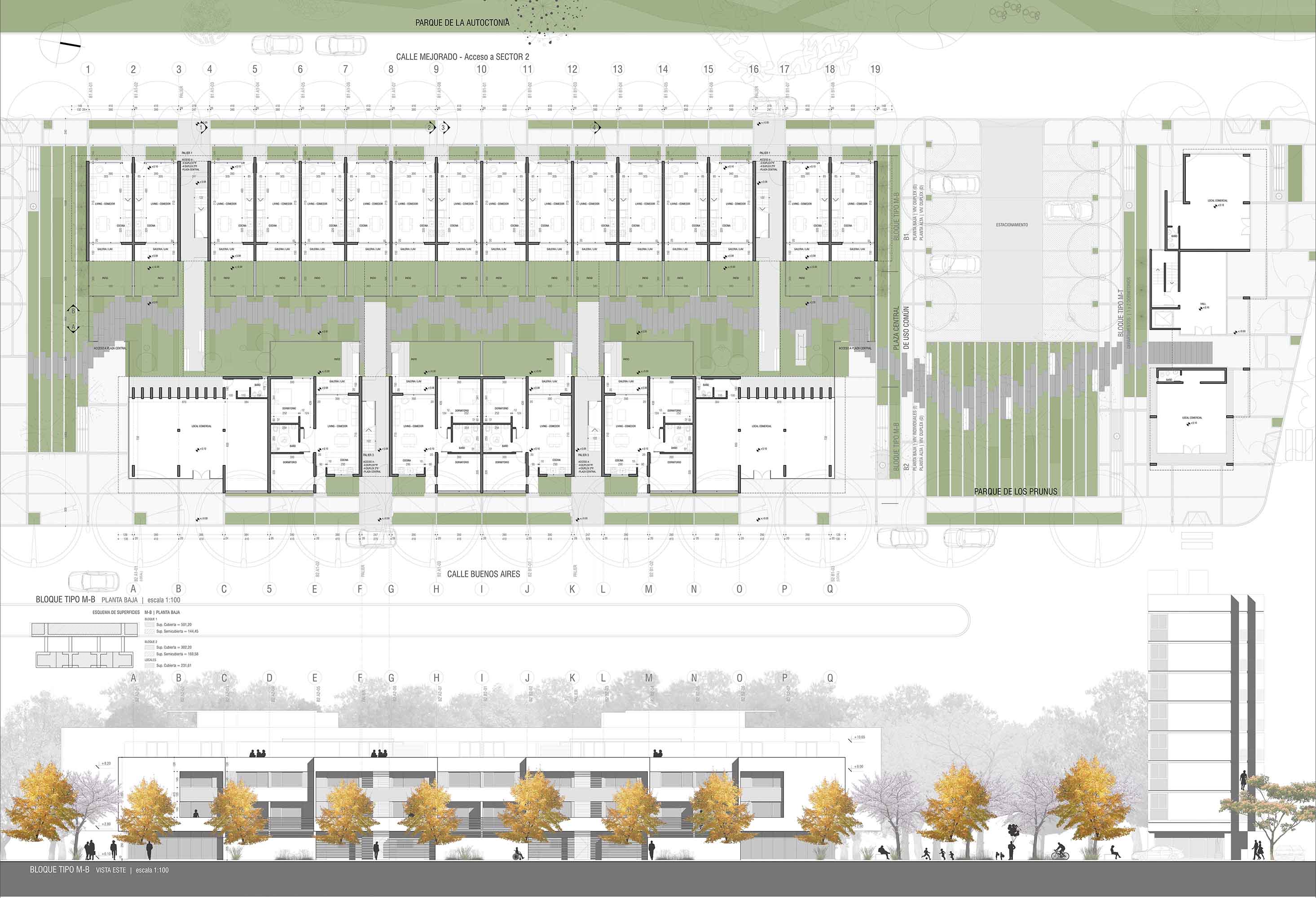 A fin de garantizar la habitabilidad residencial del conjunto como parte integrante de la macro forma de la ciudad se consideró imprescindible potenciar el frente de vida de la masa edificada vitalizando fundamentalmente la planta en contacto con el suelo. Esto se ha logrado controlando el espacio abierto en contacto con el suelo definiendo los porcentajes destinados a uso común y a uso exclusivo, para obtener un equilibrio que garantice tipologías de viviendas con jardín o patio propio alentando el carácter residencial en contrapartida a los inconvenientes surgidos por la falta de apropiación del espacio abierto por parte de sus habitantes en los antiguos planes de vivienda de la Nación. Así todos los prototipos en contacto con el suelo poseen expansión propia al exterior con parcelas delimitadas por setos verdes que se integran al paisaje natural del espacio colectivo central.