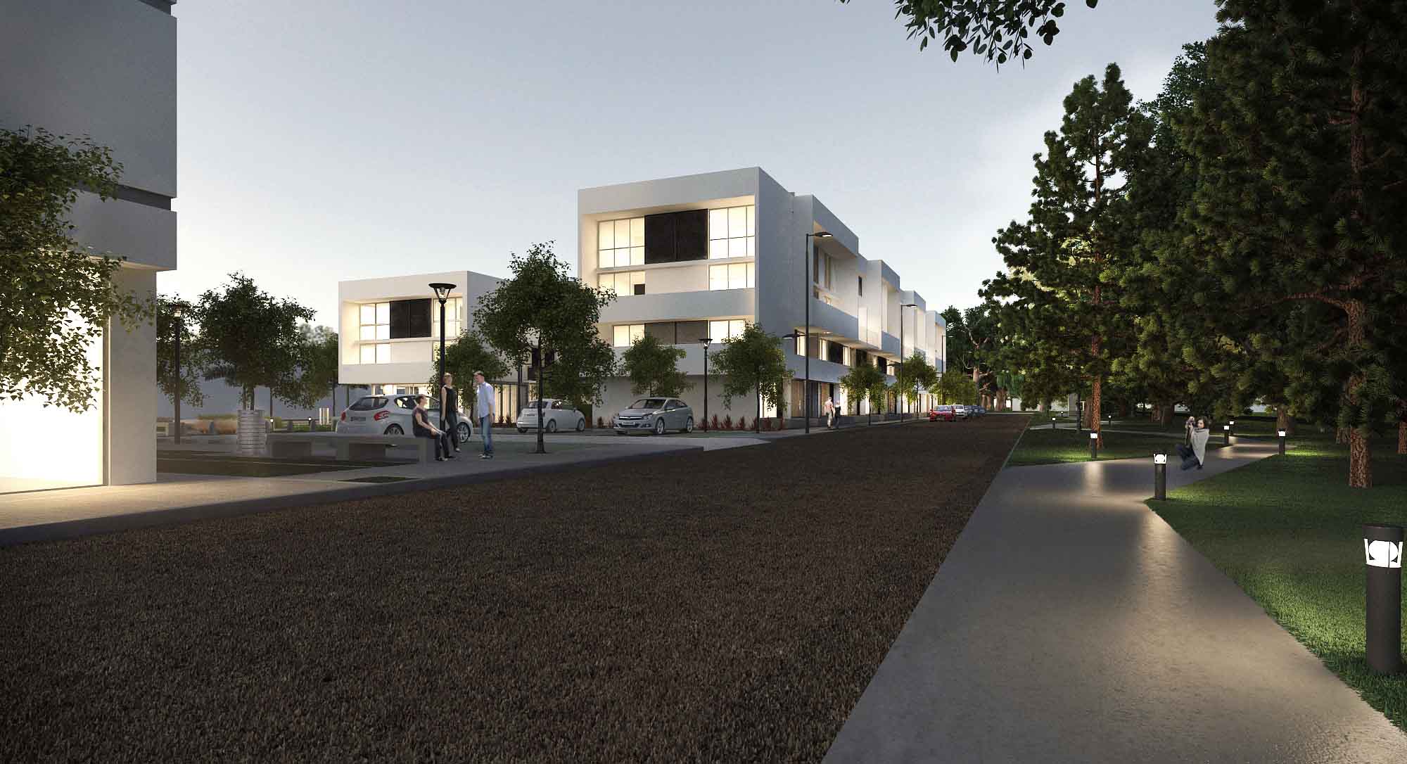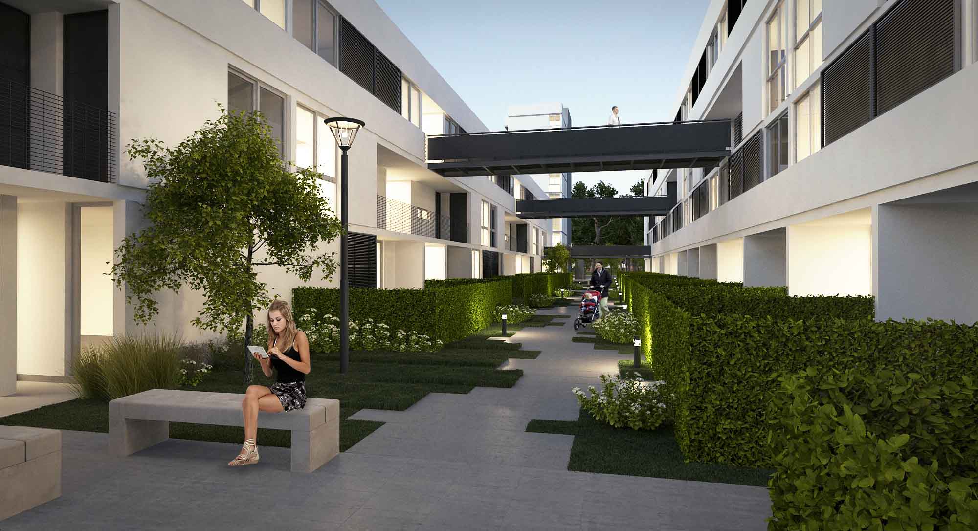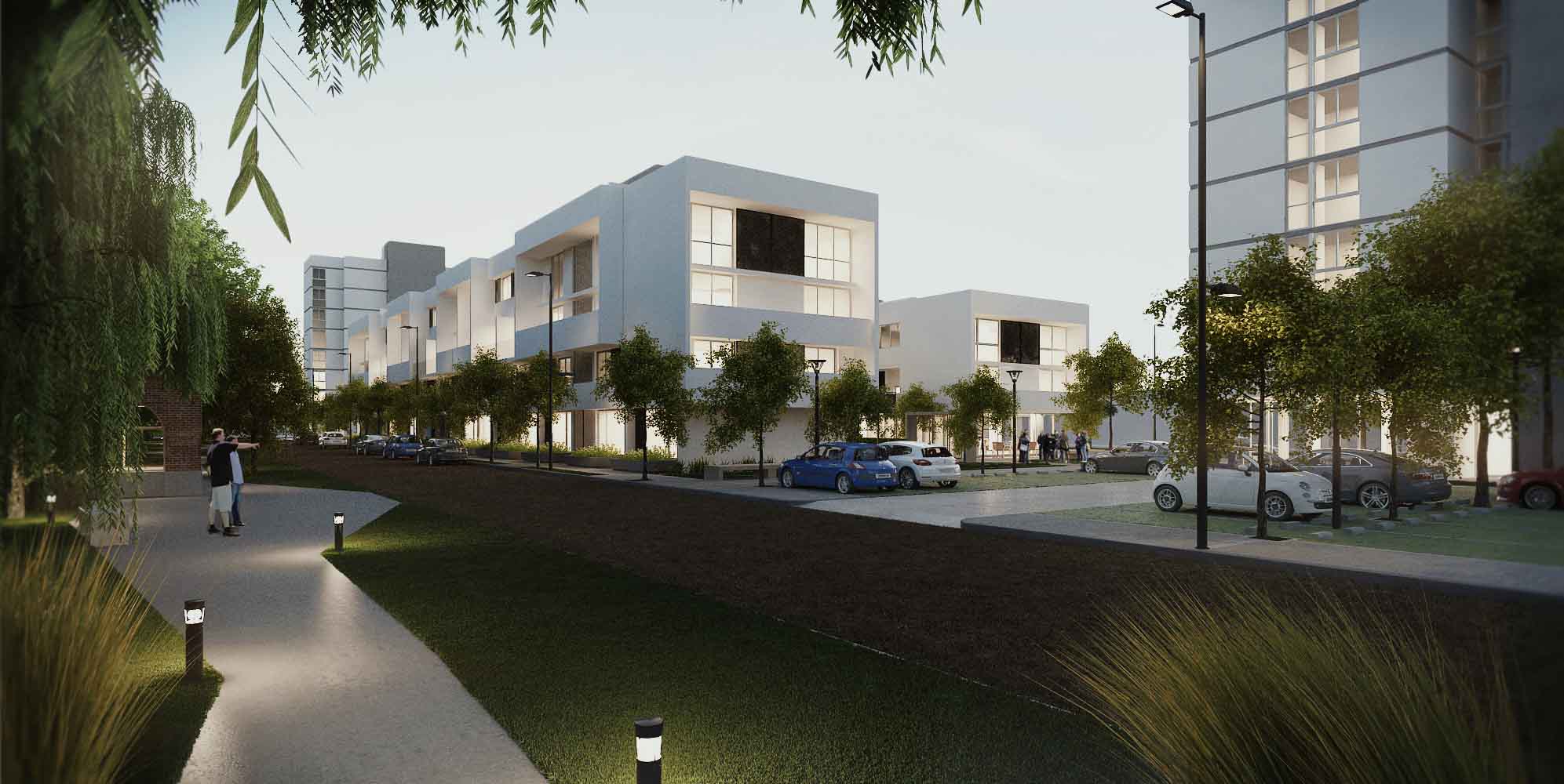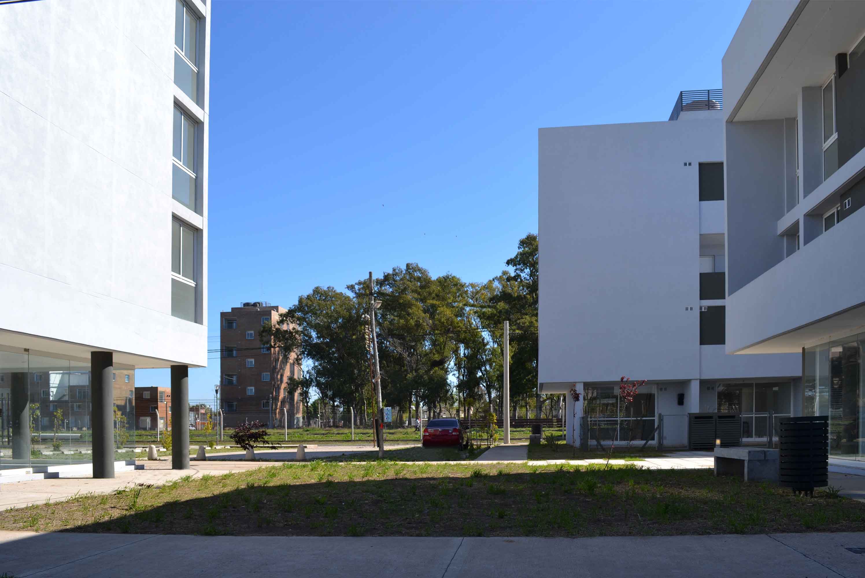 Aumentar la distancia entre las tiras de vivienda multifamiliar generando un espacio privado de uso colectivo con diferentes estaciones de equipamiento (deportivo, recreativo infantil y ocio). Se consolidó así, un espacio central de encuentro que recrea la identidad barrial representada por “la vida en la vereda”, permitiendo proveer de un acceso alternativo a las unidades de planta baja y a los núcleos de escaleras para los dúplex en altura a través de un recorrido acentuado por la presencia del paisaje natural que a su vez se conecta con el resto de los espacios recreativos públicos vertebrándolos en una idea de conjunto. Este resultado se obtuvo ajustando el ancho a 8 metros de calzada y a 2,40 el ancho de vereda de la calle que separa el espacio verde del FFCC con el frente oeste del conjunto; operación posible considerando su reducido tránsito vehicular por ser una arteria interior de la propia urbanización del sector.