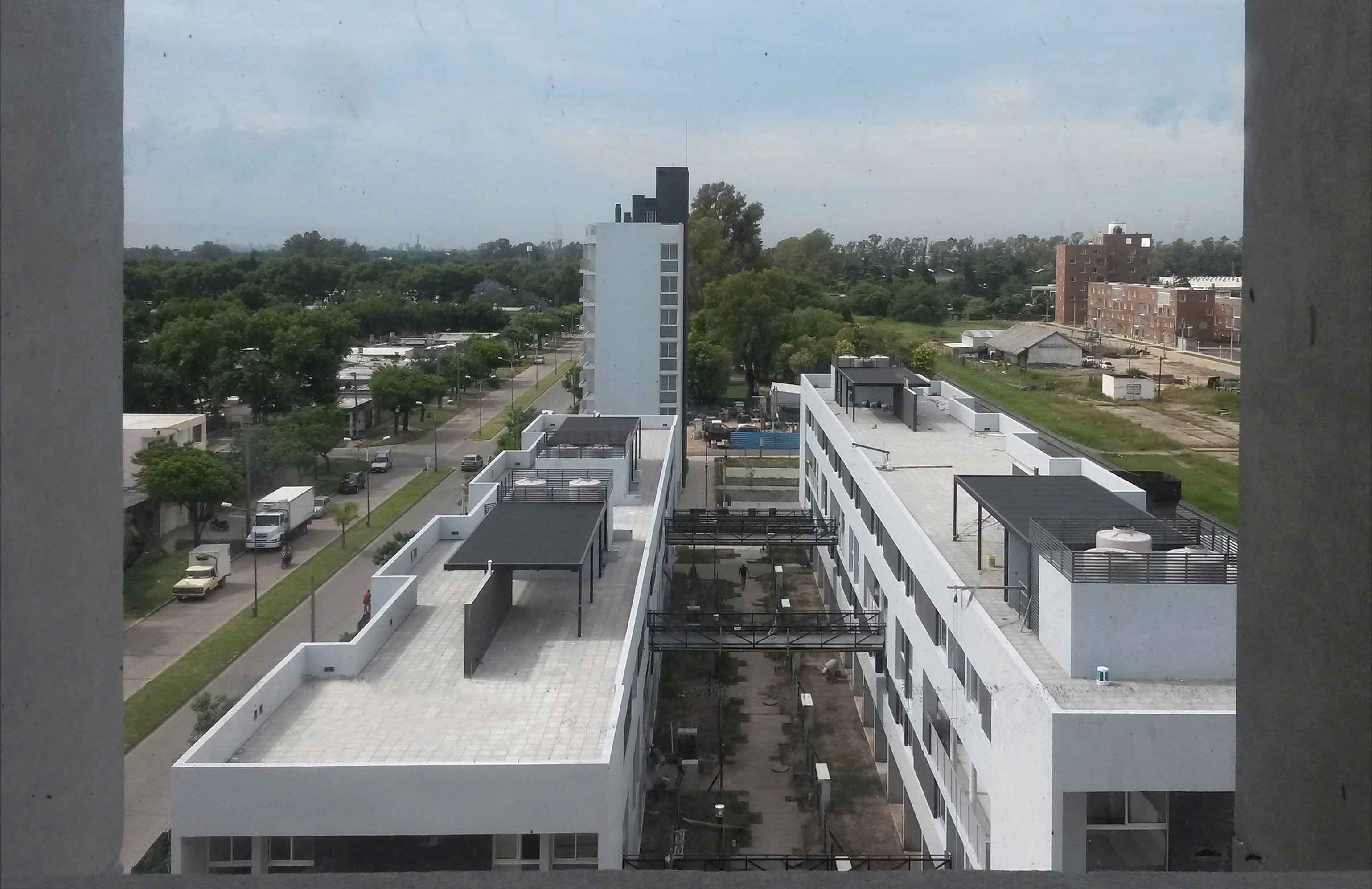 Las vías dividen una ciudad más desarrollada hacia el Este y una menos hacia el Oeste, dejando en el medio grandes lonjas verdes con la presencia de antiguas edificaciones aisladas, algunas adaptadas a nuevos usos como la vieja estación, una añosa arboleda que identifica el sector y un entorno residencial ambiguo de baja altura conviviendo con equipamientos industriales de gran escala como lo es la planta de John Deere. En síntesis, “un lugar con identidad propia”, que intentamos intervenir con alta calidad ambiental respetando los principales lineamientos proyectuales enunciados en las bases del concurso; a saber: