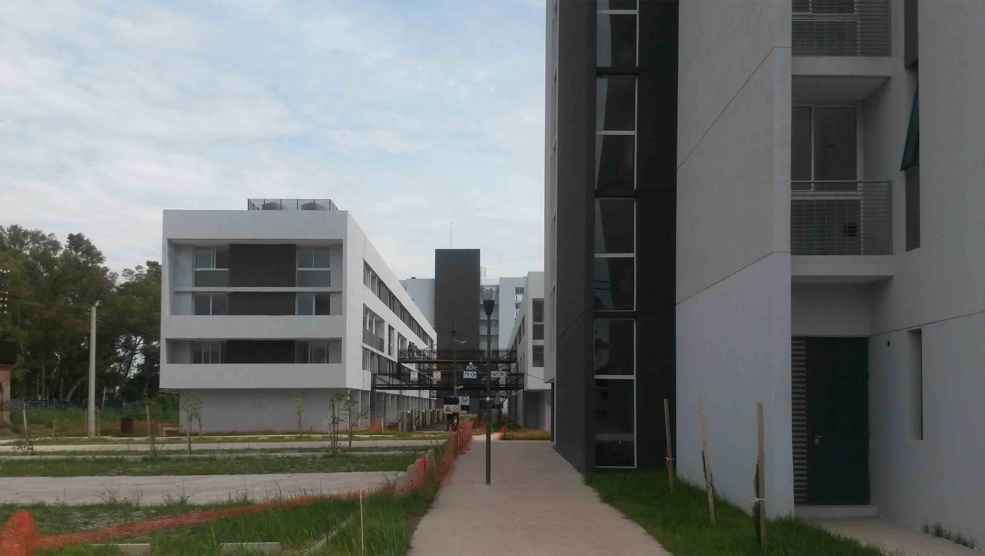 Al respecto, la decisión más significativa fue haber optado por ladrillos huecos cerámicos y revestimientos continuos para la envolvente arquitectónica descartando el ladrillo visto u otro material al desnudo. Inconvenientes en la fabricación y provisión de este último material para obras de escala masiva de acuerdo a experiencias locales padecidas en los últimos tiempos, sumado a la dificultad de obtener mano de obra calificada para su ejecución (máxime por tratarse no solo de construcciones bajas sino también de edificios en altura), llevaron a la elección enunciada precedentemente, convirtiéndose en una alternativa de materialidad de probados y eficaces resultados, aplicada con técnicas constructivas modernas que redundan en una expresión contemporánea.