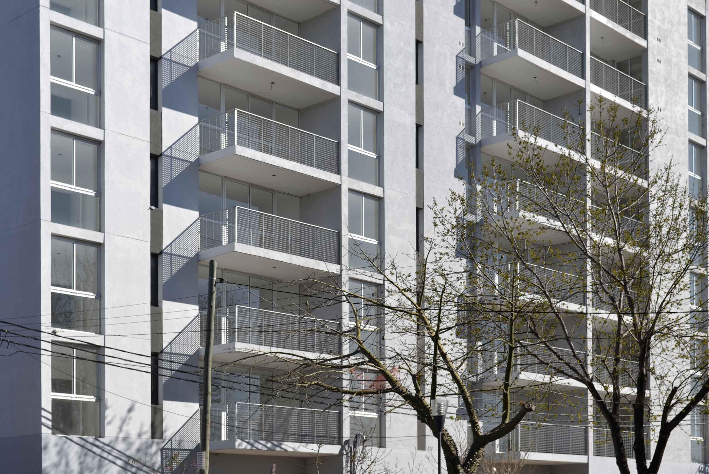 En el edificio en altura, con el desfasaje de 1,5 m entre las tres unidades de vivienda se ha logrado incorporar los balcones a la propia volumetría del edificio evitando visuales cruzadas entre los mismos con el propósito de acentuar la privacidad de cada departamento.