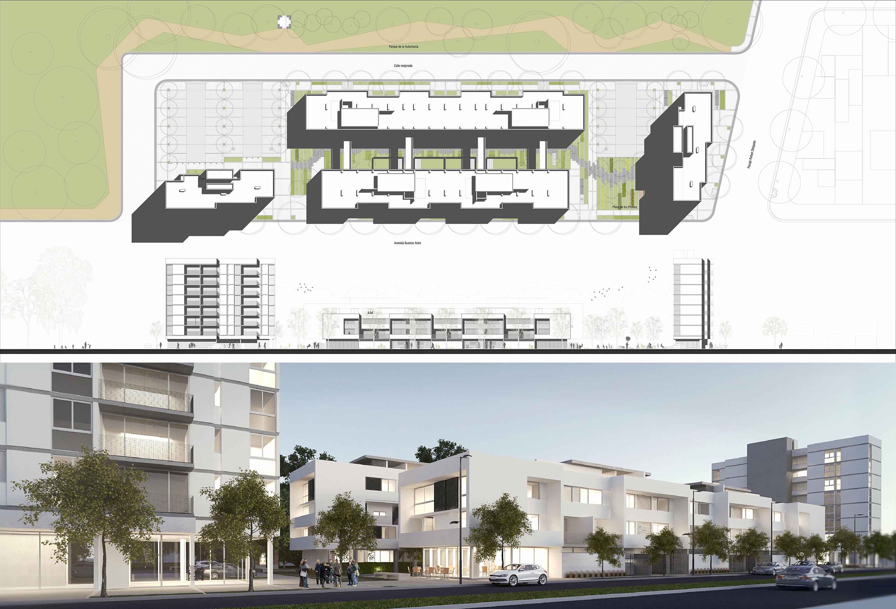 Rotar la planta de los dos sectores de estacionamiento de acuerdo a la lógica estructuradora de toda la intervención. Respetando la cantidad de espacios para vehículos indicada por los planos y planillas de superficie de las bases de concurso, con esta variable organizativa se adecuó cada sector a su área de emplazamiento dentro de la urbanización, abasteciendo a cada cuerpo edilicio con recorridos claros y cercanos a los accesos, favoreciendo la integración entre el frente Este y el Oeste mediante francas circulaciones continuas que entrelazan las plazoletas sobre la avenida Buenos Aires con la franja verde del FFCC.