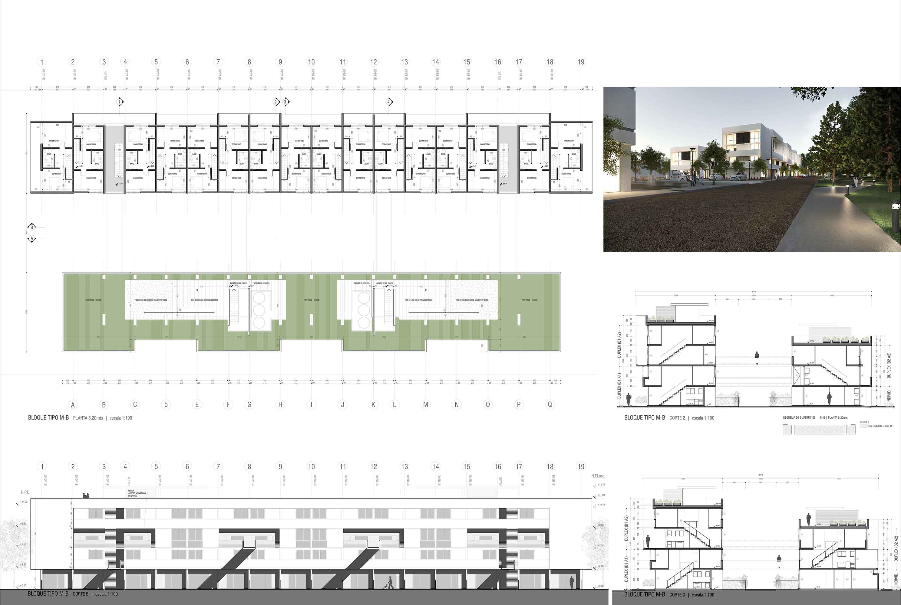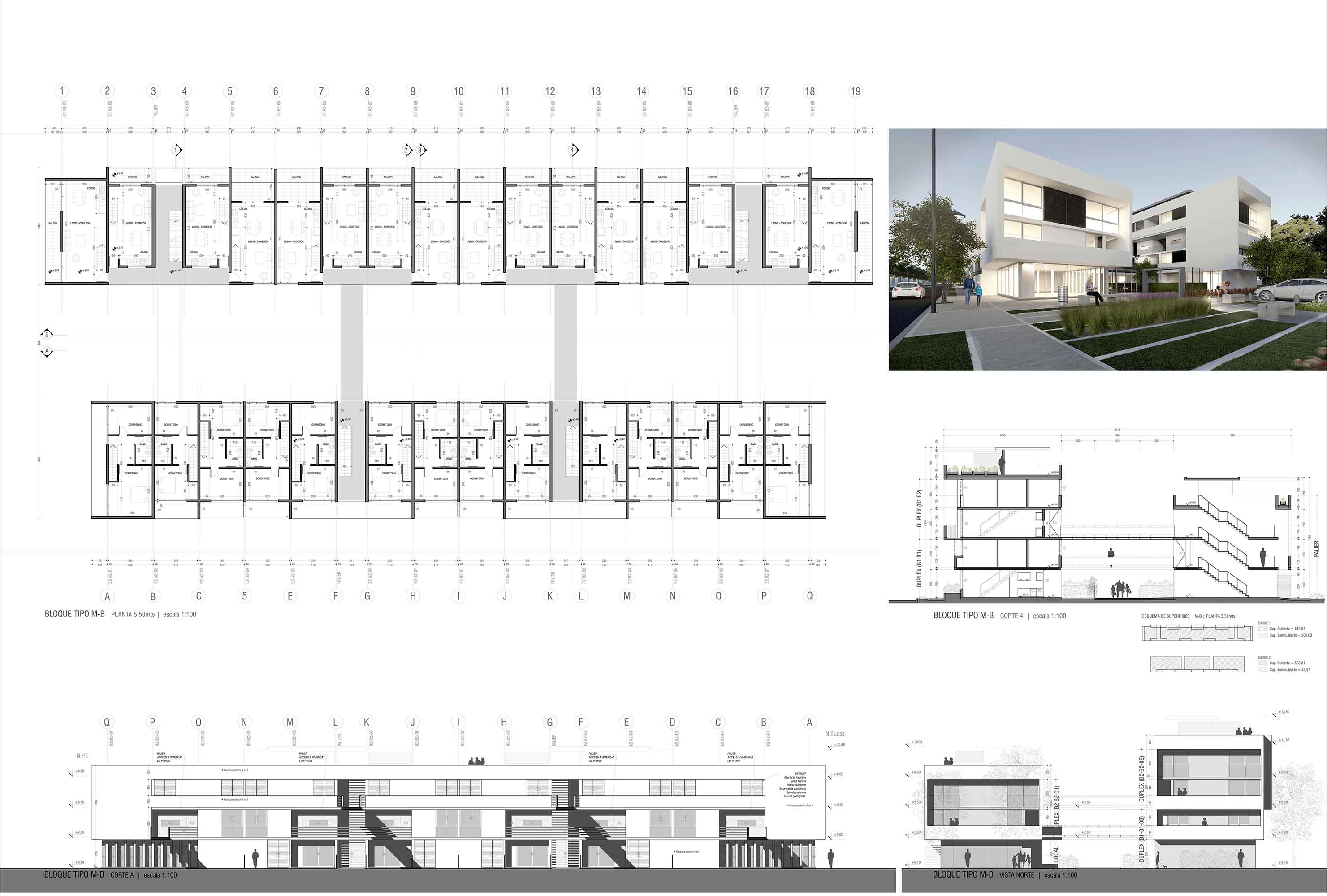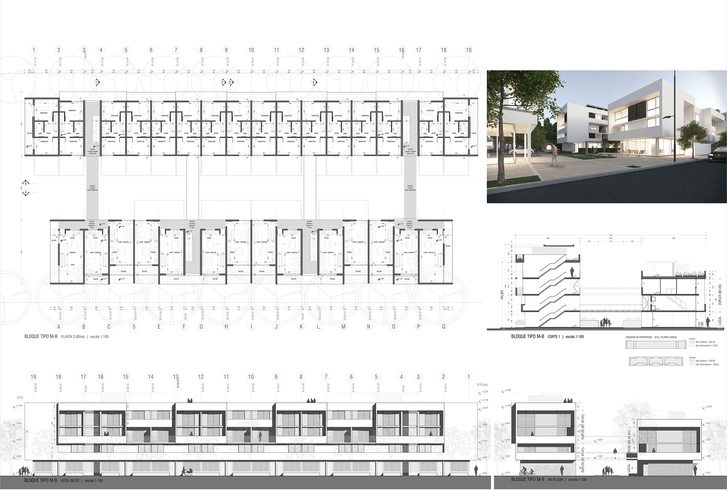 Si bien el diseño de las envolventes arquitectónicas se correspondió con el desarrollo y las presiones internas de las plantas, el modelado de las elevaciones y volumetrías incluyeron también las condicionantes urbanas más relevantes, como ser que las unidades de viviendas que ocupan las cabeceras de las tiras de dúplex se giren para obtener una fachada viva frente a los espacios verdes del conjunto, o que los balcones de los cuerpos en torre estén todos dispuestos de acuerdo a la mejores orientaciones sin obviar otras valoraciones como ser potencializar las visuales más convocantes a través de la incorporación de las vistas al río Paraná en el caso del emplazado sobre Av. Buenos Aires o la generación de perspectivas profundas al bosque de añosos eucaliptos desde el ingreso a los departamentos ubicados al Oeste en la planta del edificio sobre Pasaje Rafael Obligado.