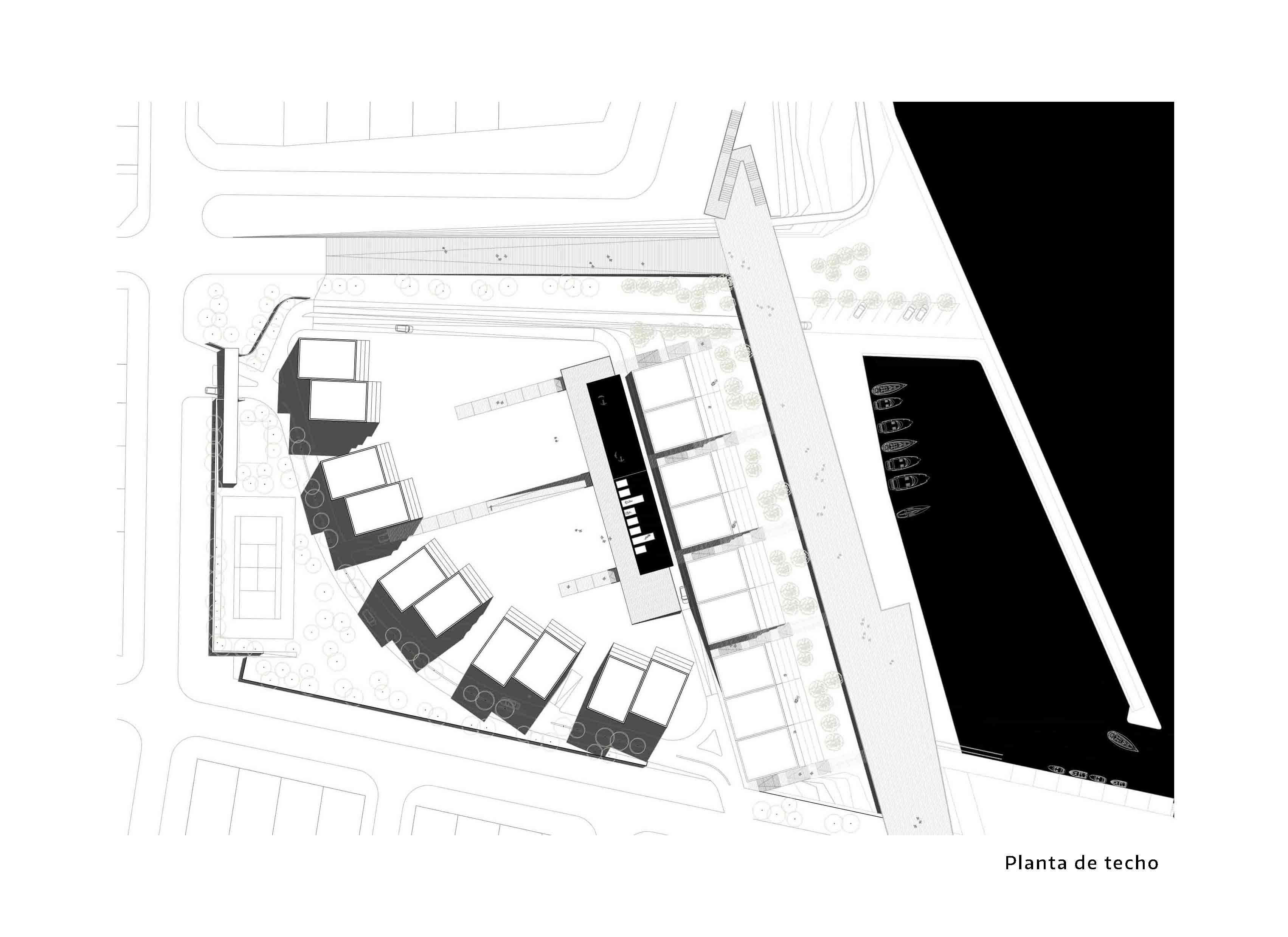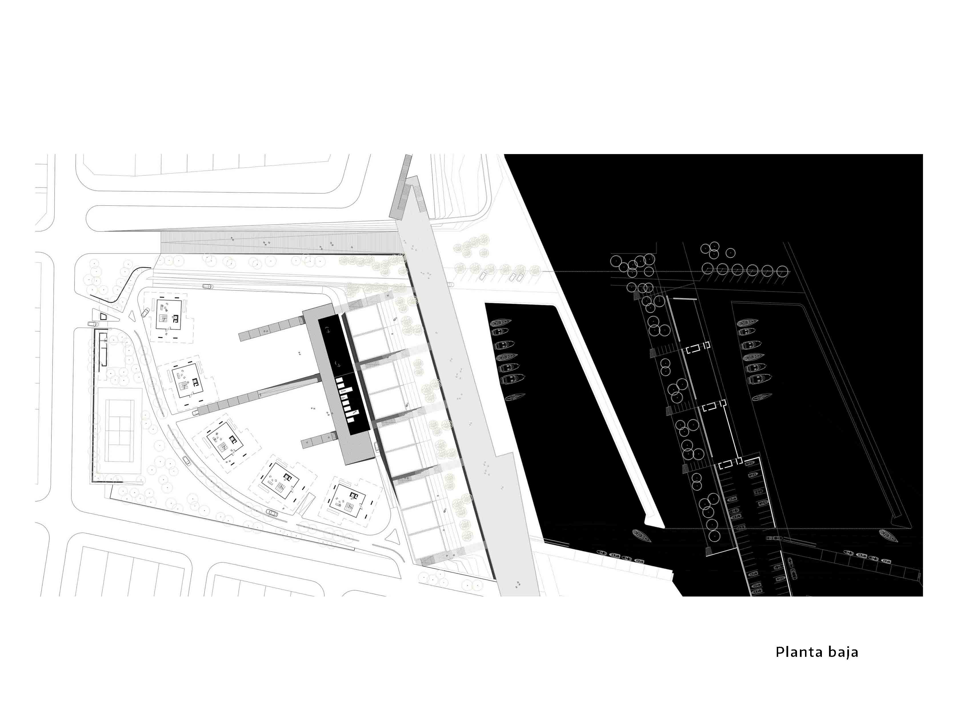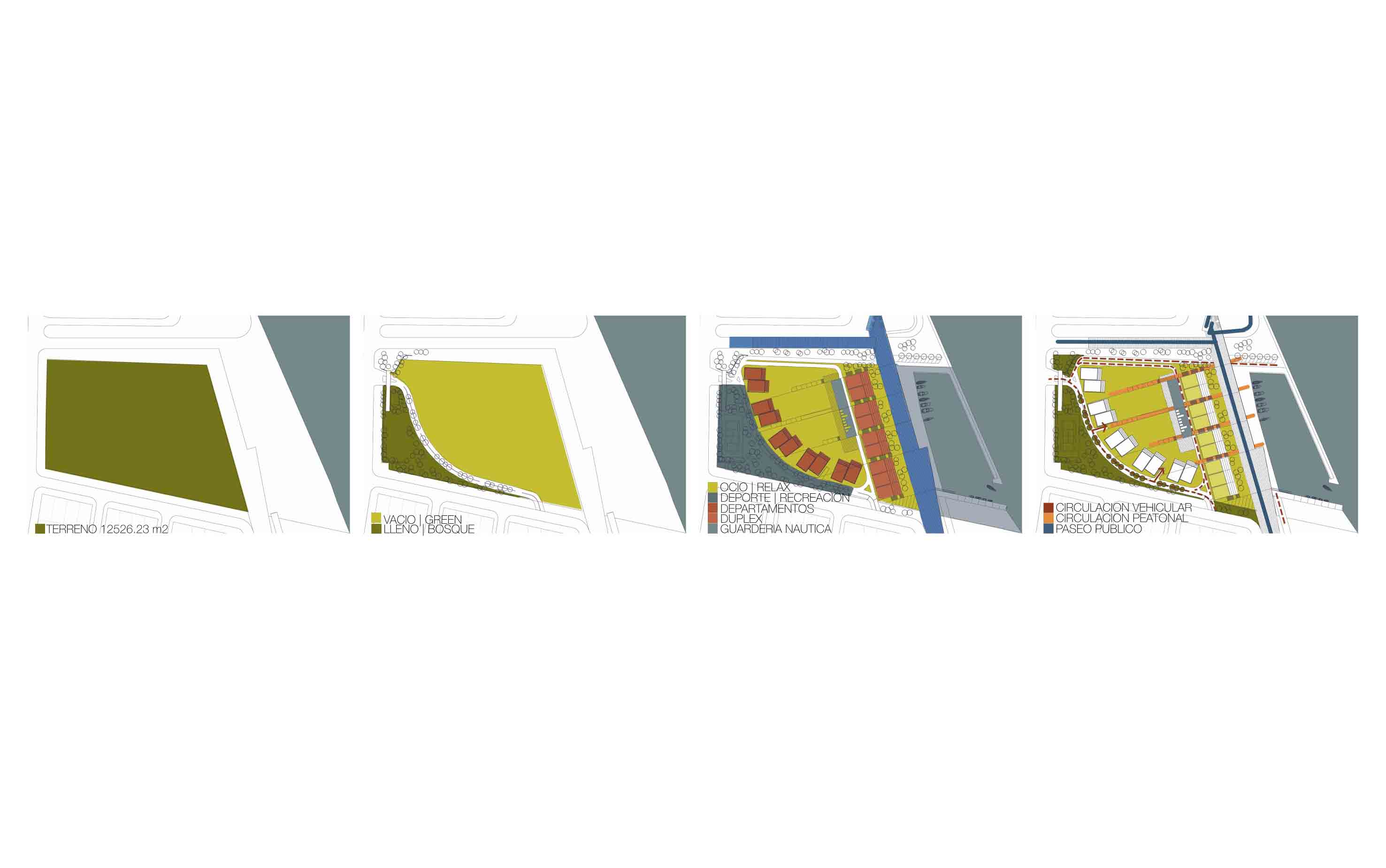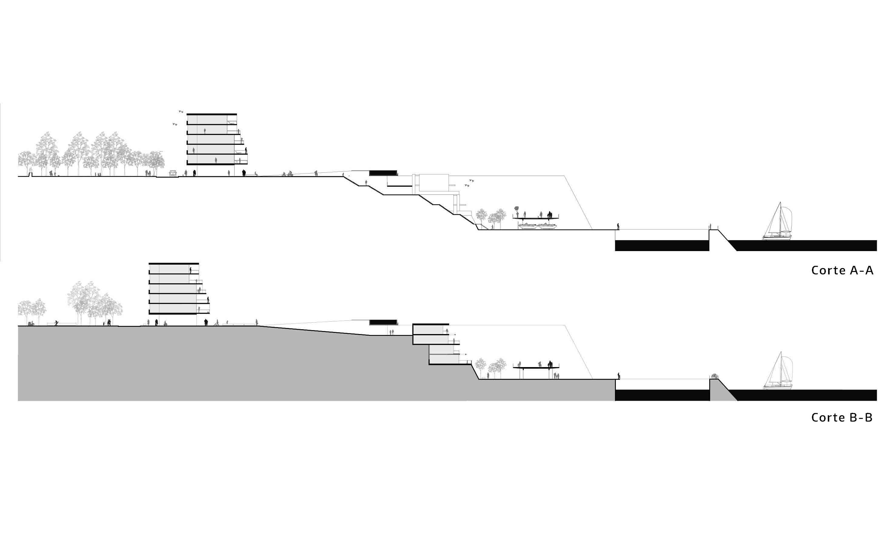 Así, el proyecto resuelve disponer la masa edificada garantizando las visuales al rio de todas las unidades de viviendas generando distintas tipologías mediante el aprovechamiento de la diferencia de cotas de la barranca. El resultado es un conjunto que combina cuerpos elevados de perímetro aislado y de planta baja libre y cinco pisos altos sobre el nivel de calle con una tira aterrazada, recostada sobre la barranca que consolida el frente costero junto a un sector de amarradero, guardería náutica y demás usos comunes del conjunto, cuya cubierta se define como un paseo peatonal para garantizar la continuidad del uso público de la rivera.