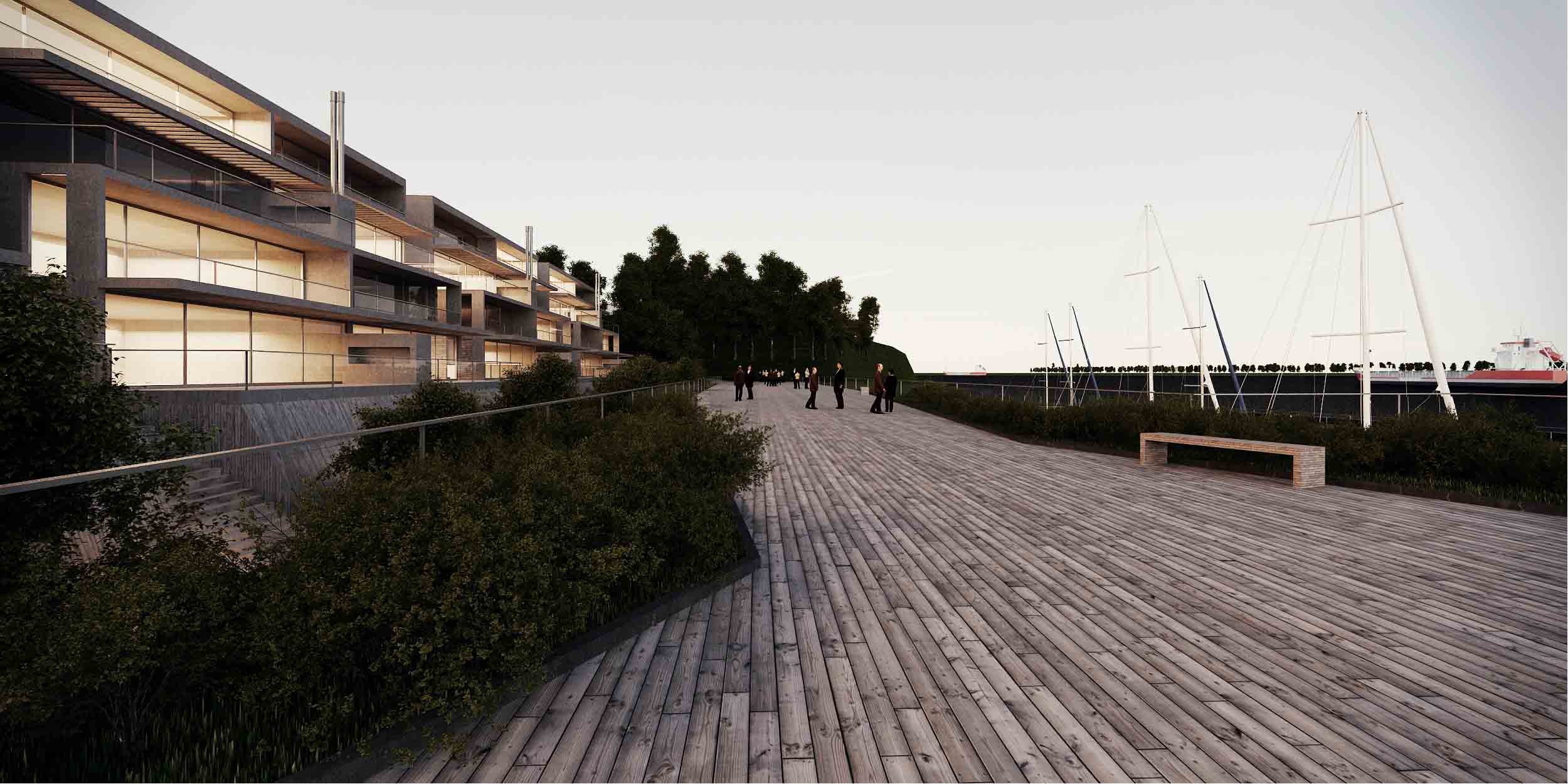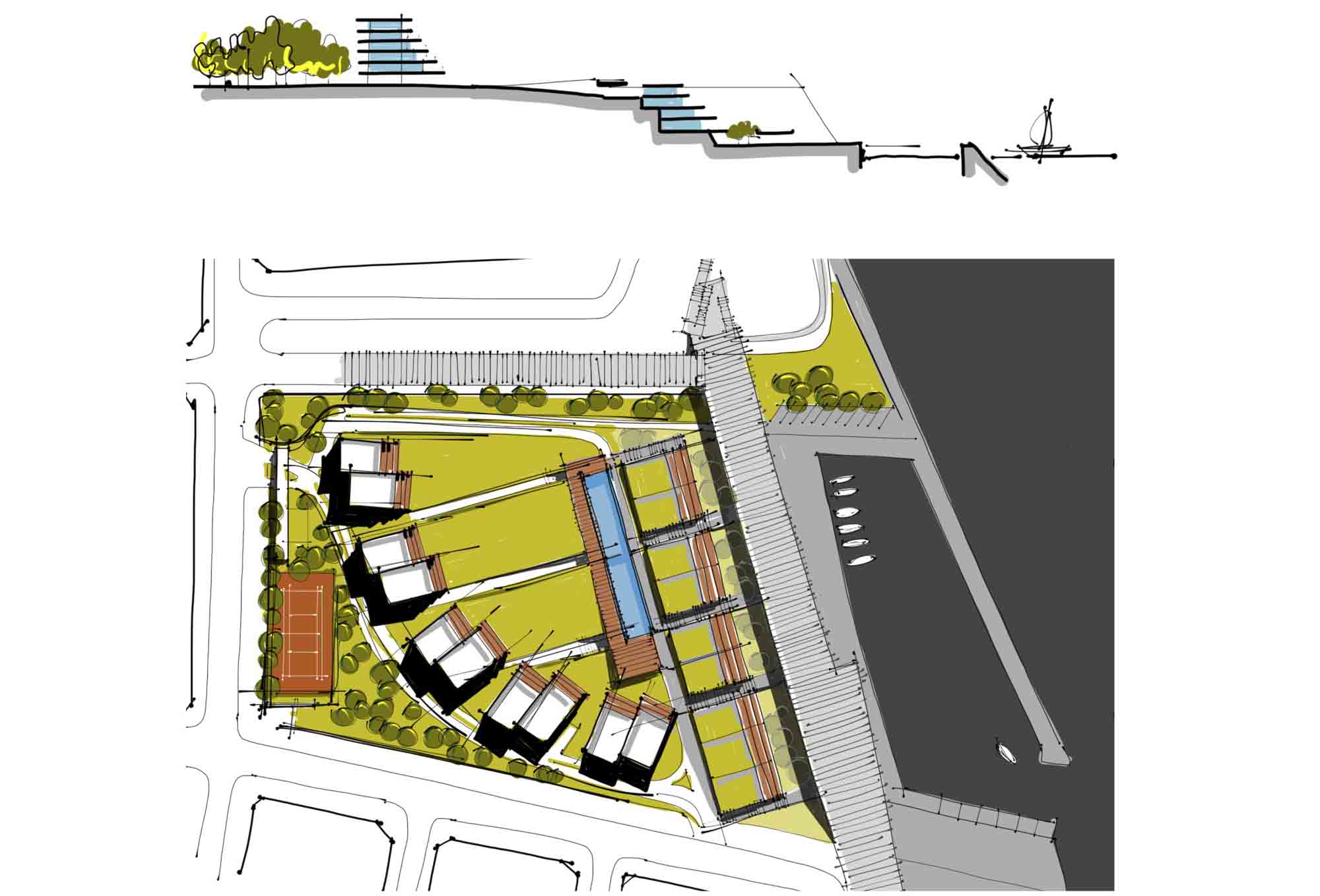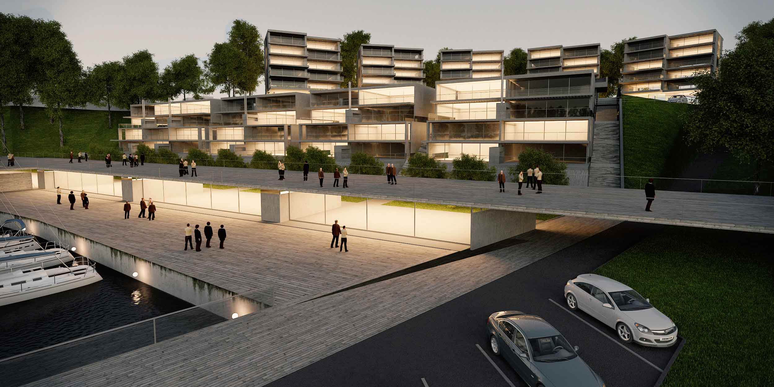Así, el proyecto resuelve disponer la masa edificada garantizando las visuales al rio de todas las unidades de viviendas generando distintas tipologías mediante el aprovechamiento de la diferencia de cotas de la barranca. El resultado es un conjunto que combina cuerpos elevados de perímetro aislado y de planta baja libre y cinco pisos altos sobre el nivel de calle con una tira aterrazada, recostada sobre la barranca que consolida el frente costero junto a un sector de amarradero, guardería náutica y demás usos comunes del conjunto, cuya cubierta se define como un paseo peatonal para garantizar la continuidad del uso público de la rivera.