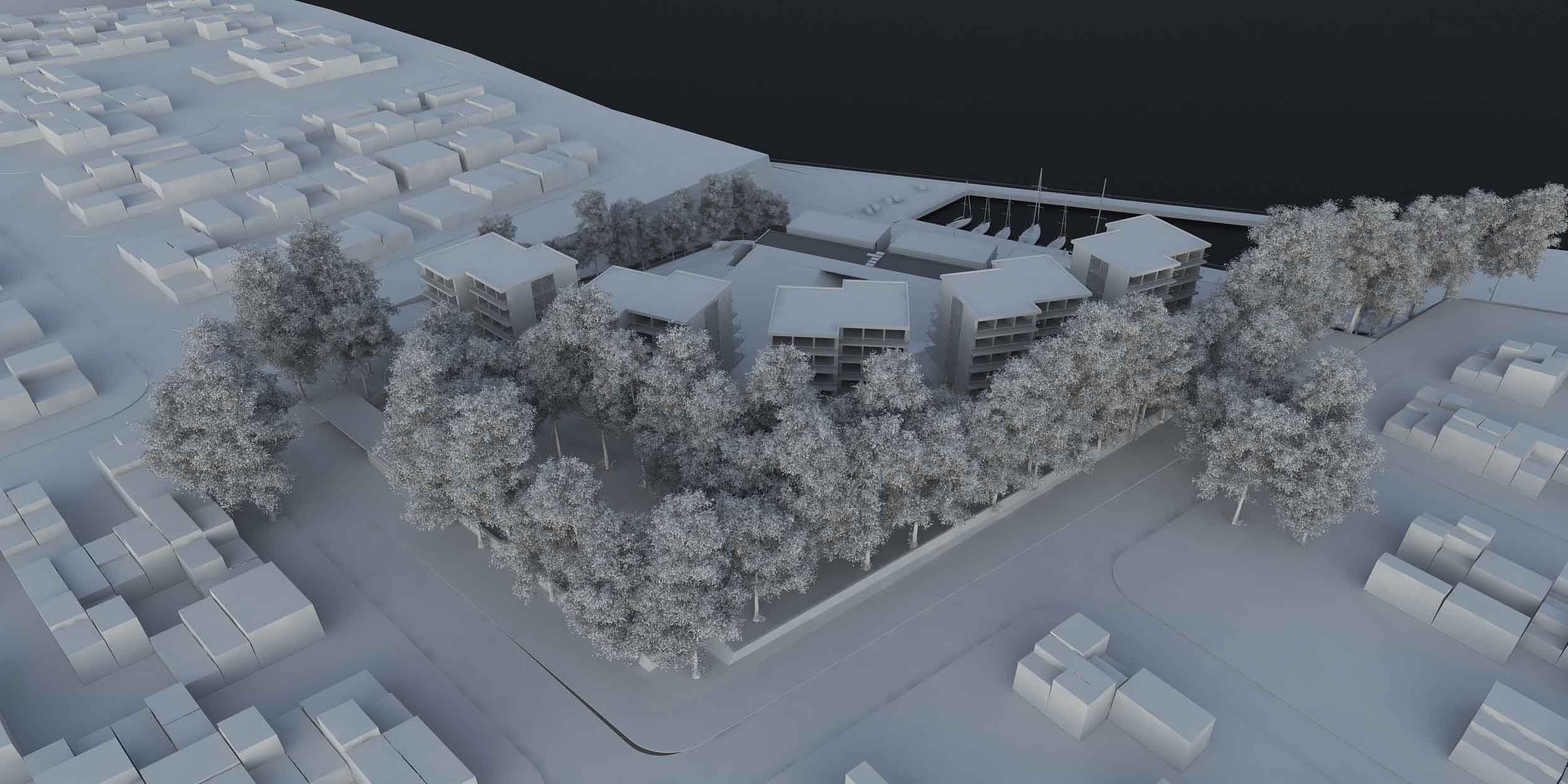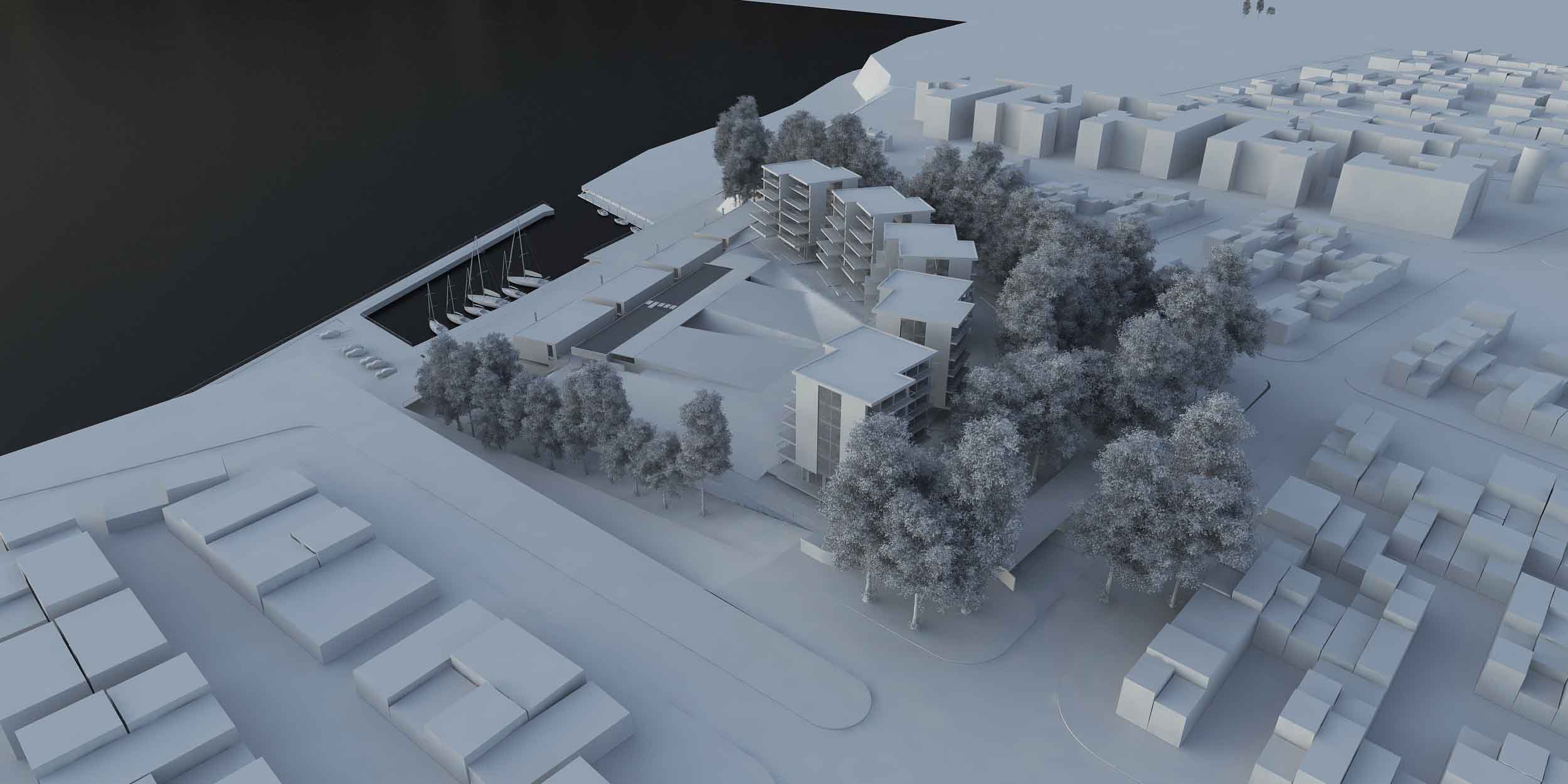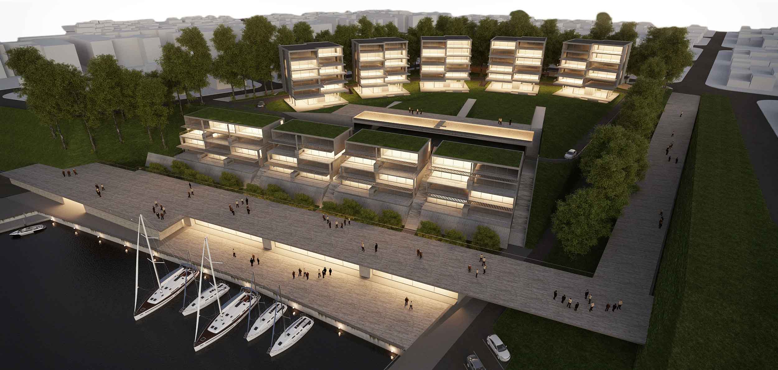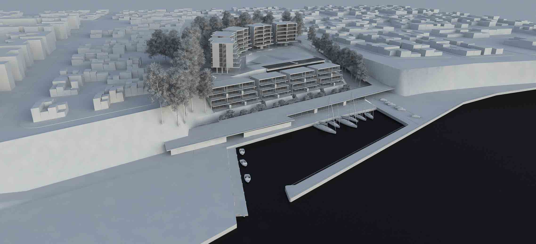 Así, el proyecto resuelve disponer la masa edificada garantizando las visuales al rio de todas las unidades de viviendas generando distintas tipologías mediante el aprovechamiento de la diferencia de cotas de la barranca. El resultado es un conjunto que combina cuerpos elevados de perímetro aislado y de planta baja libre y cinco pisos altos sobre el nivel de calle con una tira aterrazada, recostada sobre la barranca que consolida el frente costero junto a un sector de amarradero, guardería náutica y demás usos comunes del conjunto, cuya cubierta se define como un paseo peatonal para garantizar la continuidad del uso público de la rivera.