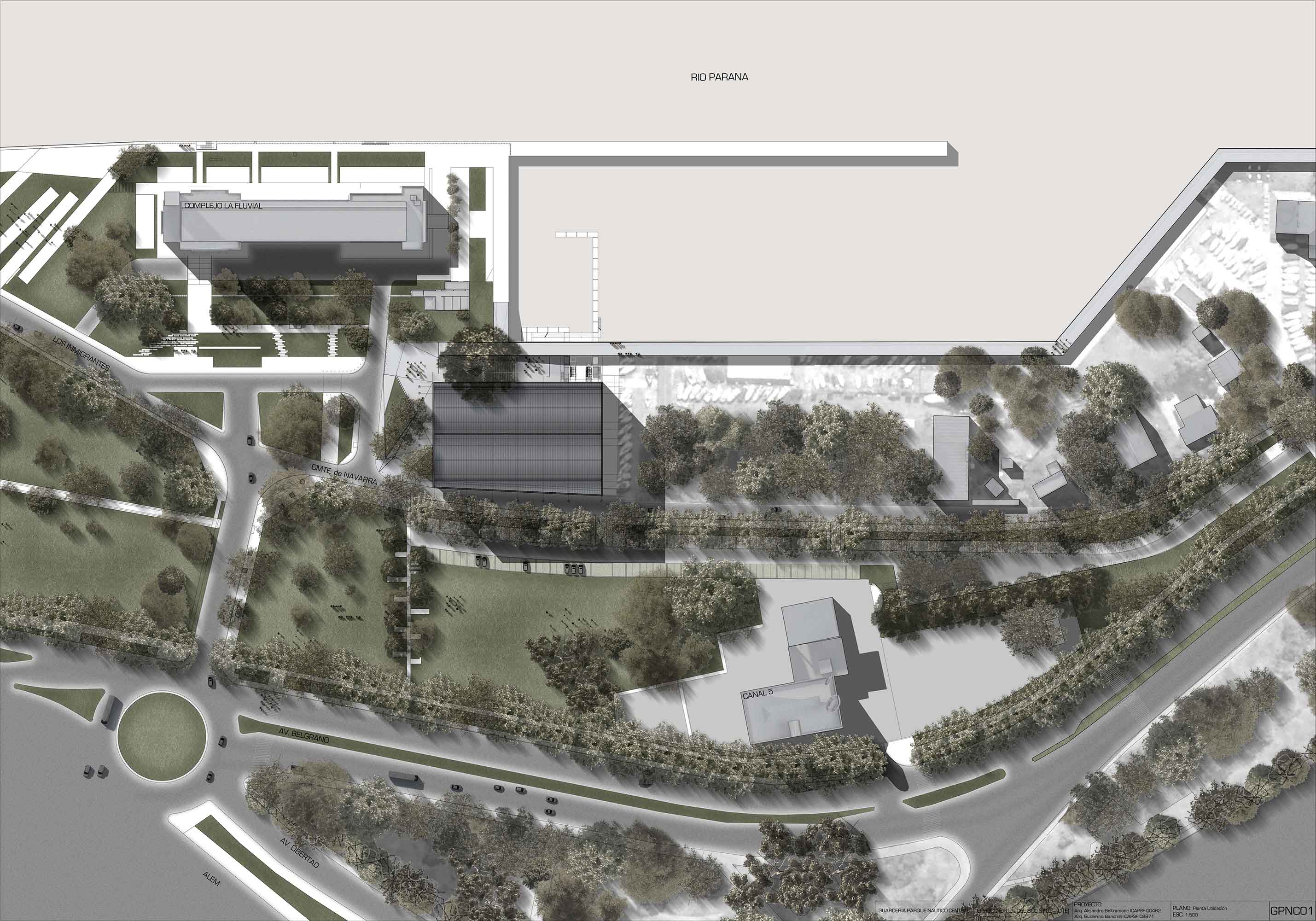 El proyecto se basó en la relación dialéctica entre lo natural- el río y el parque- y lo artificial- el muelle y la guardería-. Este diálogo intrínseco entre lugar de emplazamiento y programa arquitectónico se resolvió con la premisa de transformar el área con una intervención que ponga en valor las preexistencias del propio sitio con la incorporación de un nuevo edificio que interactúe con la escala del parque a través de respetar la altura de sus árboles que lo rodean, que realce el valor de su frente al Paraná con la inclusión del nuevo Paseo Público propuesto por la Municipalidad dentro de la ex Dársena de cabotaje, y que genere un nuevo “frente de vida” con relación al uso público a nivel de la calle a través de la mayor presencia de locales comerciales a la ya definida tira sobre la arteria Comunidad Foral de Navarra.