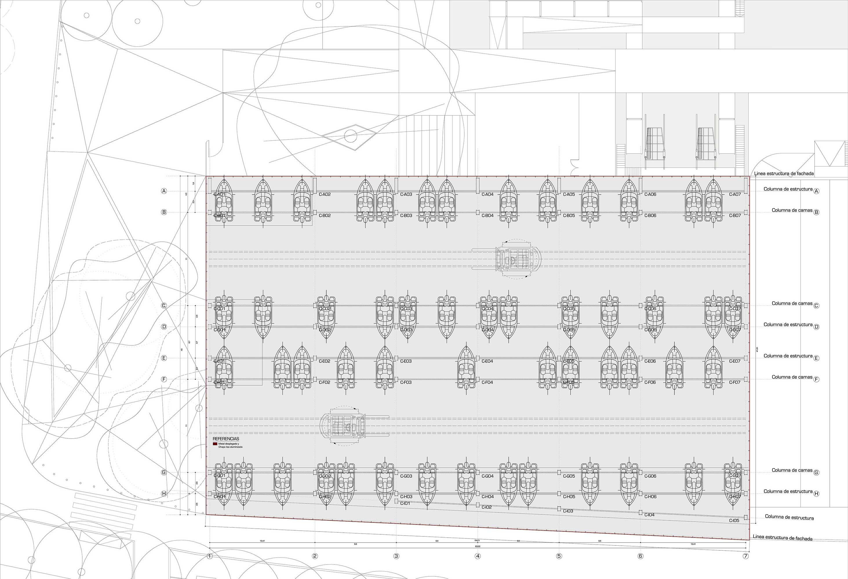 Intentamos reinterpretar el sistema estructural tradicional heredado de las antiguas guarderías náuticas que se basaba, en realidad, en disponer de dos sistemas: uno para sostener la cubierta de la nave y otro para soportar el peso de las embarcaciones náuticas con modulación fija.