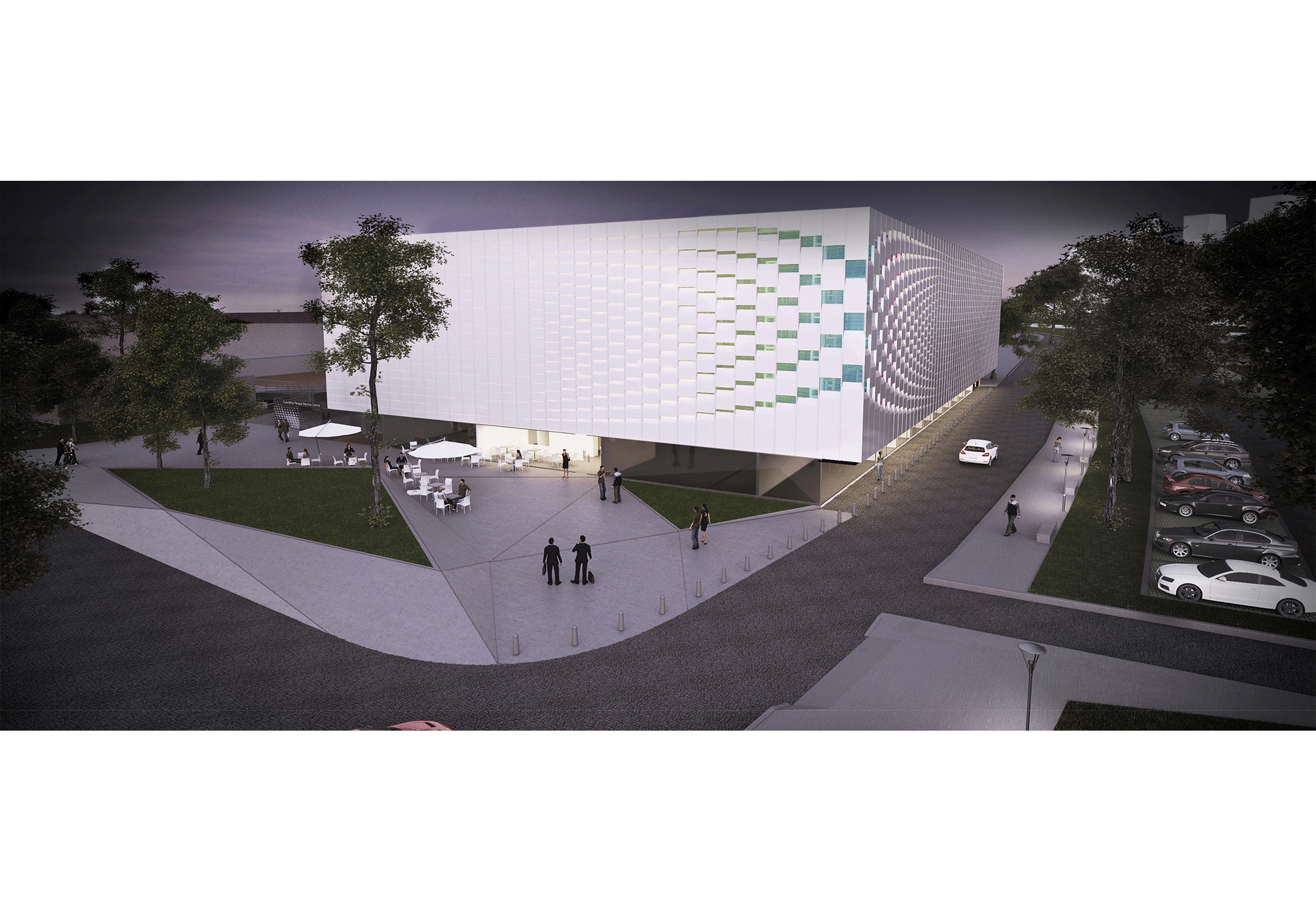Respecto a la conformación de la envolvente la estrategia fue utilizar el recurso material propuesto en el pliego [chapa aluminizada] pero de manera que otorgara un efecto con un mayor grado de compromiso arquitectónico y visual respecto al emplazamiento del edificio tanto en su relación con el entorno urbano como en su relación con el entorno ribereño. Para ello se diseñó un sistema kinético gráfico en su composición de matriz [secuenciado verticalmente según el ancho útil de la chapa y la construcción de el marco estructural de la misma con Caño 150/50/2] conformando una suerte de regularidad y ritmo en el sentido vertical. La segunda decisión fue la de trabajar con la conformación de dos relieves, el primero enrazado sobre la línea de la envolvente donde se utiliza piezas de diferentes tamaños de “bandejas” materializadas con chapa lisa aluminizada y el segundo recedido el espesor de la estructura [150 mm] donde se propone bandejas de metal desplegado pesado pintadas en un gradiente de colores el cual a su vez, otorga ventilación e iluminación natural al interior de la nave con efectos semejantes a paso de los rayos del sol entre las copas de los árboles del entorno.