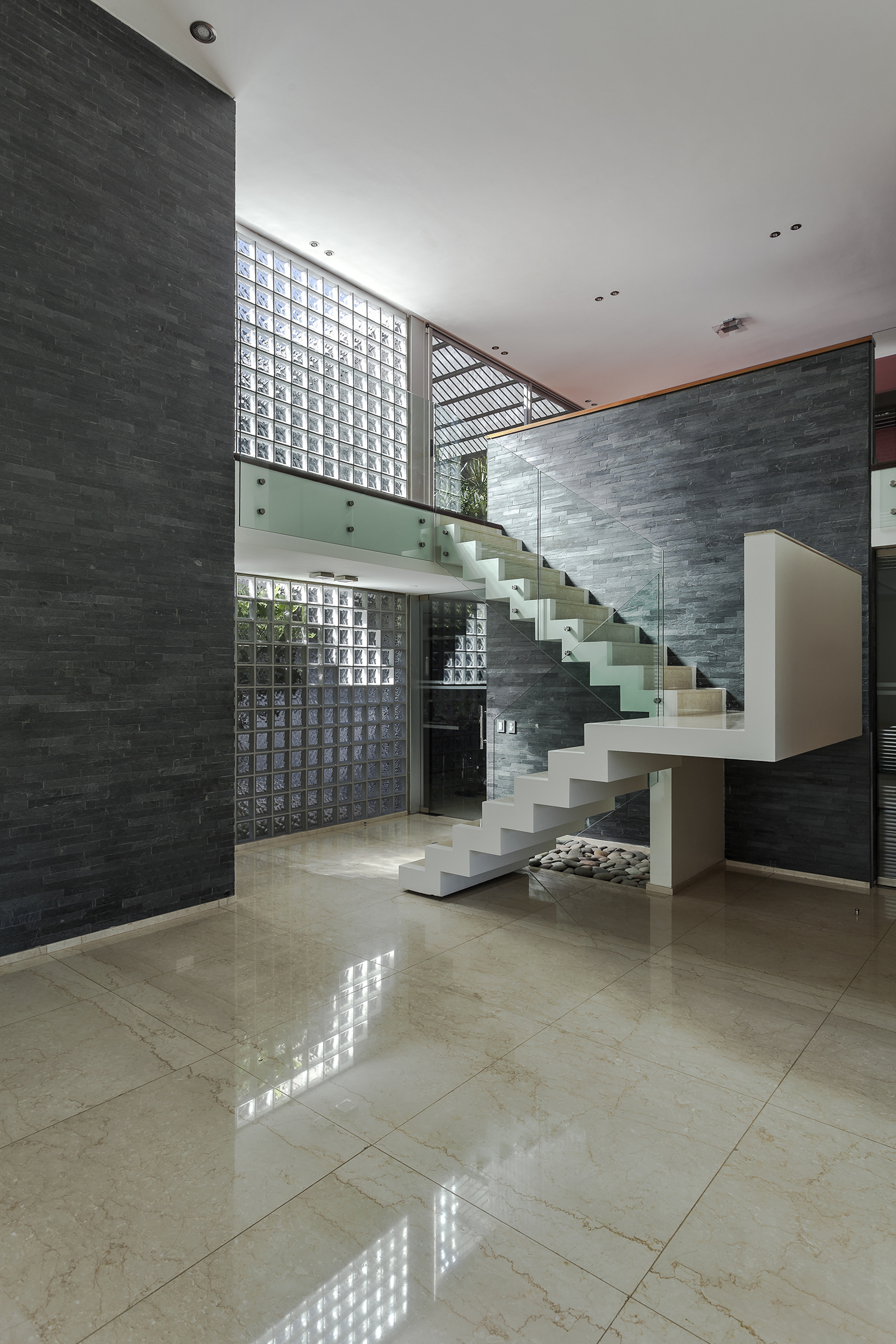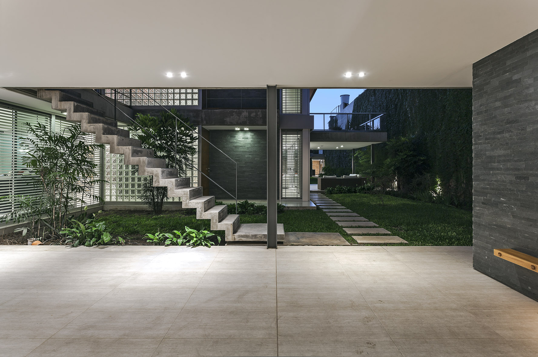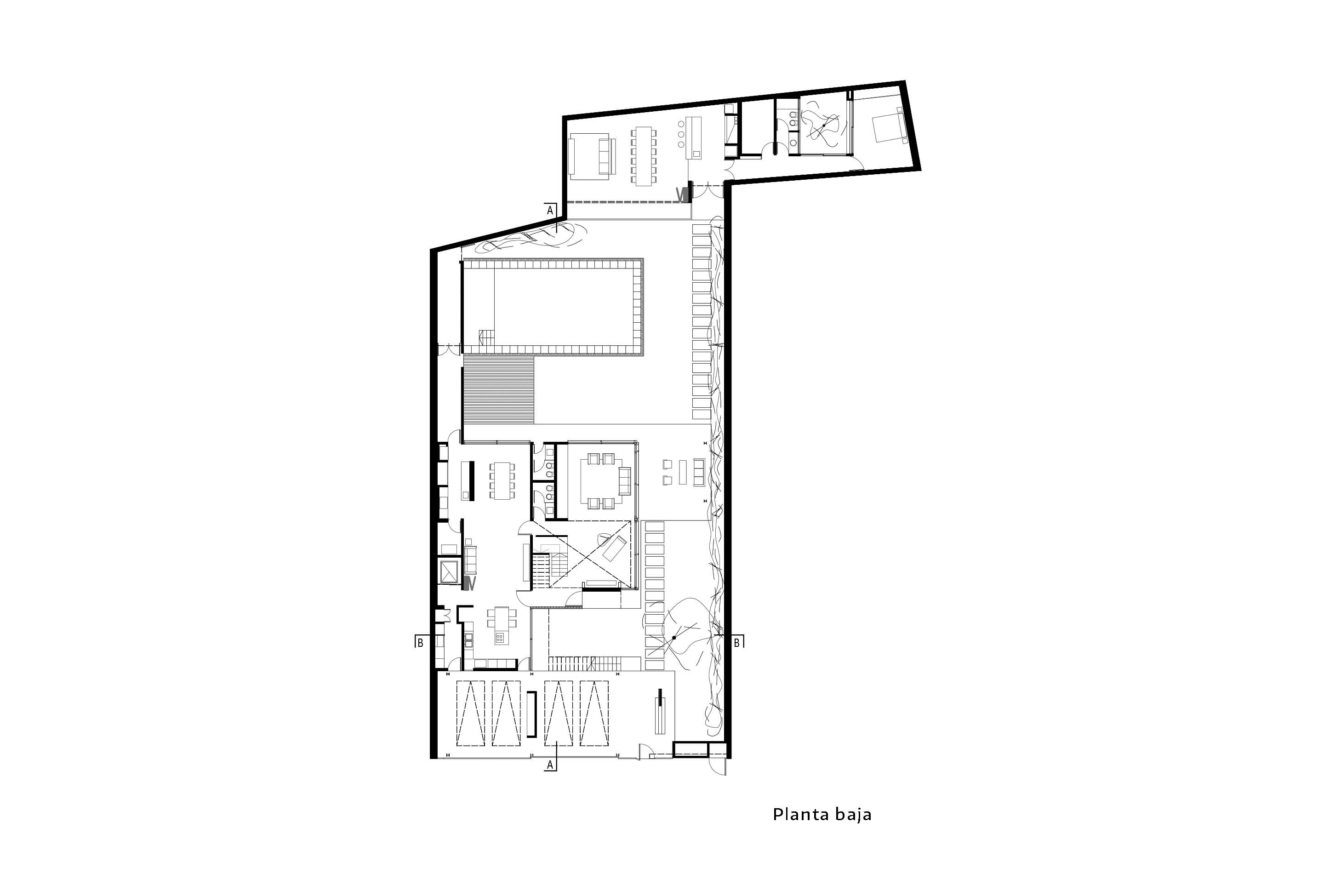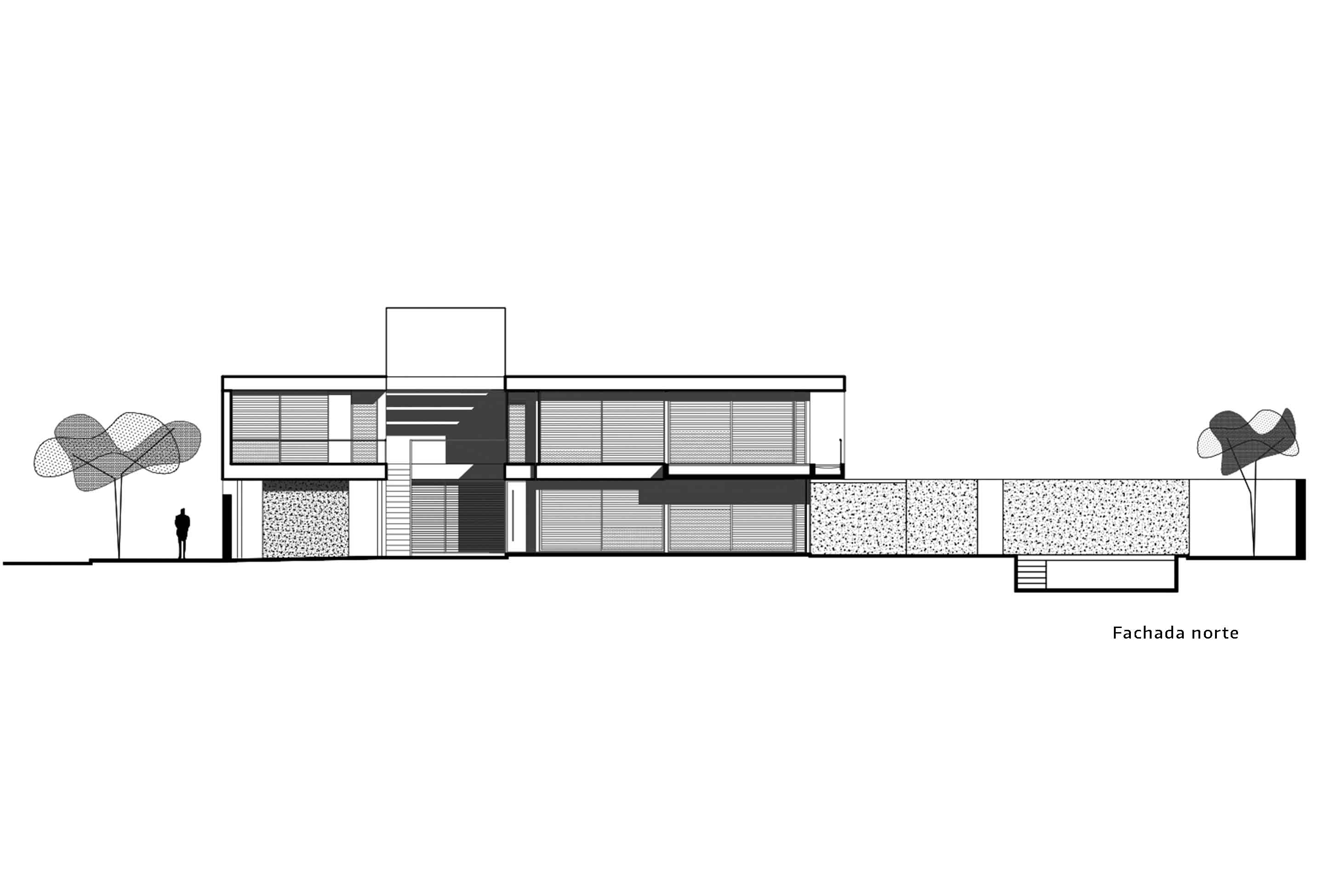 Aprovechando los 19 metros de frente de la parcela, la casa se recuesta sobre la medianera sur para entregarse al norte; y mediante una sucesión de espacios geométricos abiertos libera el resto del perímetro de sus fachadas en búsqueda de la pretendida autonomía entre las partes; y a su vez consolida un ámbito de privacidad alejado del límite con la calle y con mayor relación al remanso del centro de manzana.