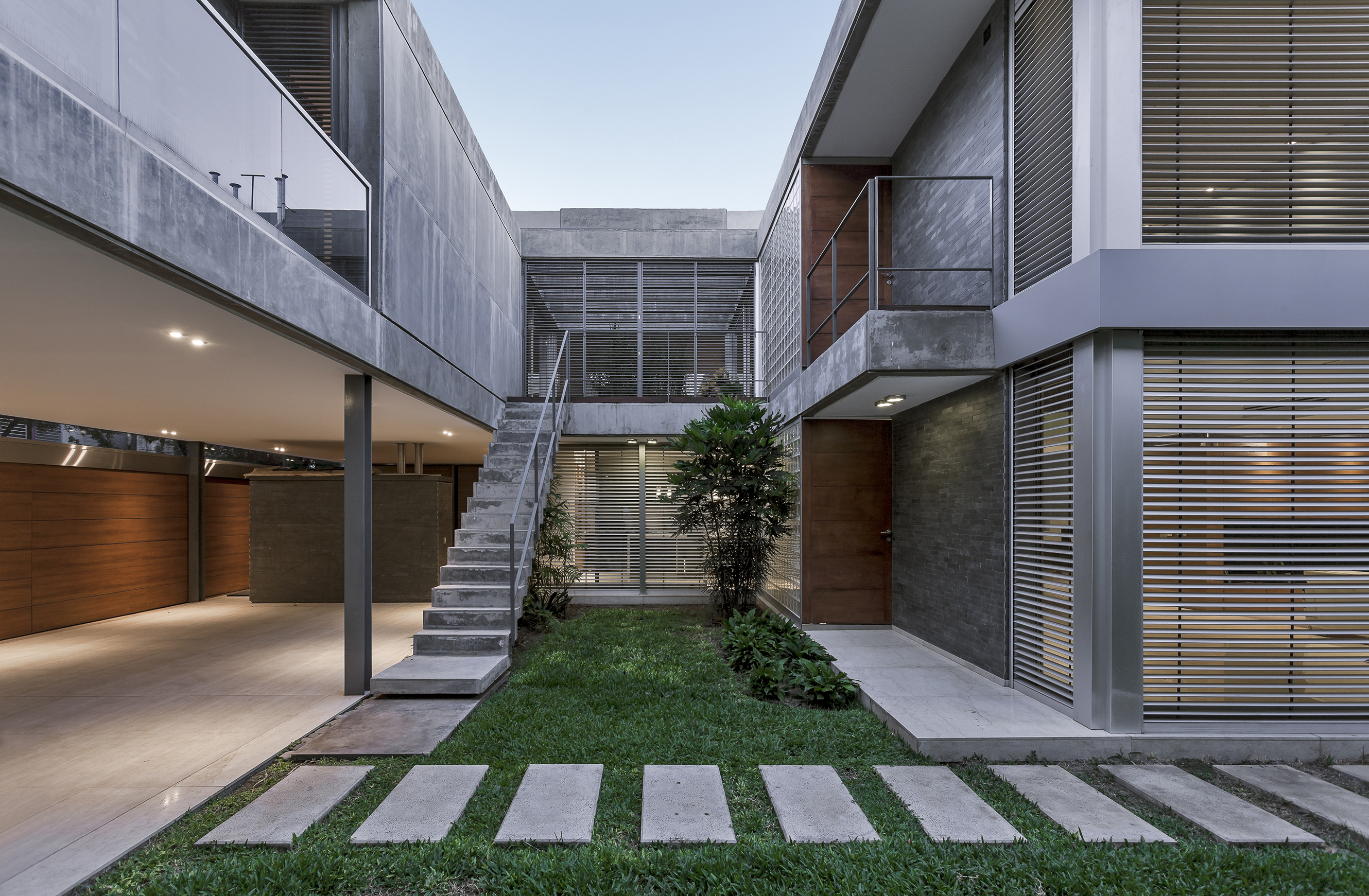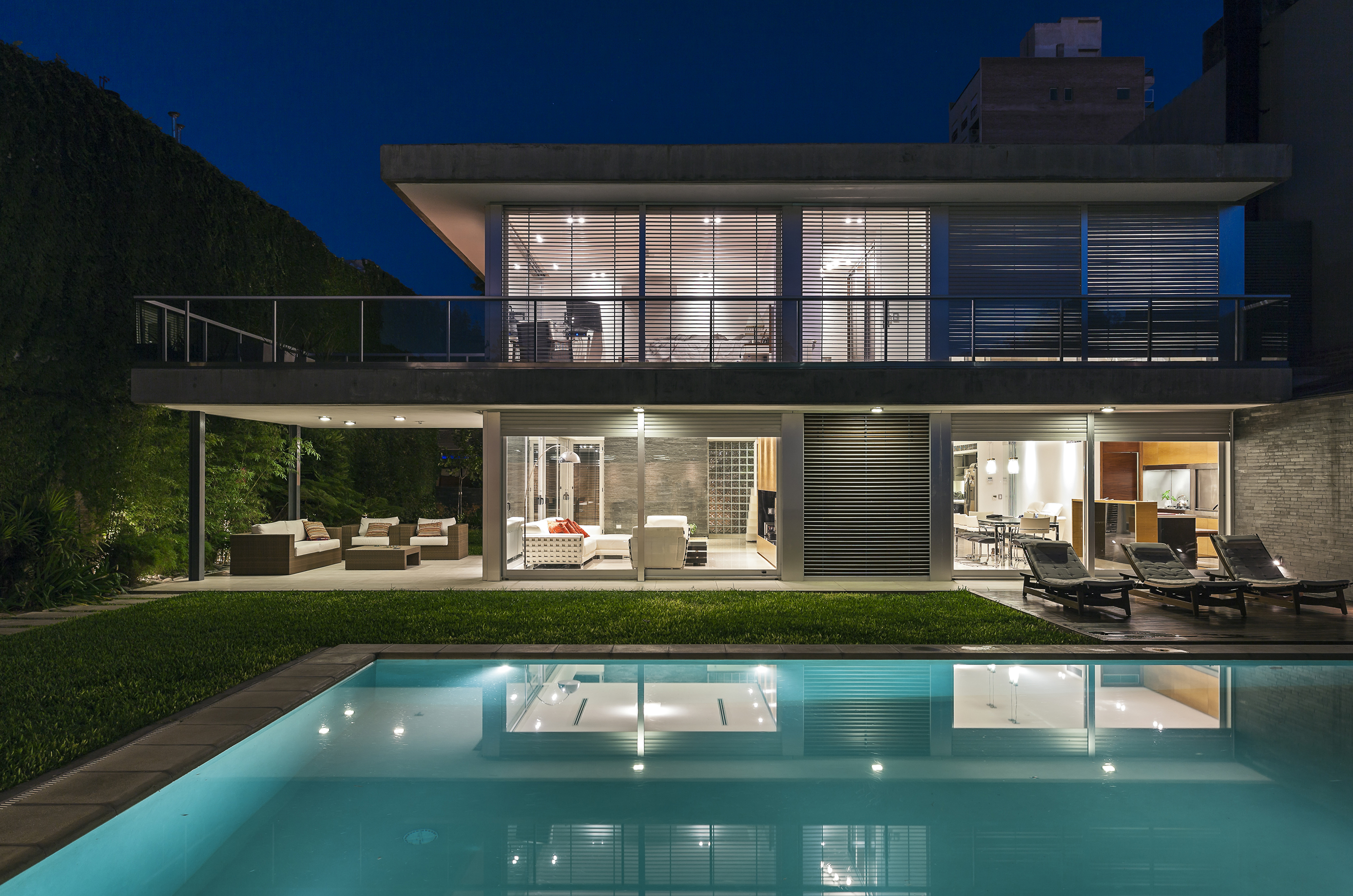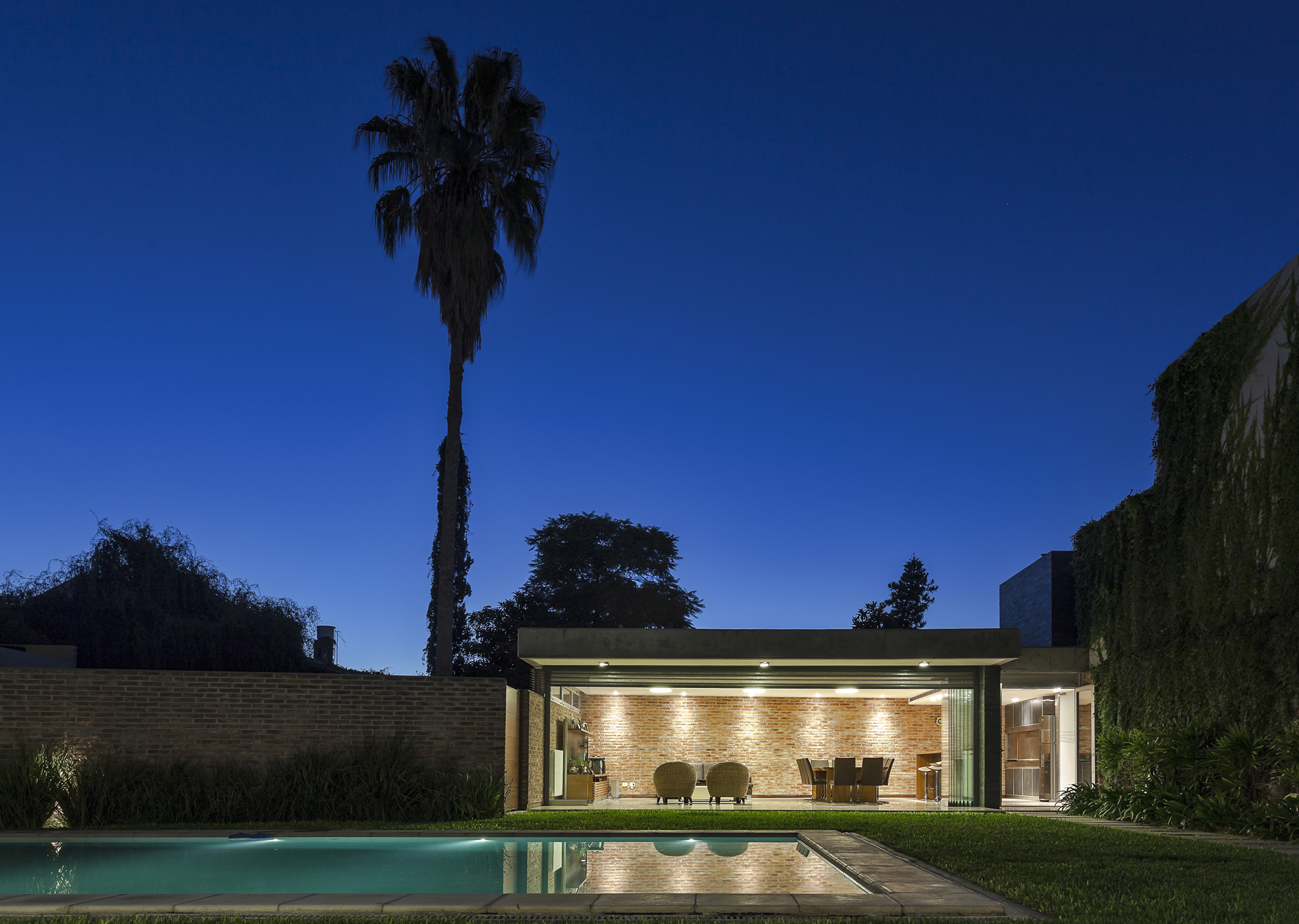 Este ensayo de proyectar con patios y terrazas para permitir identificar las partes del programa sin perder la idea de conjunto se acentúa por la transparencia de la obra, por lograr que la mirada del espectador no se detenga en ella sino que la atraviese, llevando esa mirada más allá del límite físico definido por la propia obra y así fundir el proyecto de arquitectura con el paisaje del jardín, haciendo de la intervención una operación unívoca entre exterior e interior. Por consiguiente, se pretende interpretar y conectarse con la escala residencial del barrio, careciendo de sentido fuera del entorno donde se inserta. La transparencia así entendida no solo se opone a la opacidad y la impenetrabilidad, sino también al exceso de forma y a la retórica del significado; para lo cual optamos por reforzar la austeridad del discurso disminuyendo al máximo las secciones de los elementos estructurales. A través de un sistema de columnas metálicas de perfiles normalizados U integradas al sistema de cerramiento de carpintería de aluminio y losas de hormigón armado con vigas invertidas que contienen los cajones para las cortinas de enrollar se resuelve toda la piel de la casa cuya adjetivación va asociada al compás del movimiento de apertura de su propia epidermis.
