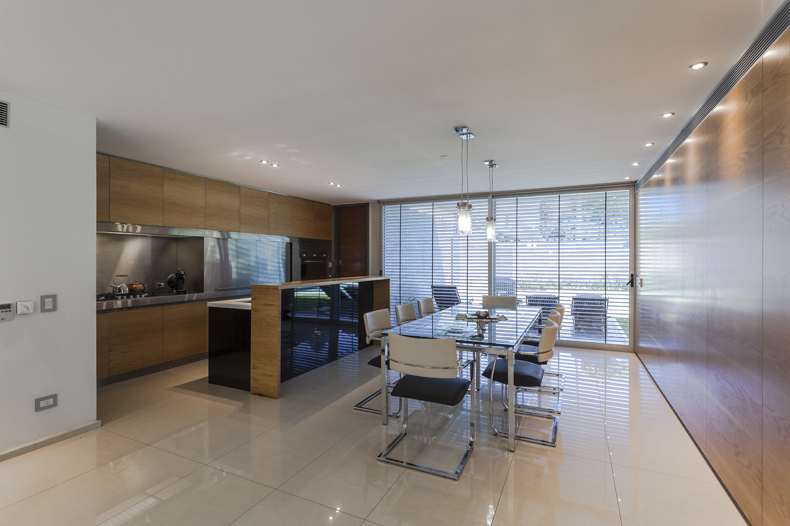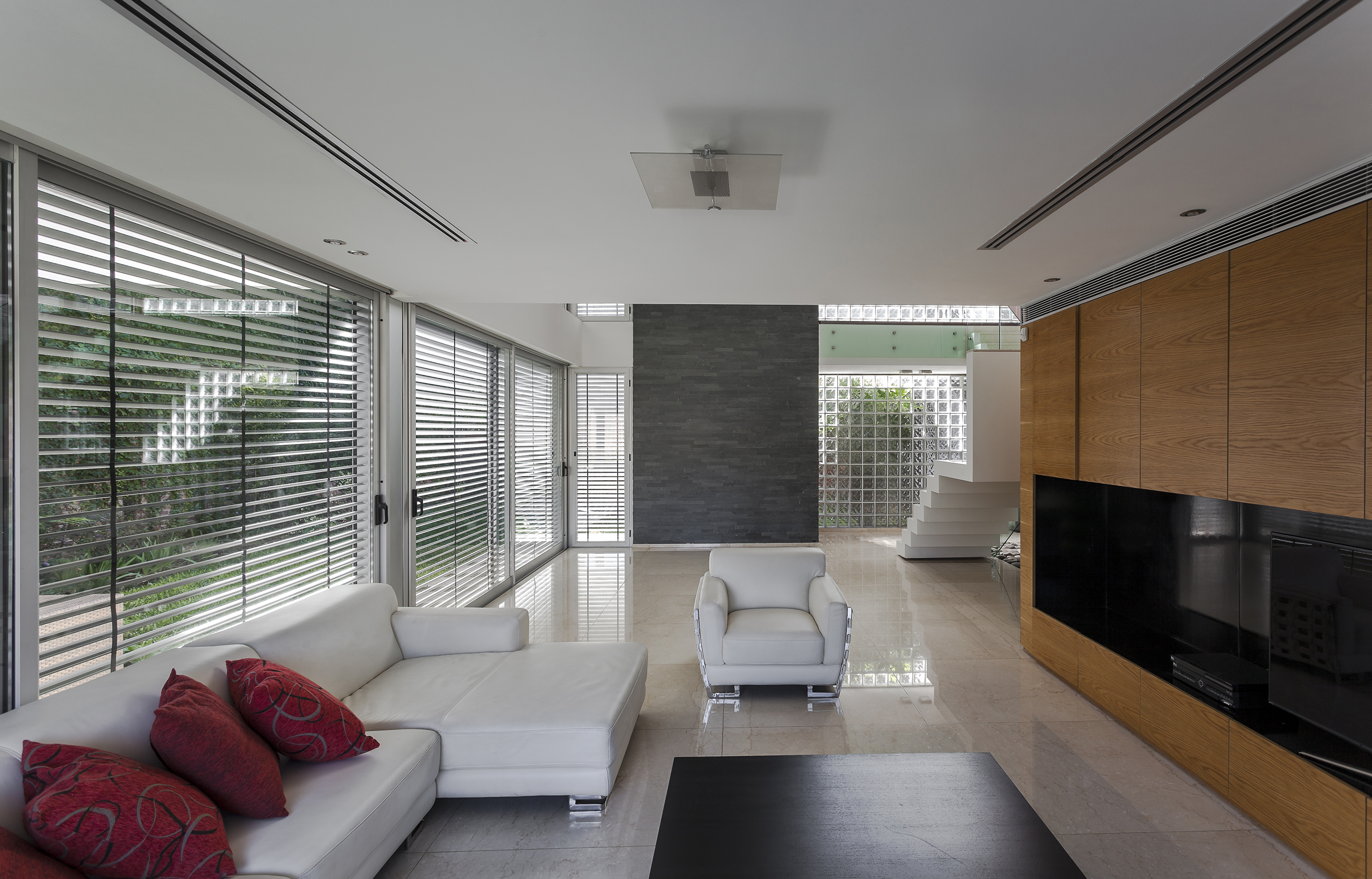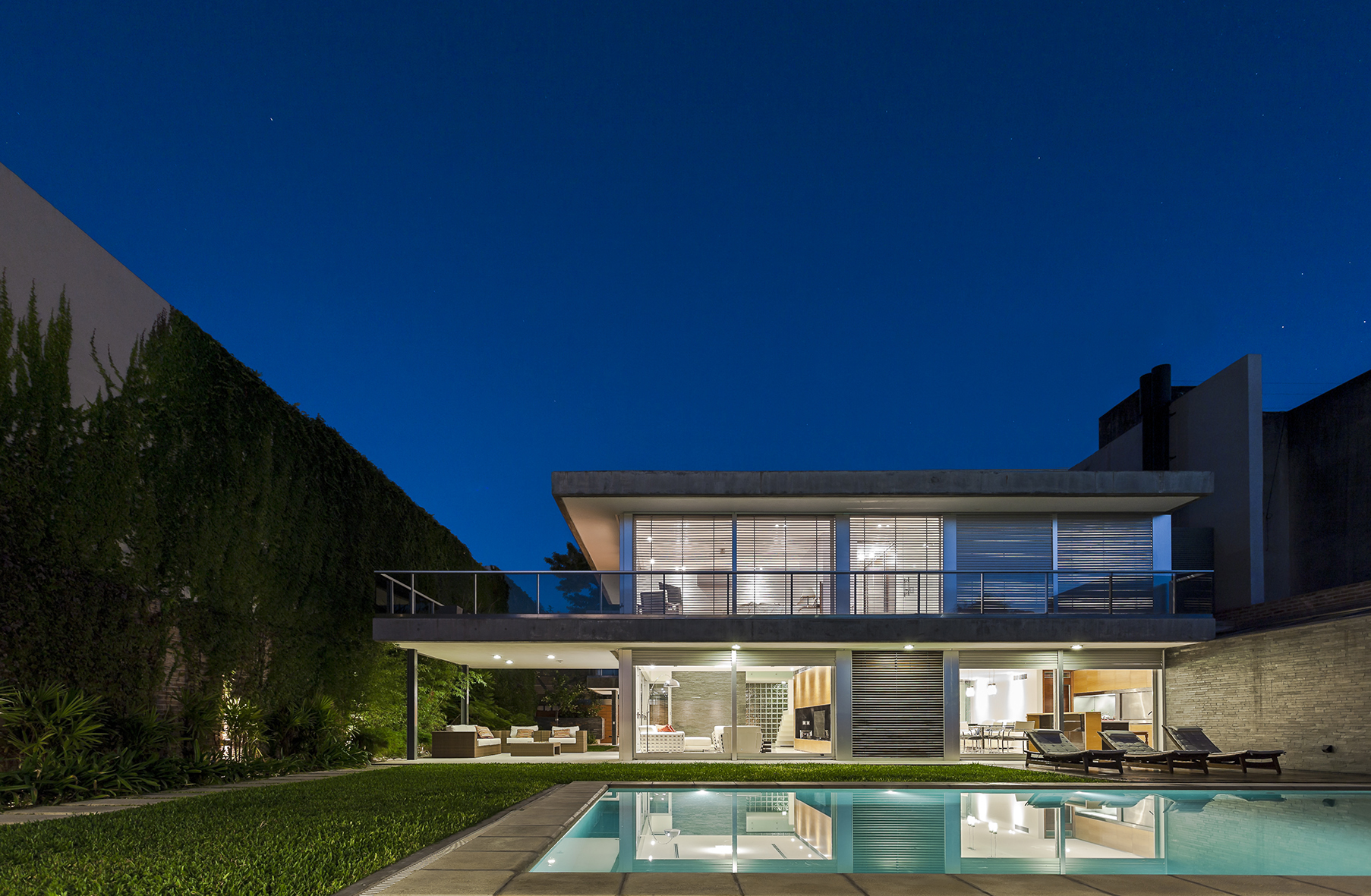 Este ensayo de proyectar con patios y terrazas para permitir identificar las partes del programa sin perder la idea de conjunto se acentúa por la transparencia de la obra, por lograr que la mirada del espectador no se detenga en ella sino que la atraviese, llevando esa mirada más allá del límite físico definido por la propia obra y así fundir el proyecto de arquitectura con el paisaje del jardín, haciendo de la intervención una operación unívoca entre exterior e interior. Por consiguiente, se pretende interpretar y conectarse con la escala residencial del barrio, careciendo de sentido fuera del entorno donde se inserta. La transparencia así entendida no solo se opone a la opacidad y la impenetrabilidad, sino también al exceso de forma y a la retórica del significado; para lo cual optamos por reforzar la austeridad del discurso disminuyendo al máximo las secciones de los elementos estructurales. A través de un sistema de columnas metálicas de perfiles normalizados U integradas al sistema de cerramiento de carpintería de aluminio y losas de hormigón armado con vigas invertidas que contienen los cajones para las cortinas de enrollar se resuelve toda la piel de la casa cuya adjetivación va asociada al compás del movimiento de apertura de su propia epidermis.